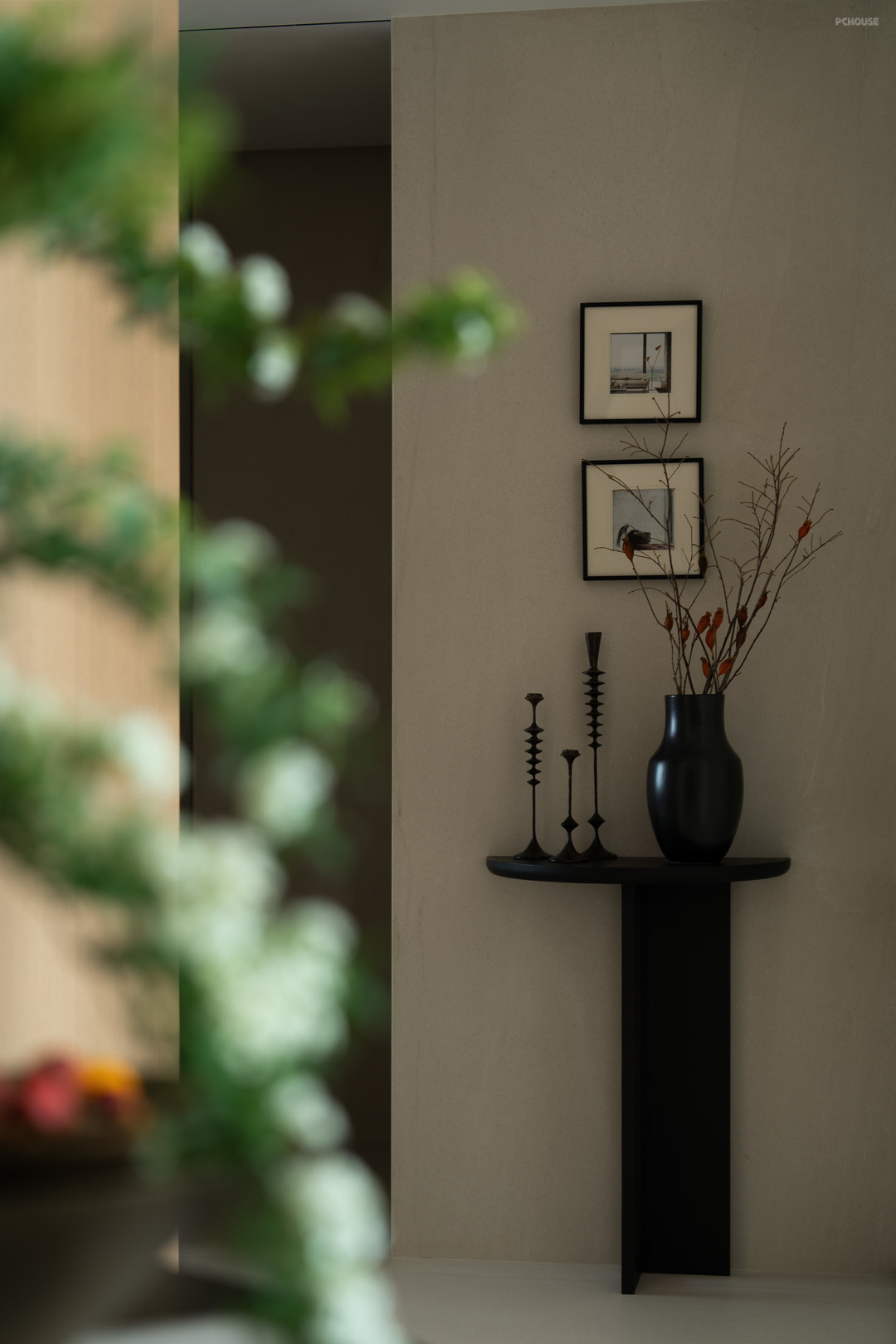 诉说自然的之美,生命之美。这是在室内与室外之间的一个过渡空间,布局时要兼具实用性、美观性.这张雅致又有厚重感桌子既可以作为玄关台,又可以成为三口之家的餐桌。