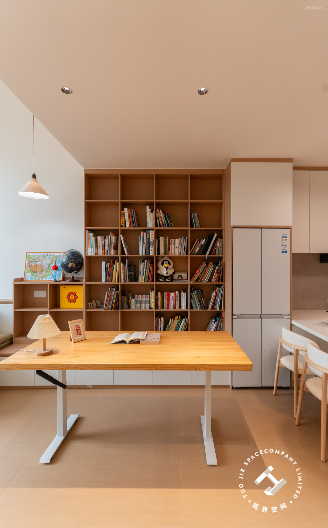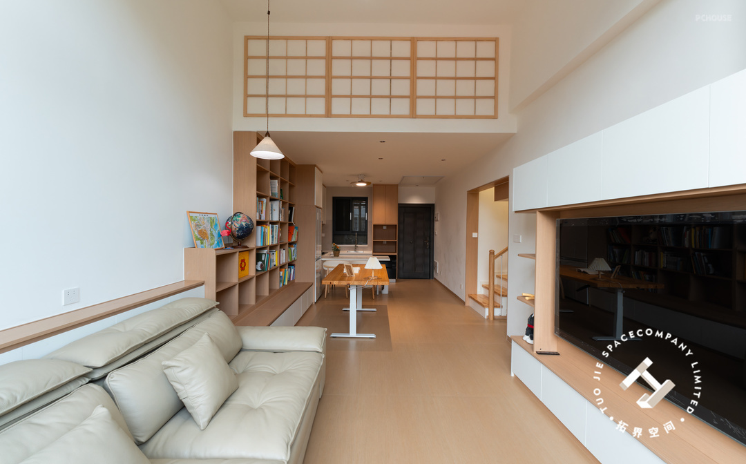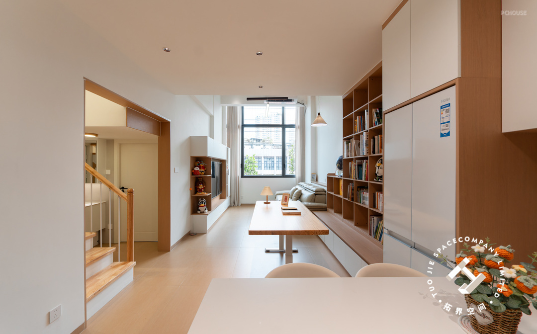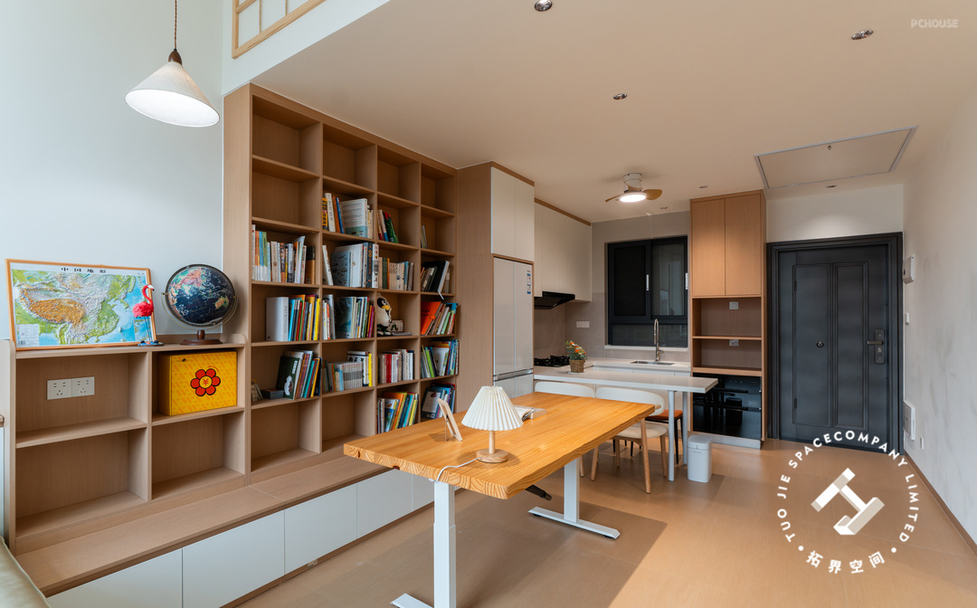 2、餐厨和客厅之间打造开放式书房+整墙书架;
