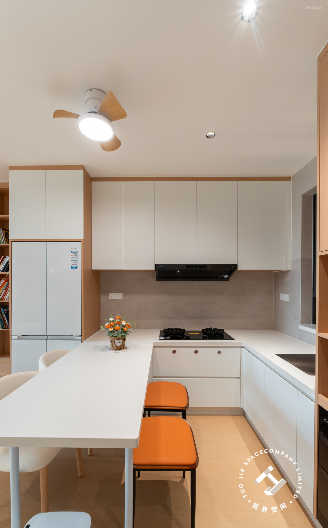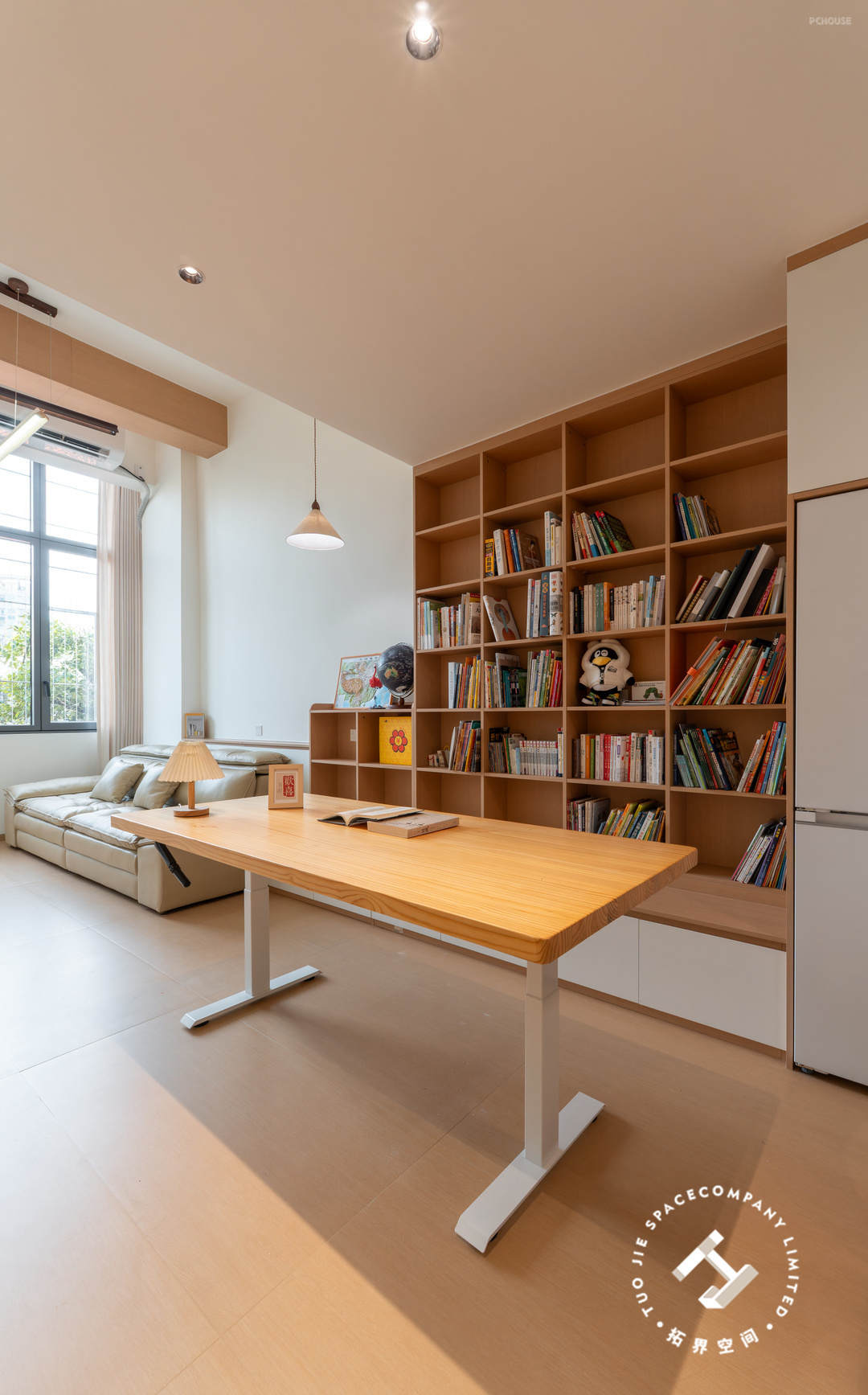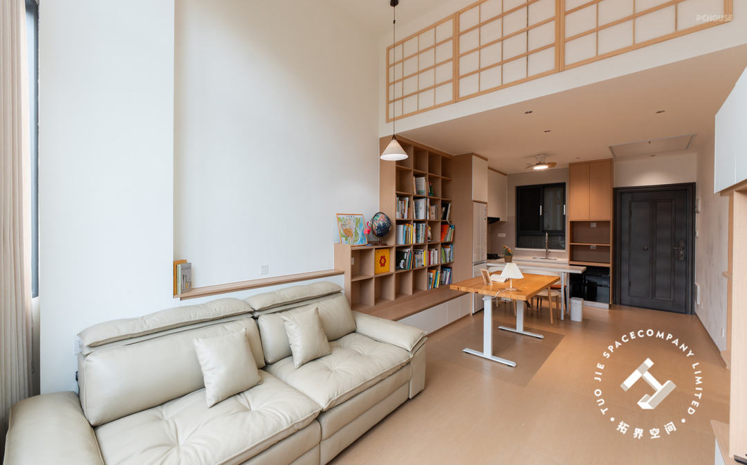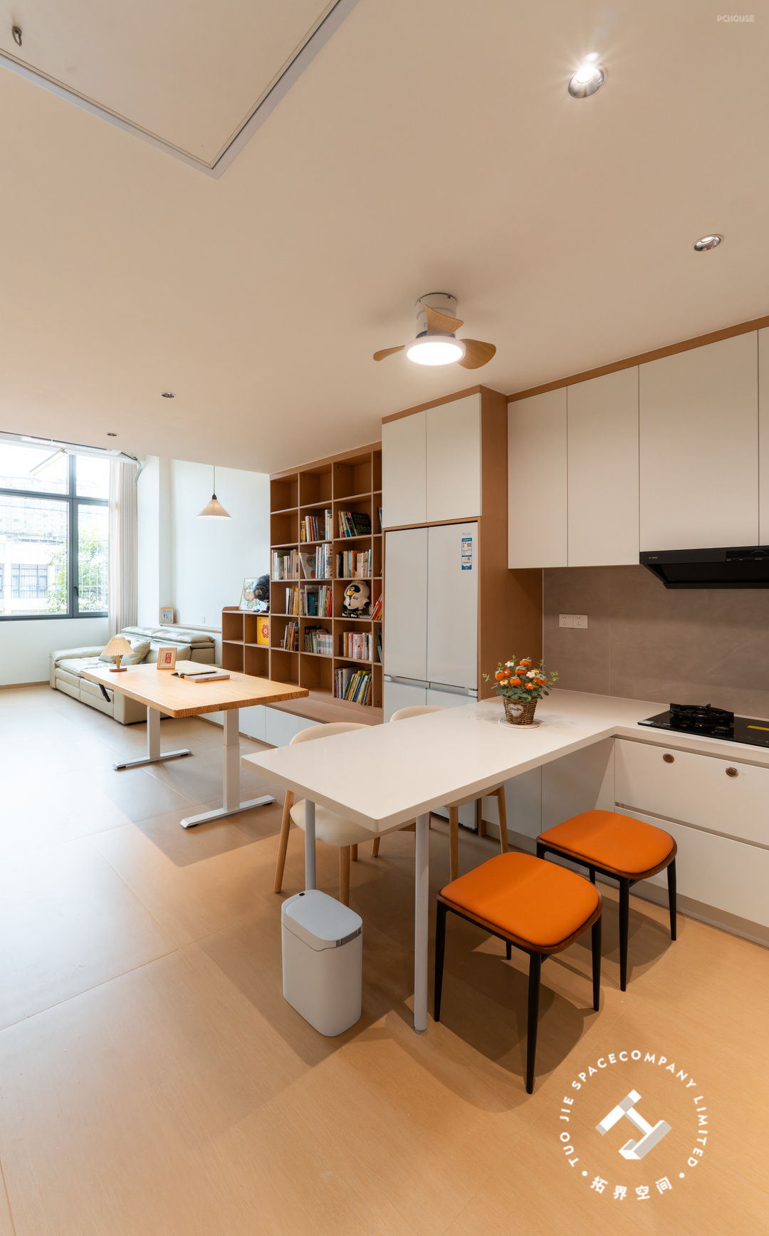 2、餐厨和客厅之间打造开放式书房+整墙书架;