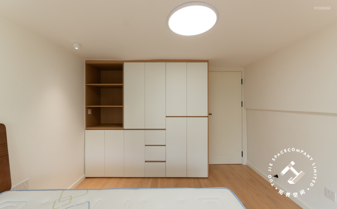 次卧延续了整体日式原木风的温馨质感,浅木色地板铺就,带来自然柔和的触感;侧边定制大衣柜,留出开放格,避免了整柜带来的压迫感。