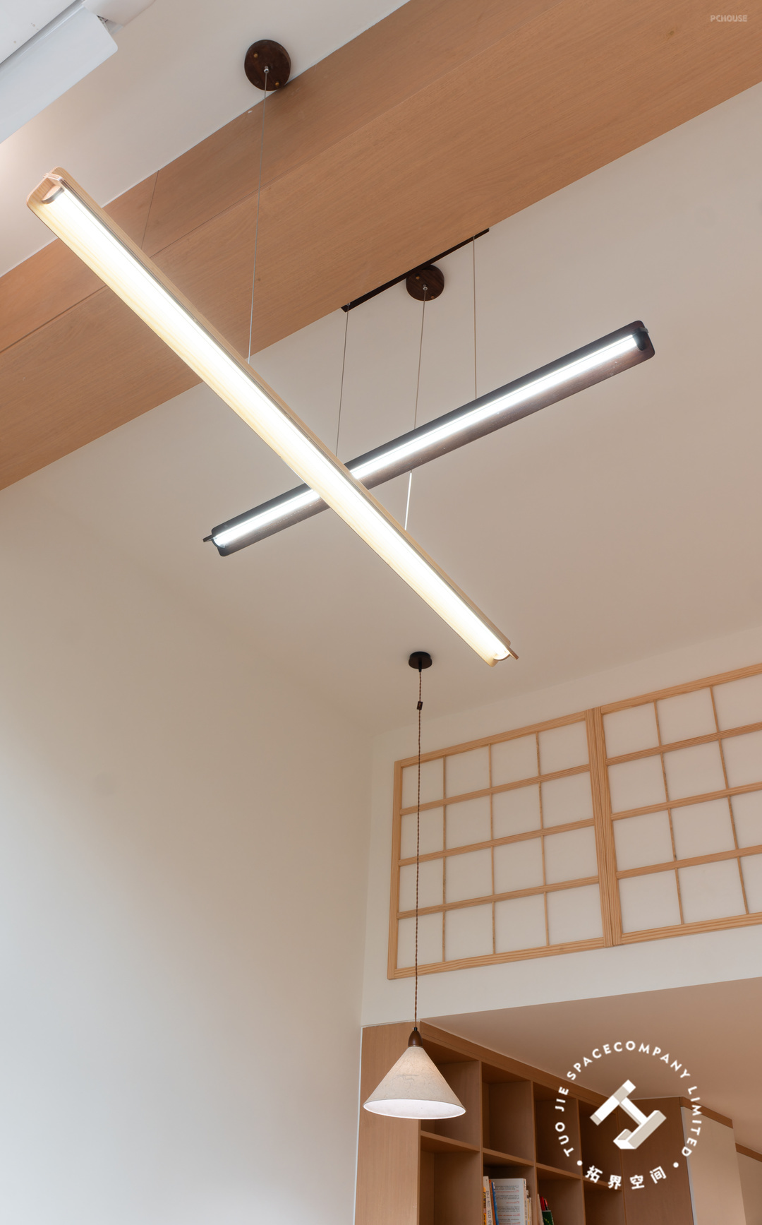 客厅坐拥挑高优势,大面积窗户引入充沛光线,通透敞朗的空间感扑面而来;交错悬挂的长条灯具,以其独特的几何造型,为空间注入了别样的设计感与格调。