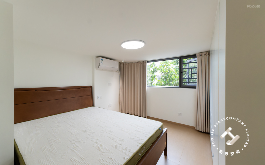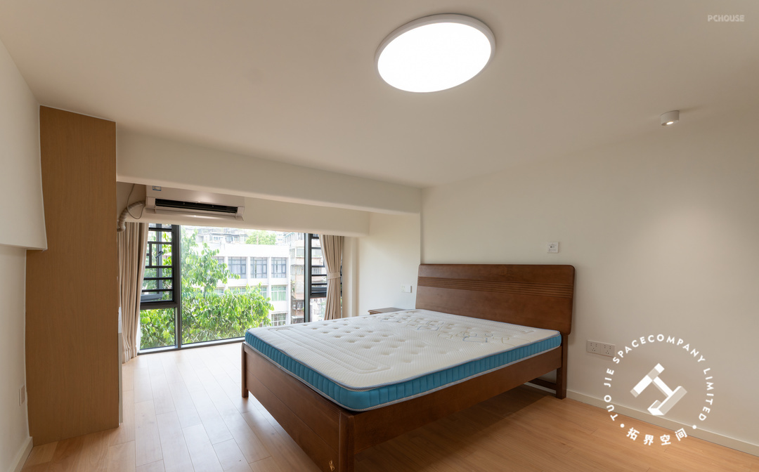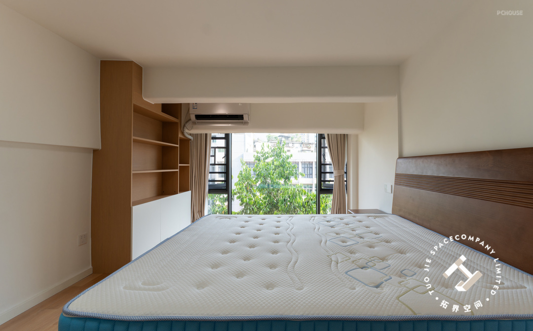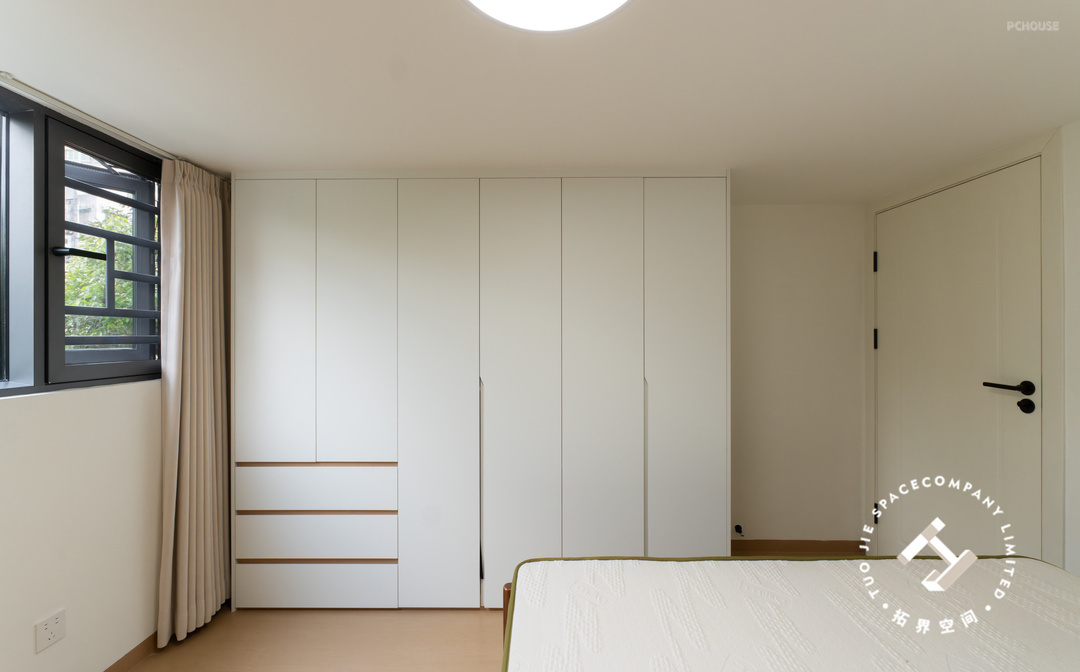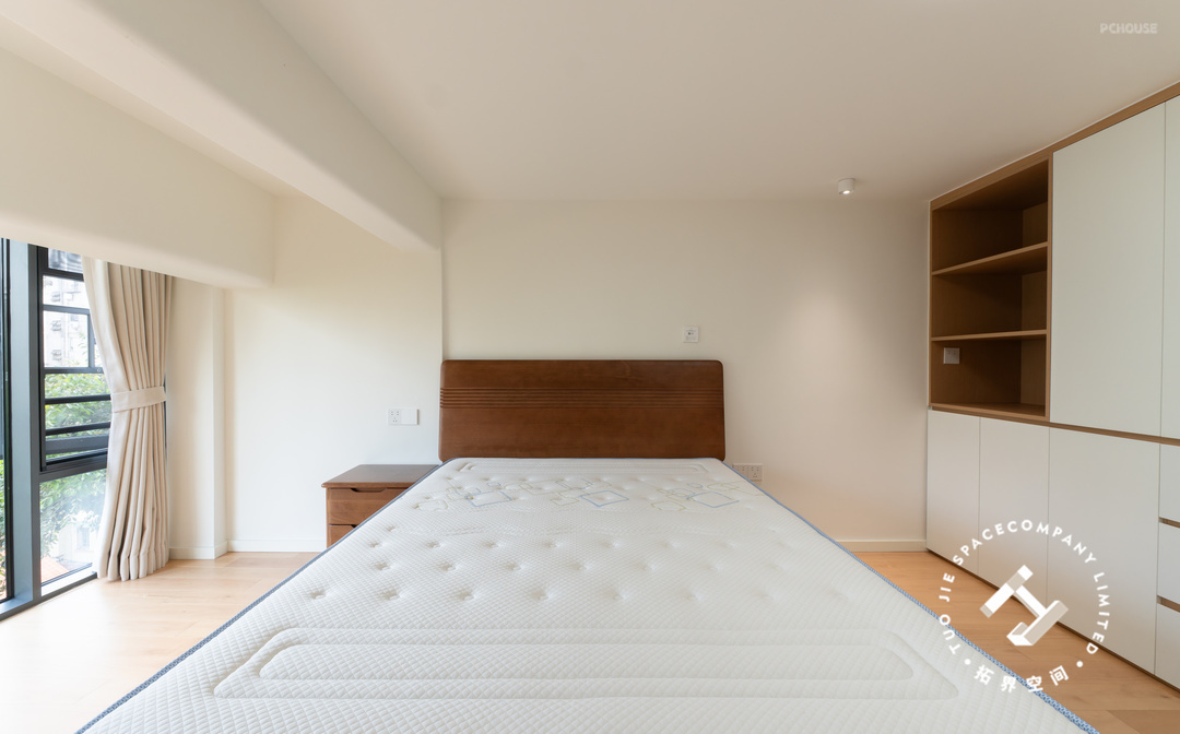 主卧整体布局简洁,色调柔和,给人一种舒适静谧的睡眠氛围,床尾定制满墙大衣柜,提供了充足的收纳空间。