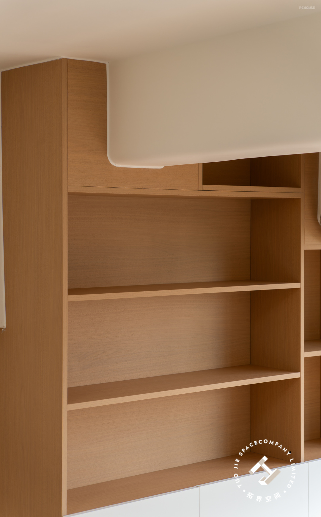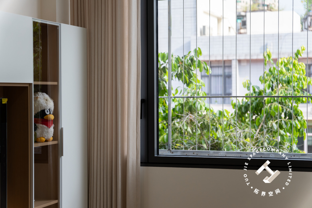 该房靠近落地窗的位置有两根超低的房梁,巧妙使用弧形设计柔化房梁的生硬感,还与收纳柜完美融合,保证了空间的整体性。