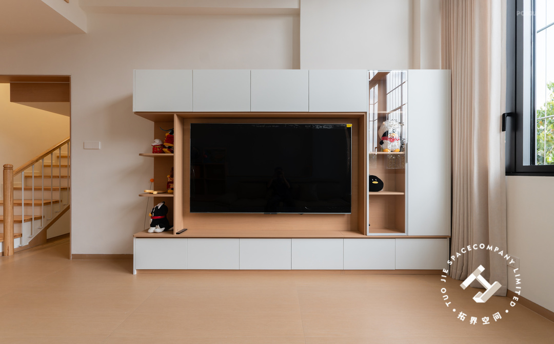 电视柜巧妙融合了封闭柜、开放格与玻璃展示柜三种收纳形态,既满足客厅收纳需求,又因错落的布局与展示功能,为空间注入了鲜活的生活气息与趣味感。