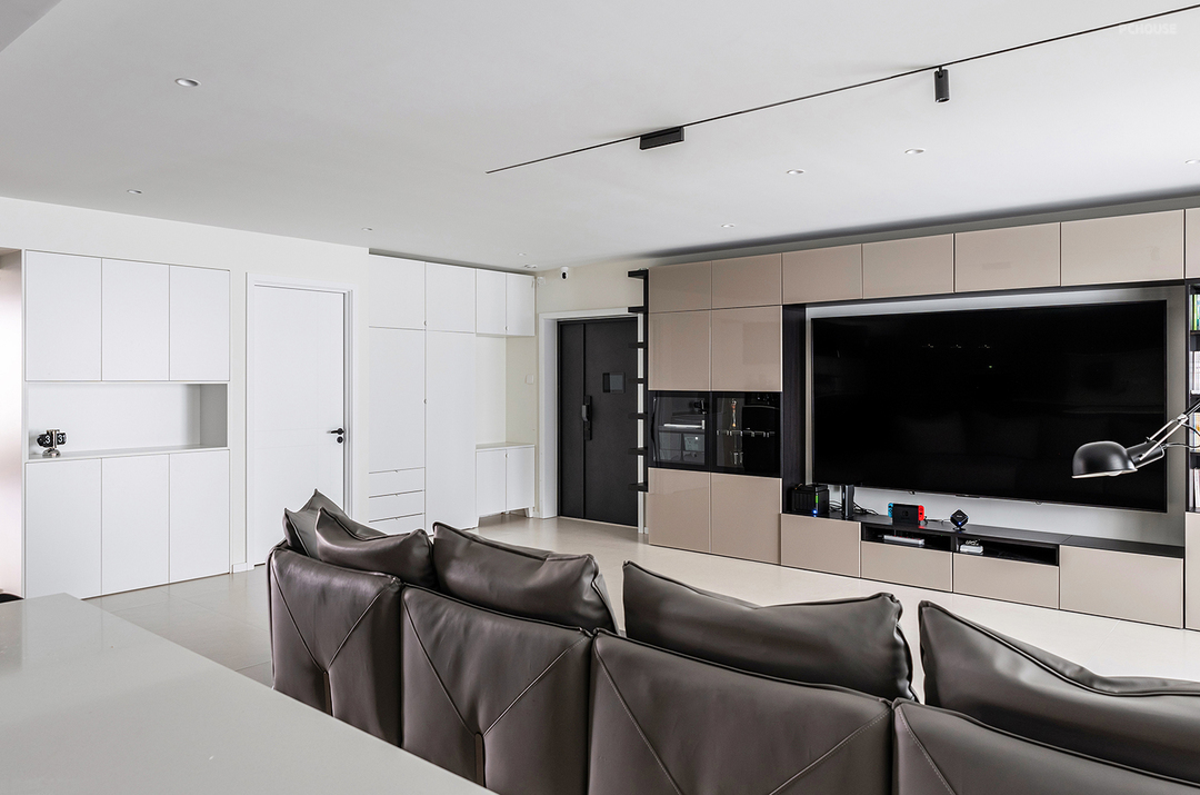 横跨5m的电视墙,以浅棕哑光柜门与黑色立柜构建出利落层次。