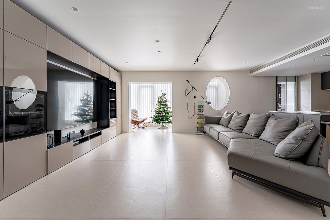 客厅空间以浅灰与米白基调诠释简约精髓,一体化收纳柜与利落家具线条,摒弃冗余装饰,凝练出松弛的生活温度。大平层的通透视野,让人身心更加舒适。