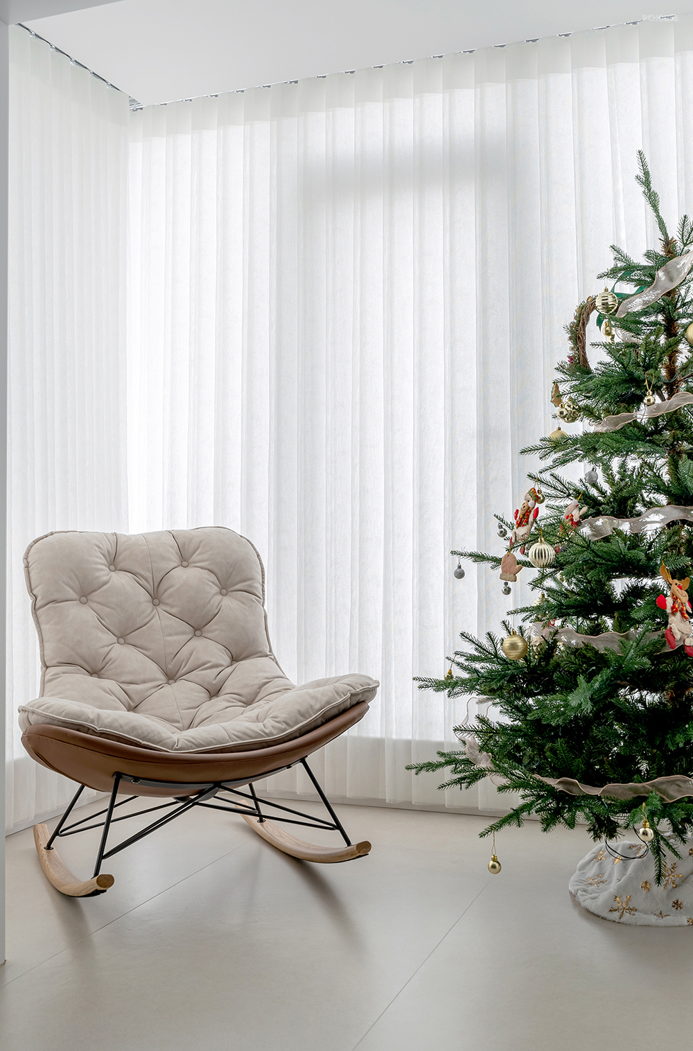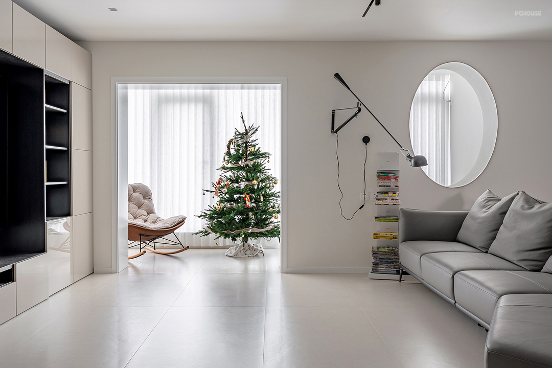 阳台方形垭口与右侧椭圆洞口形成对比,打破方正的刻板效果。二者共同将阳台的柔光,通过纱帘转换成朦胧光雾,为室内注入通透的呼吸感。