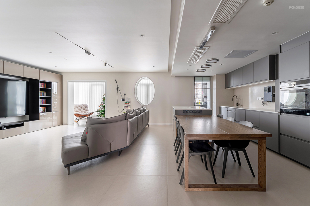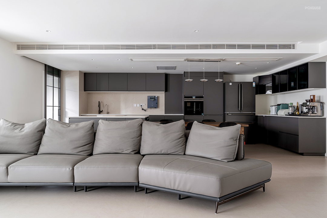客厅采用大横厅设计,开放式布局打破空间壁垒,浅灰L型沙发不靠墙,通透视野自由舒展。与后方深灰色橱柜厨房形成无界联动,延伸出豁达的纵深感。