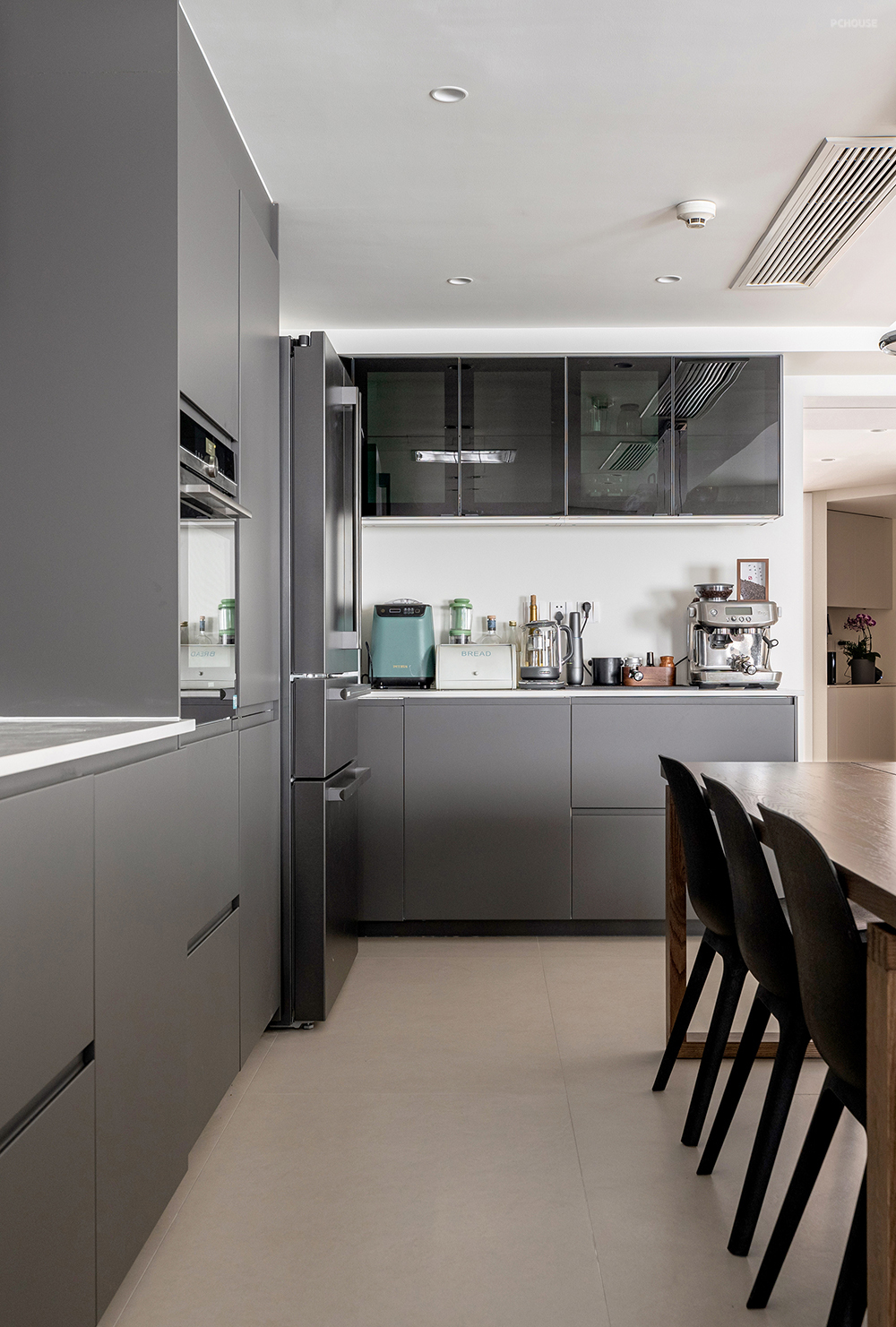 西厨的高柜与操作台连接,嵌入式烤箱、冰箱在纵向的收纳柜中消除体积感。横向延展的操作台,承接水槽功能,强化了烹饪动线的连贯性。