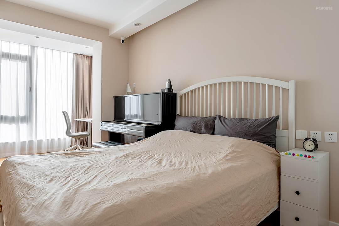 这是姐姐的房间,延用了相同的主色调,床头摆放了一架钢琴,并利用阳台打造学习区。