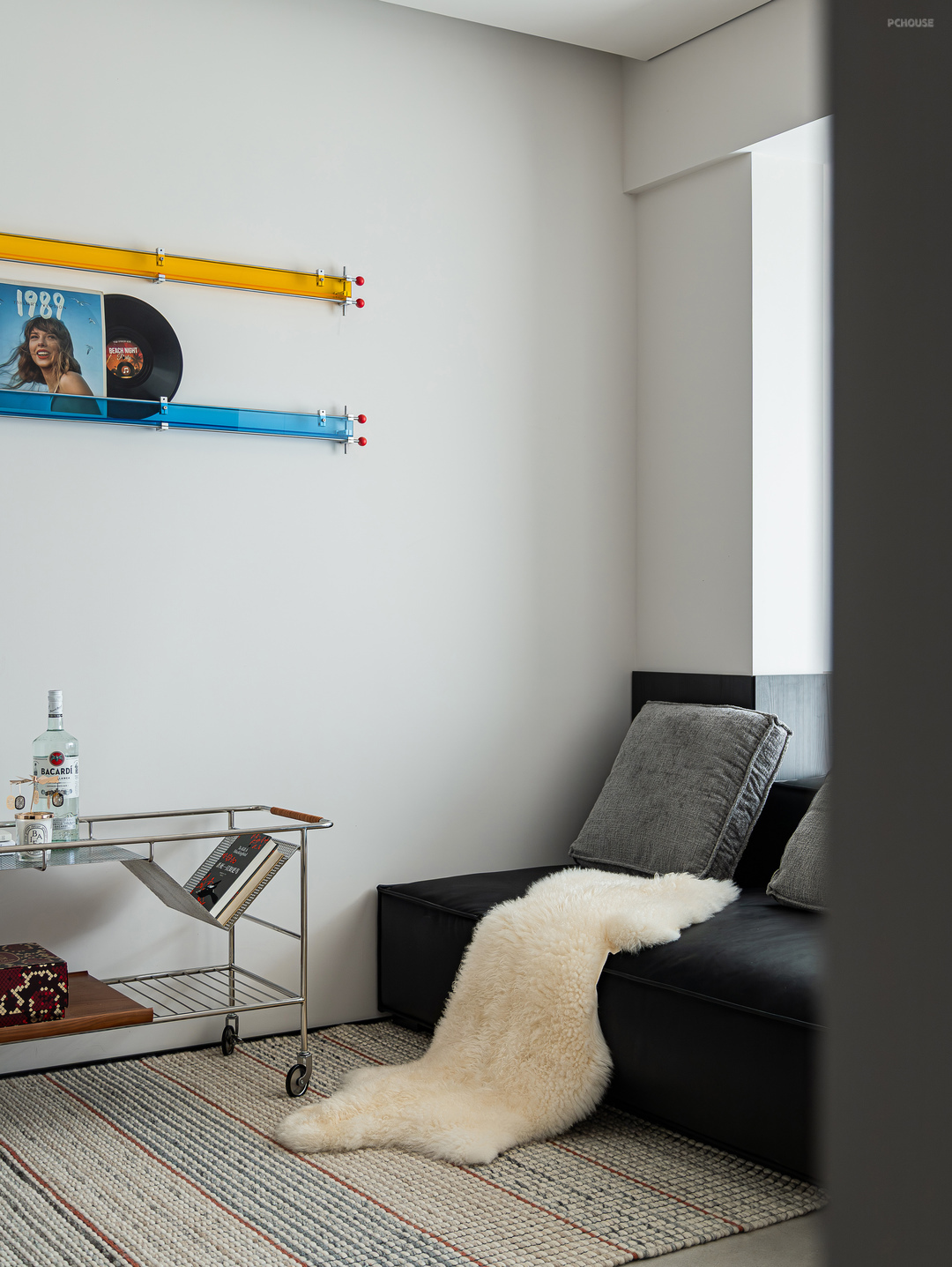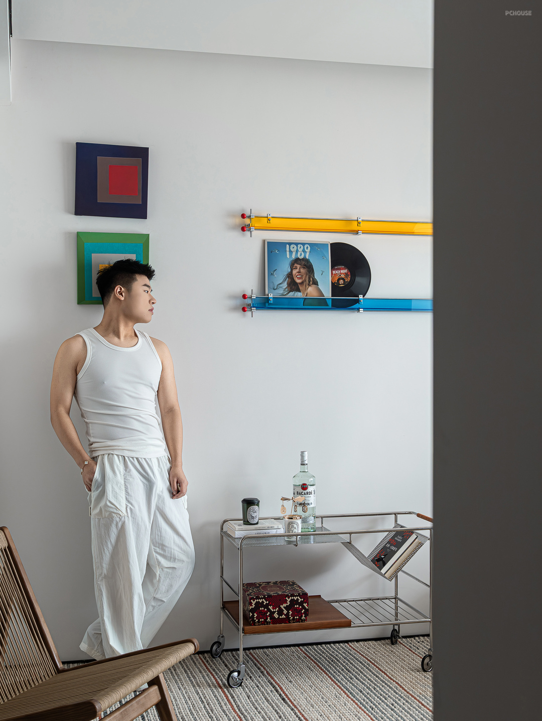 致敬包豪斯美学,墙面鲜艳明快的唱片架及挂画,赋予了空间独特的视觉冲击力,不仅为原本空间沉稳的色调增加了趣味性,更彰显年轻人独有的热情以及对未知世界的追求