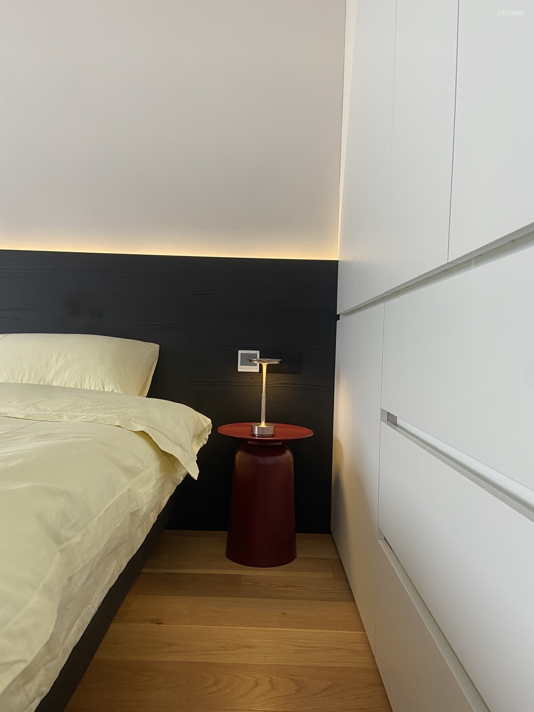夜幕降临,灯光洒下,红色不锈钢材质的床头柜,热烈又冷静