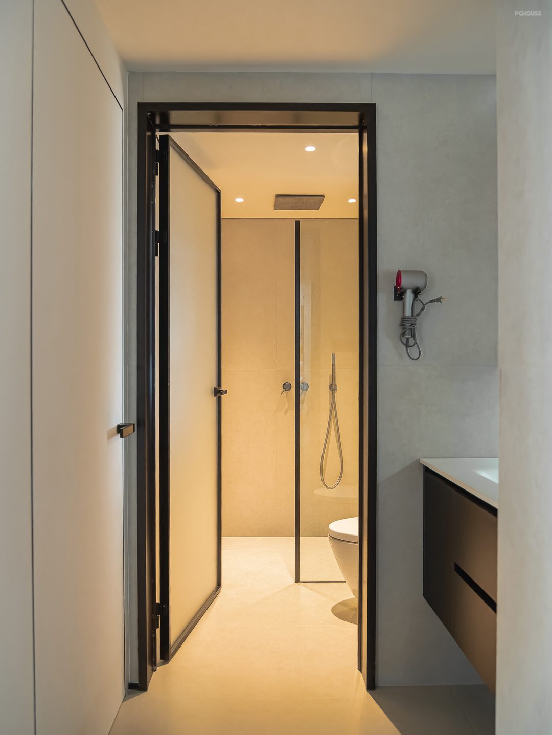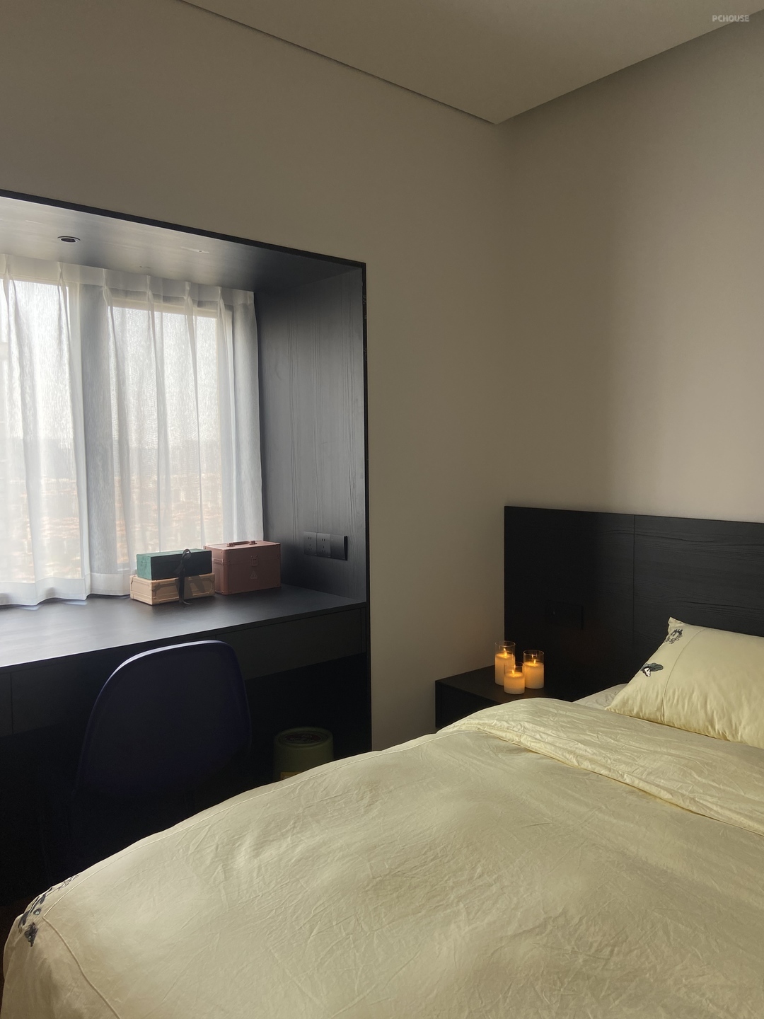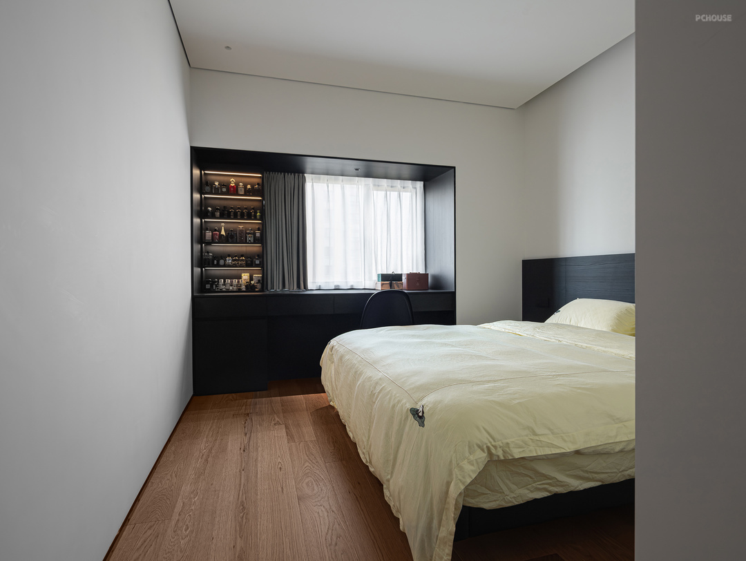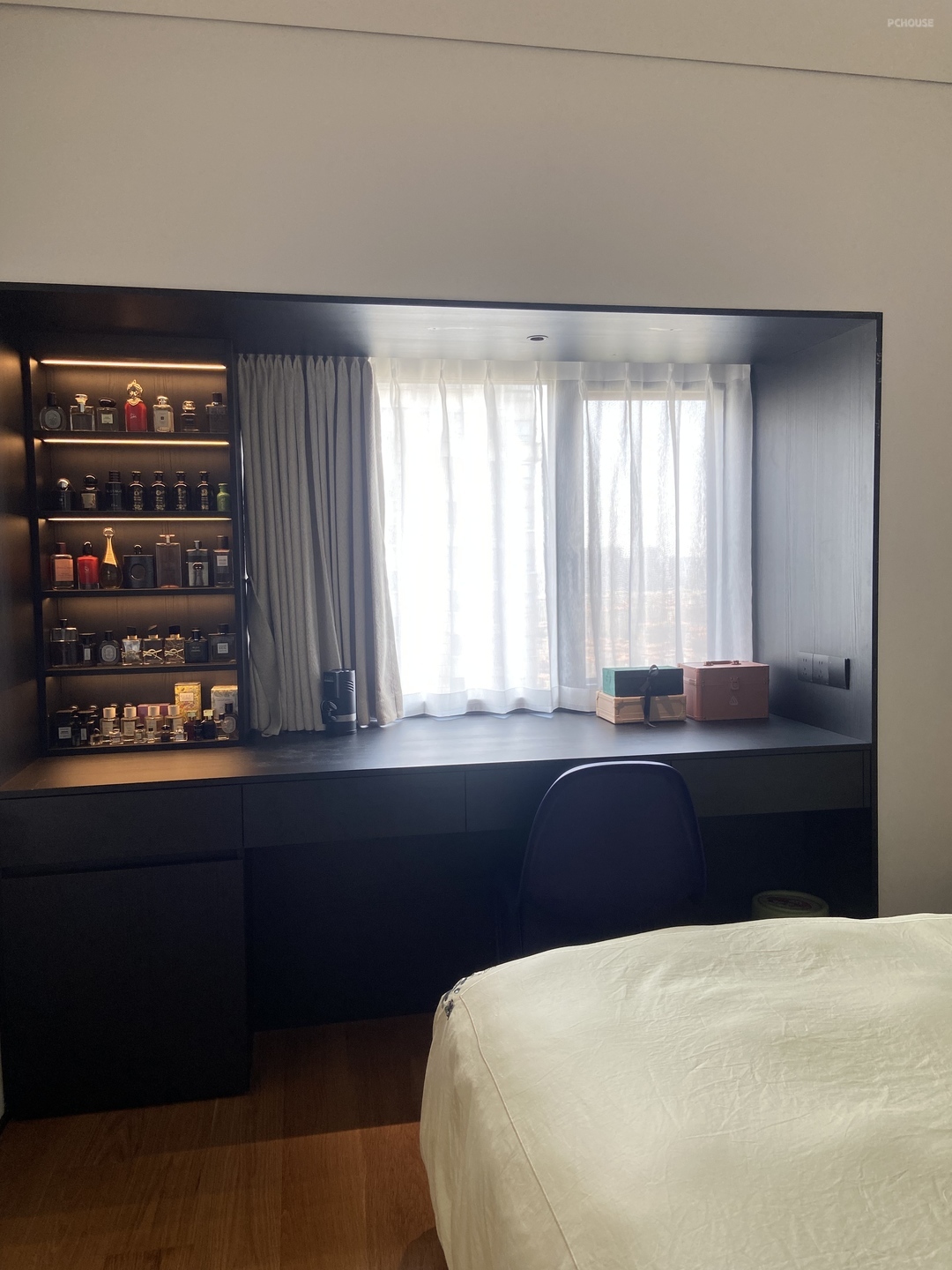 主卧空间以简洁的黑为主色调,一把紫色独特造型的单椅,让这个写字台多了几分艺术气息,展示架上摆满了屋主喜欢的香水,这里是属于他的私人领地