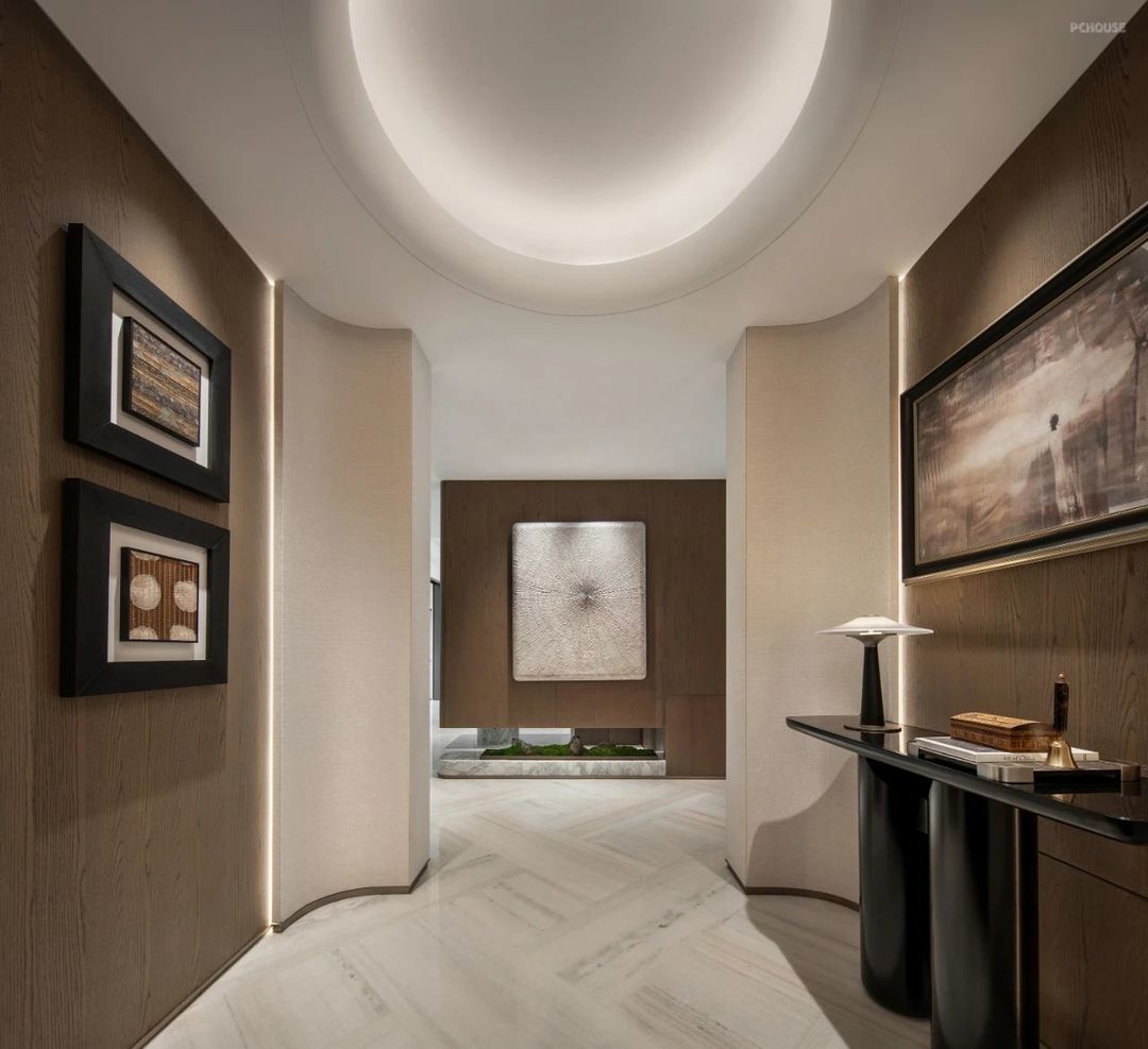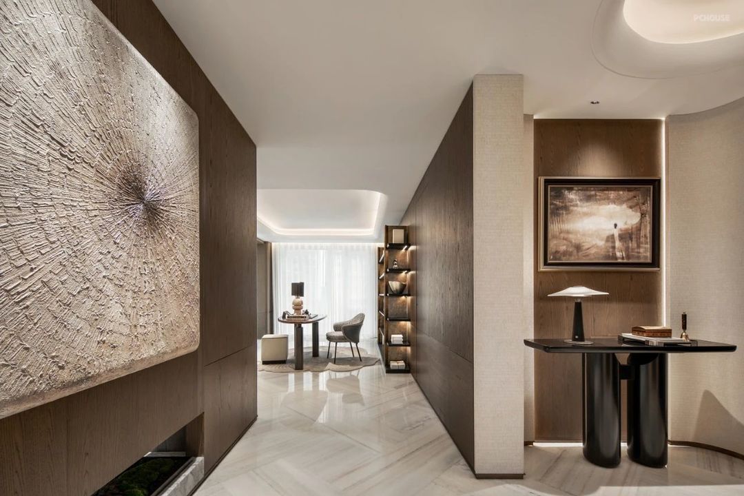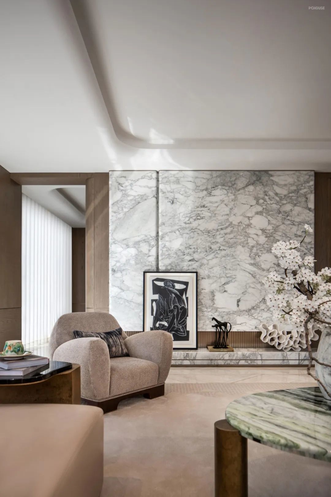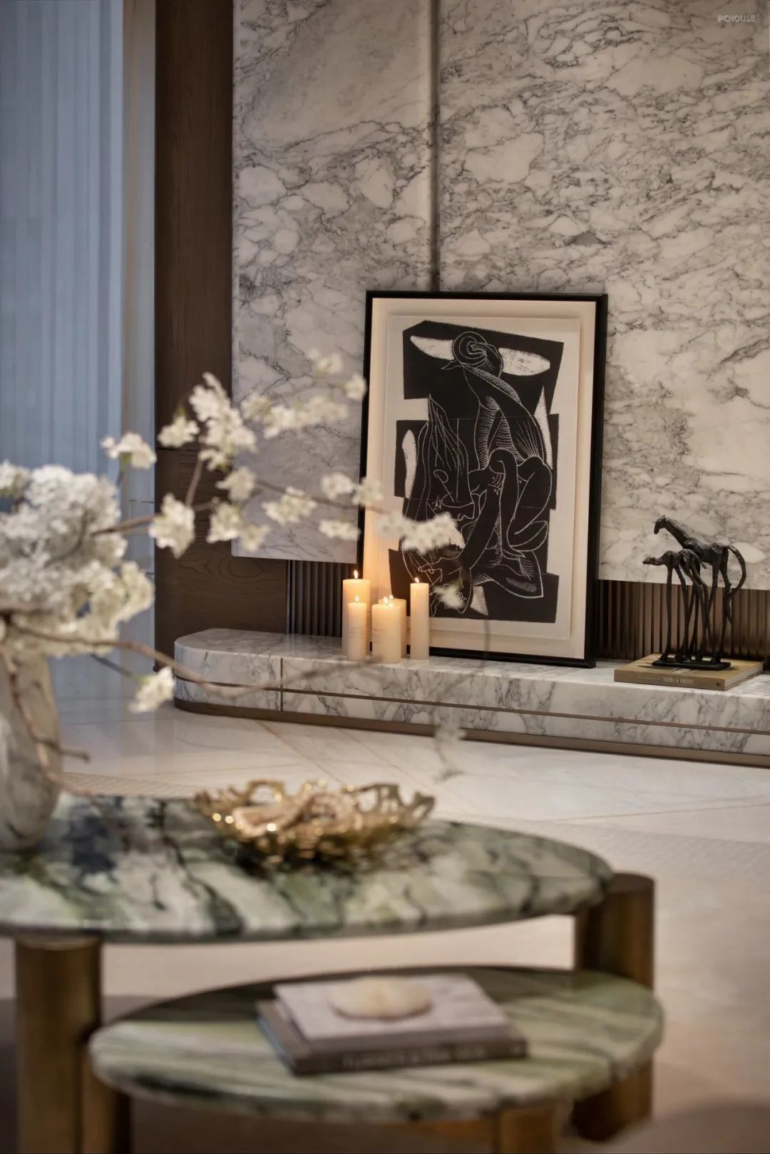 大面积留白与简洁线条形成呼吸感,搭配艺术装置与精致软装,于松弛自然中唤醒居者与空间的深层情感链接。浅木纹理如岁月的叙事,与光影一同将这份生活美学沉淀为温润的时光印记。