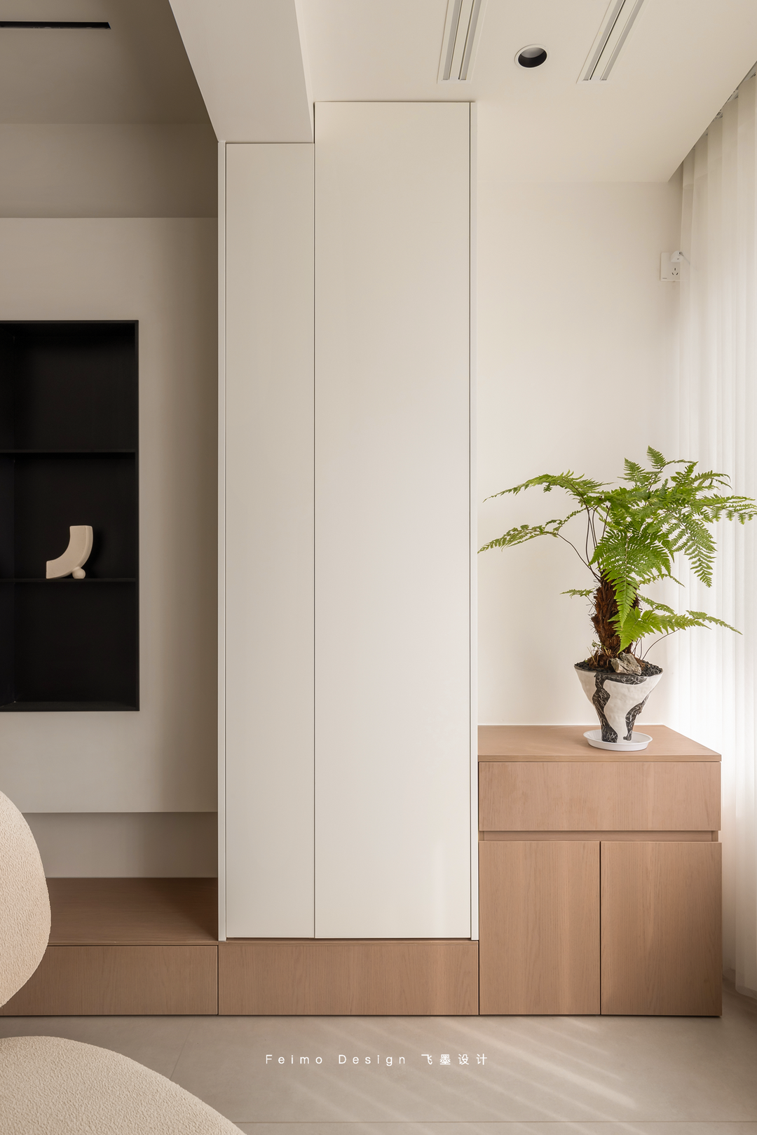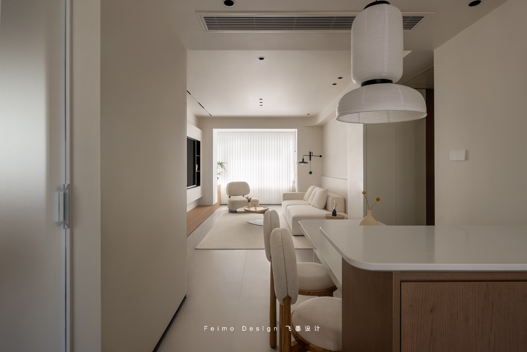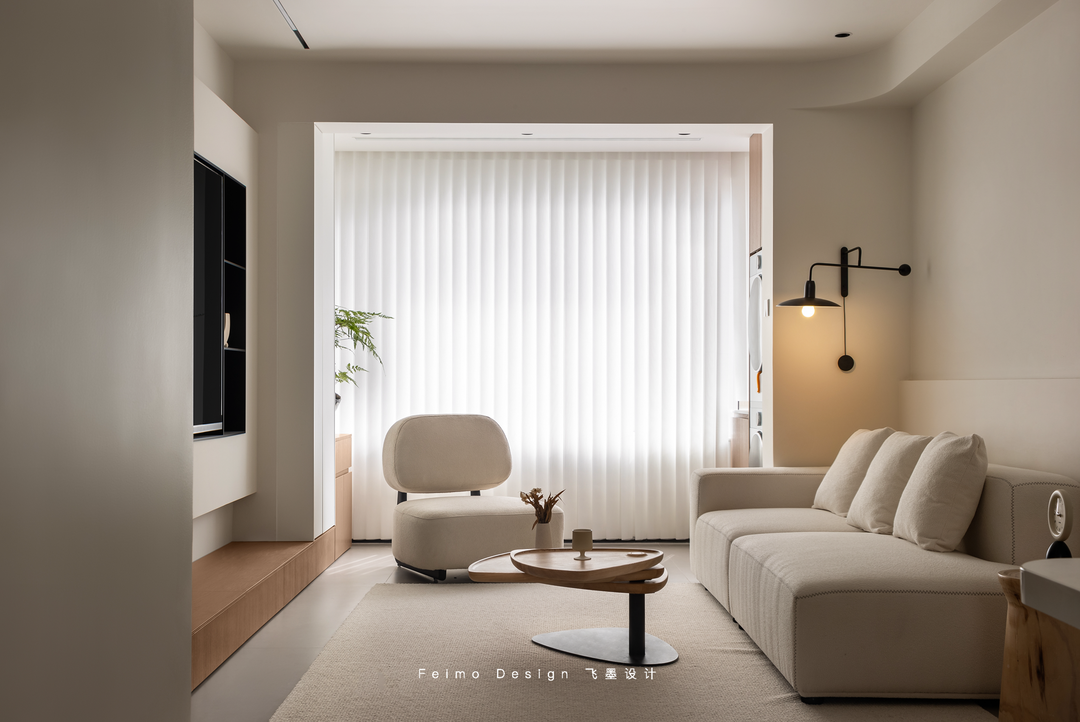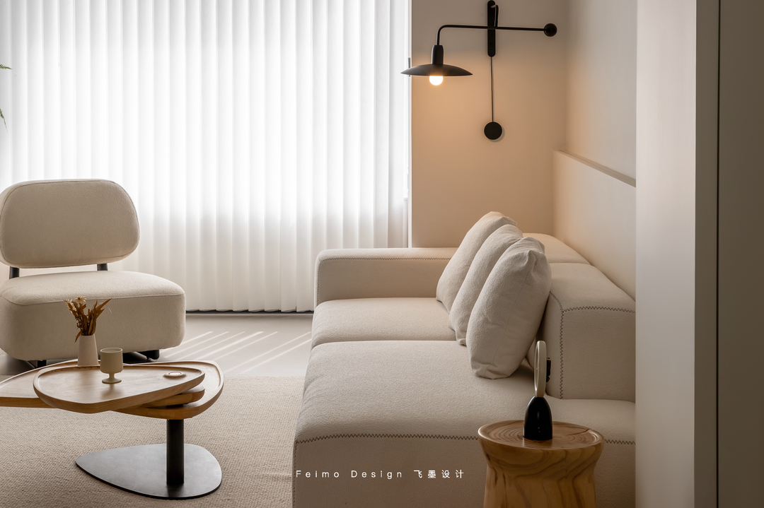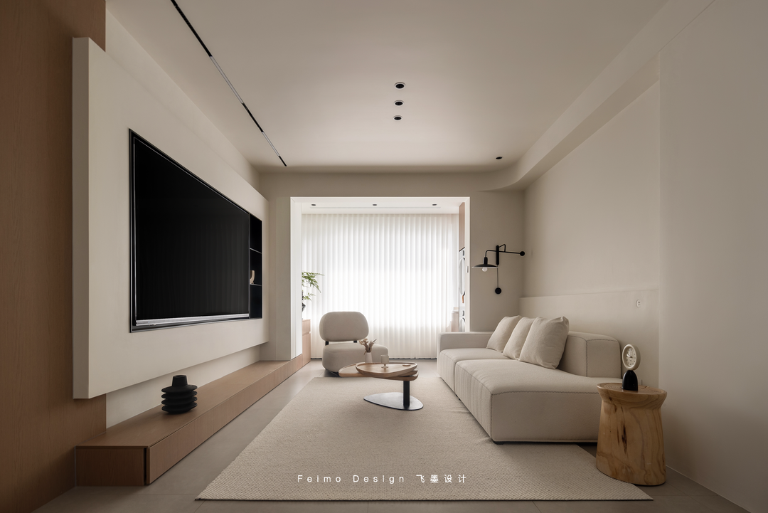 于是设计师在装修过程中尽可能做减法。墙面、顶面、家具搭配等一眼看上去舒适简单,但细看却都有丰富的造型层次:柜子用原木和奶白拼接、电视墙做悬空造型、沙发墙用斯卡帕叠级和灯线组合……