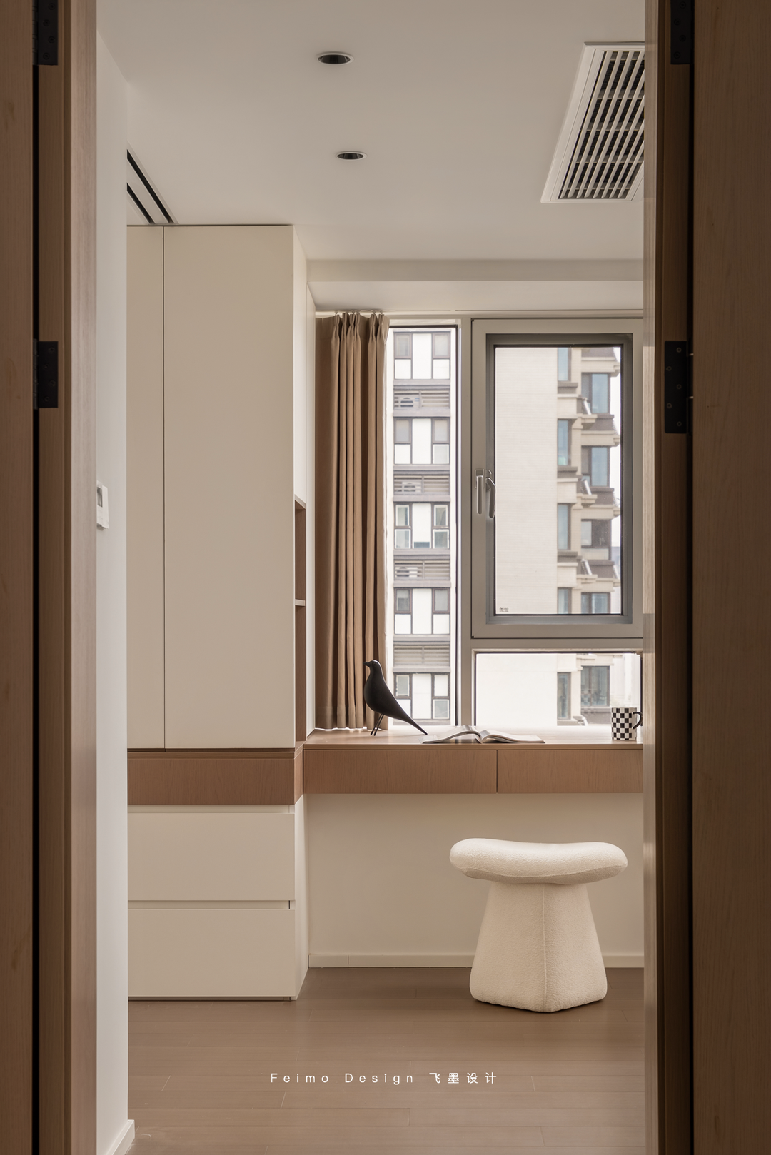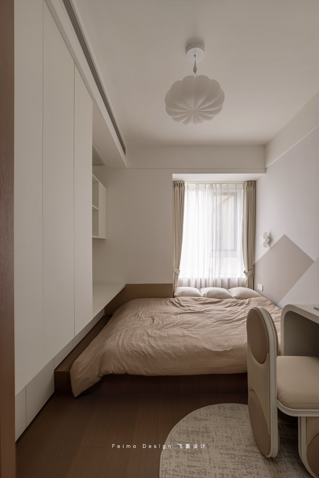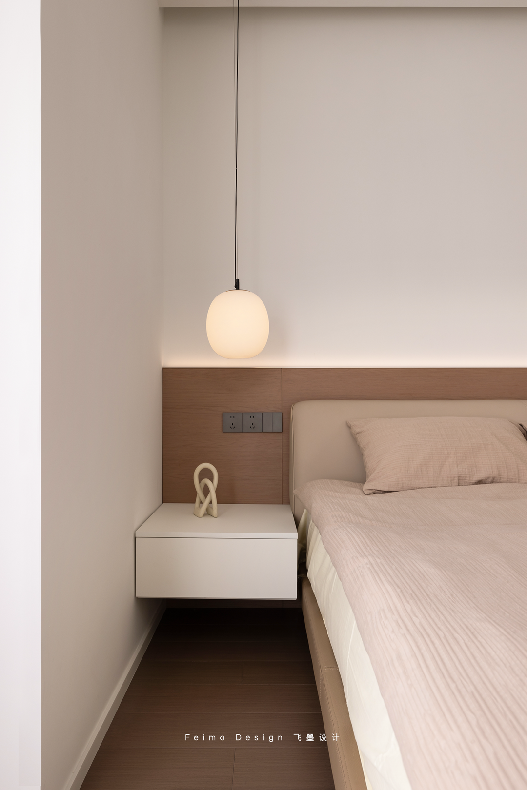 于是设计师在装修过程中尽可能做减法。墙面、顶面、家具搭配等一眼看上去舒适简单,但细看却都有丰富的造型层次:柜子用原木和奶白拼接、电视墙做悬空造型、沙发墙用斯卡帕叠级和灯线组合……
