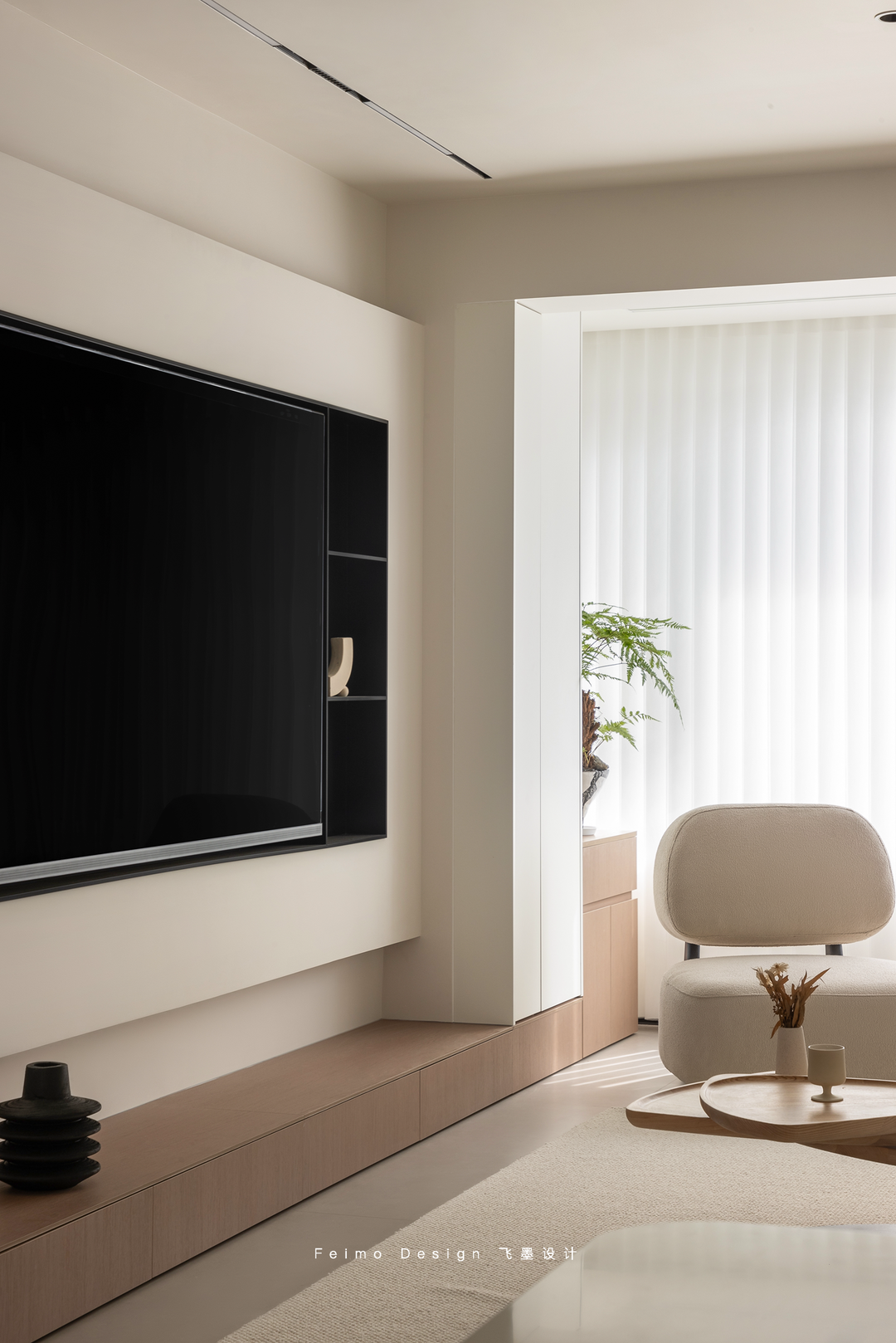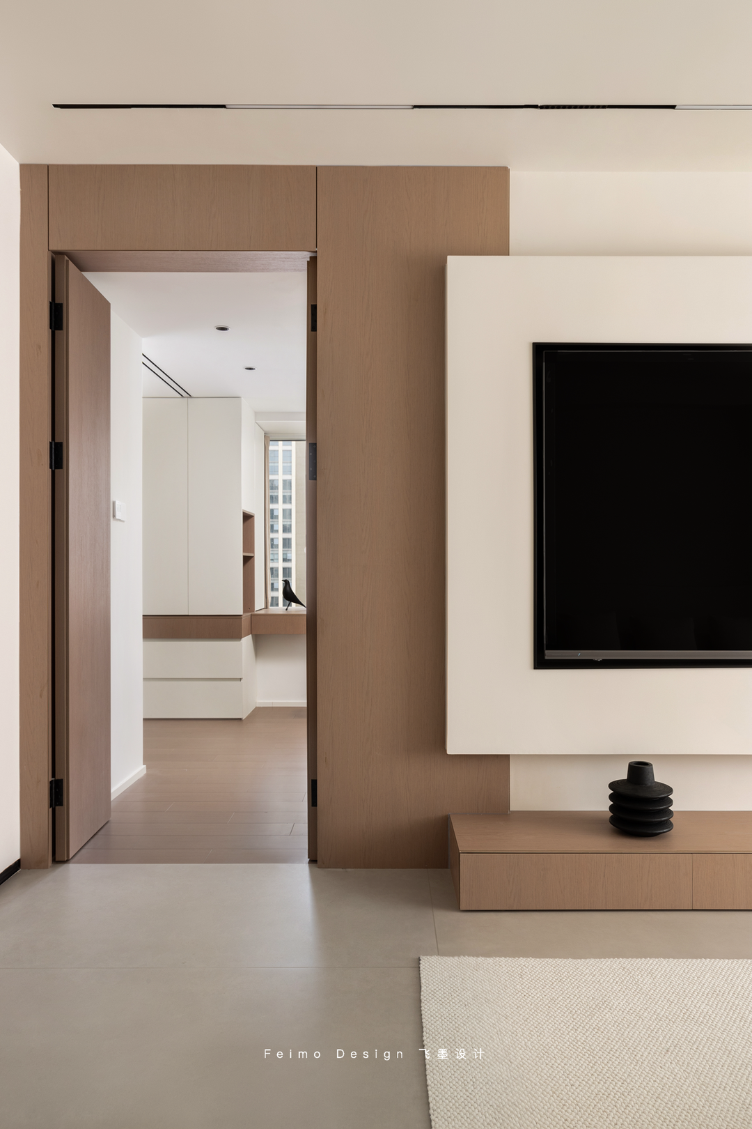 原木的双开门连接电视墙。生活中的简单仪式感带来闲适和满足。放松状态,简单生活。