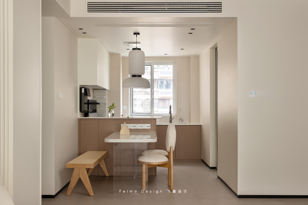 厨房橱柜直接延伸出餐桌。不仅丰富了收纳,也可以在餐桌上工作、吃饭,转身就可以在厨房处理简餐,把厨房和家更好的融合在一起。