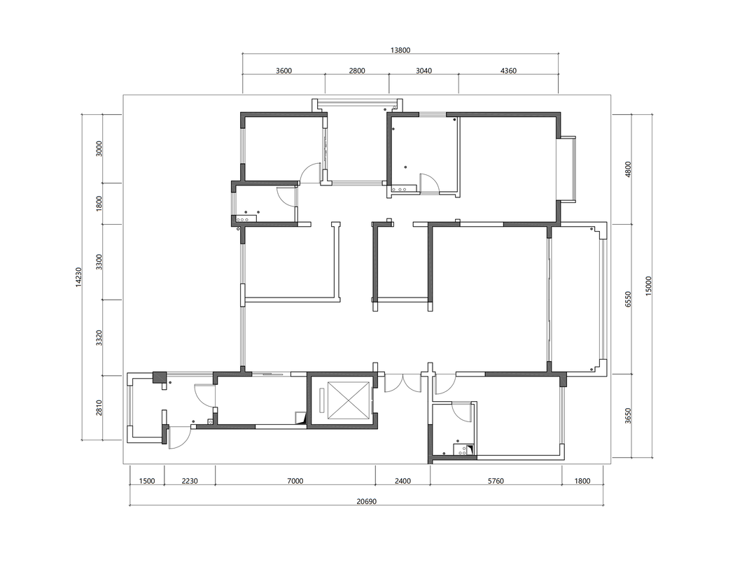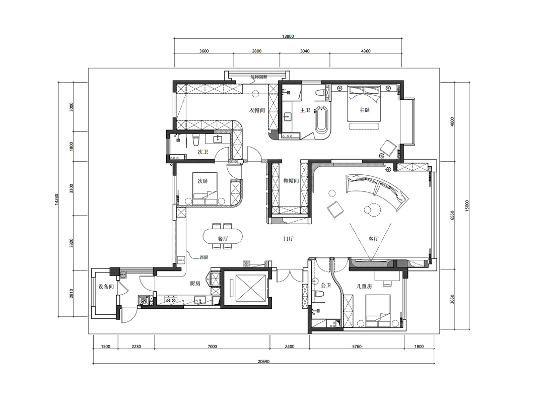 布局方面,我们首先将阳台封闭,并入了客厅,扩大了客厅面积;其次将一个次卧与主卧合并,改为衣帽间。其他两个次卧做了一些小调整,成为儿童房与客房。