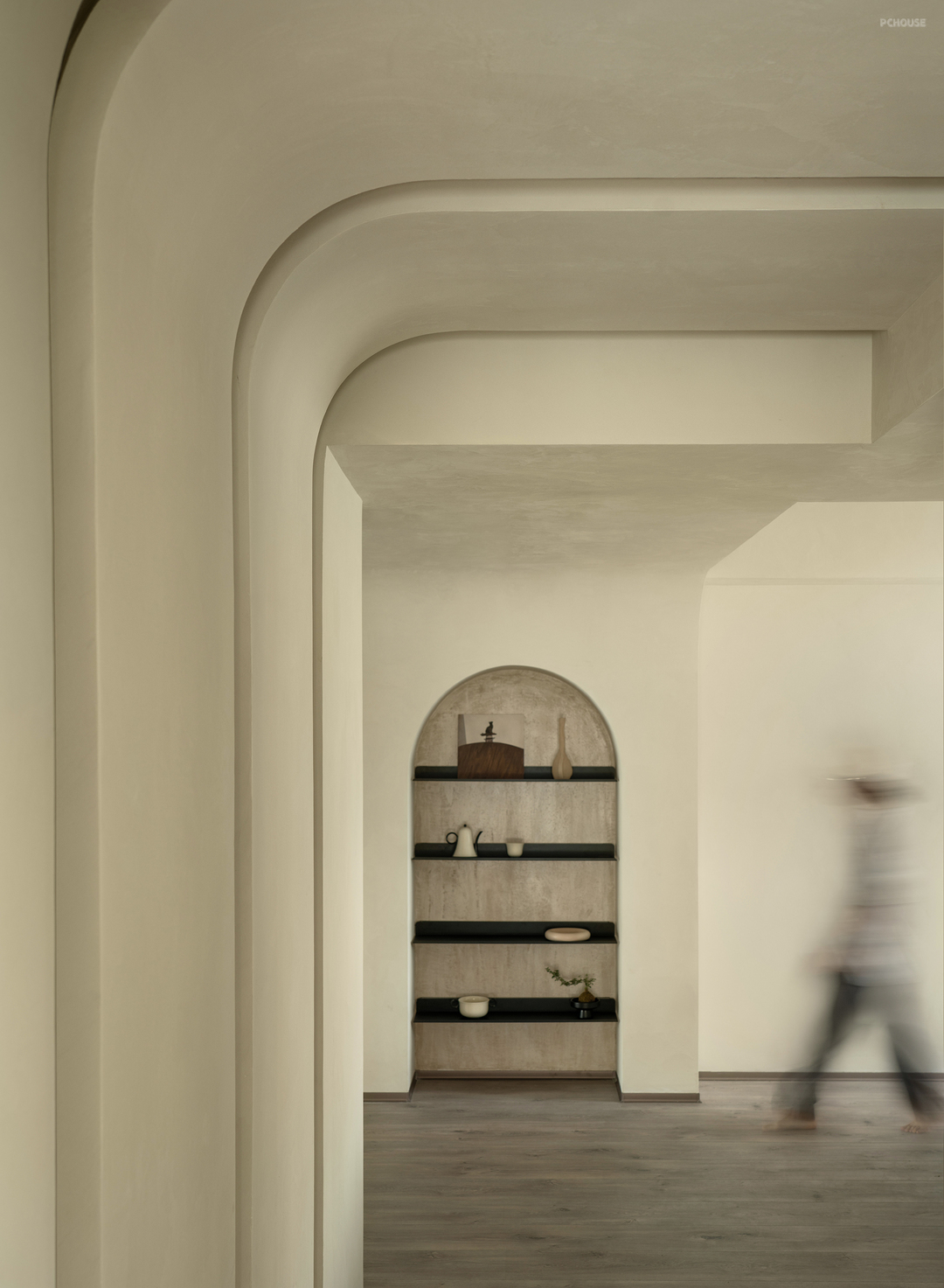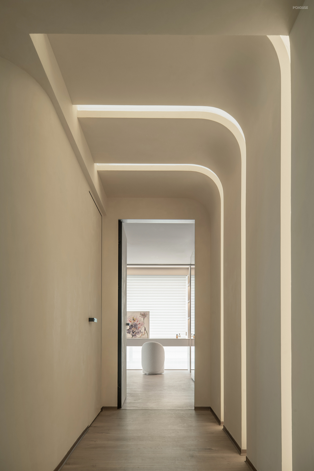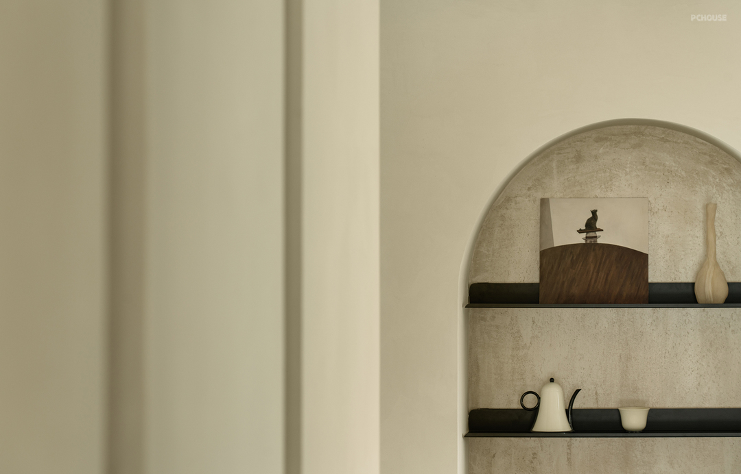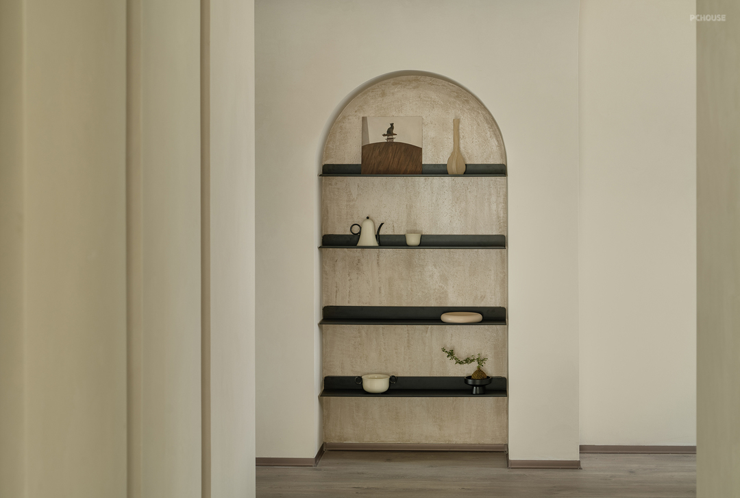 走廊较长,连接两个卧室和餐厅。为了打破单调感,我们延续了弧形设计,并在走廊尽头设置了一个拱形壁龛,不仅起到装饰作用,还可嵌入灯带,提供柔和的氛围照明。