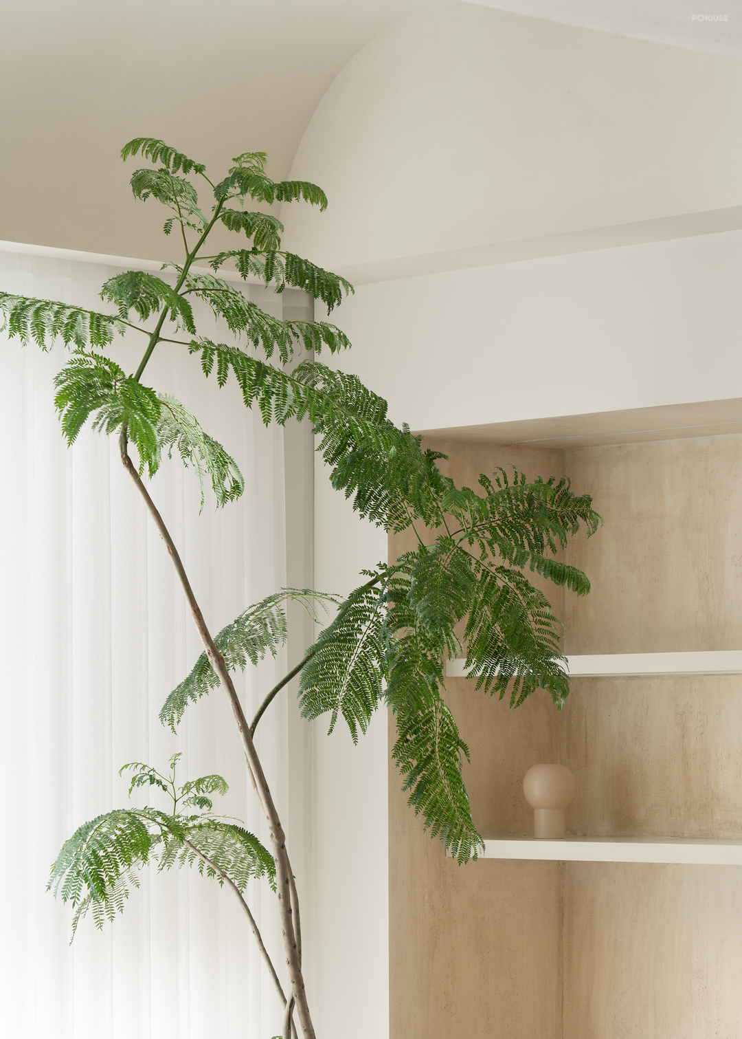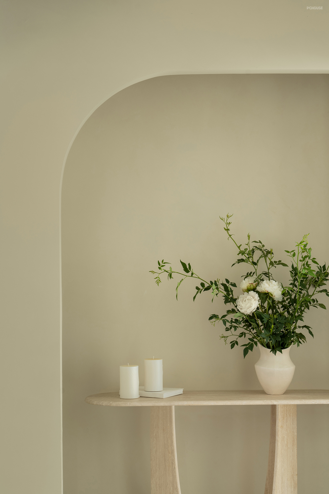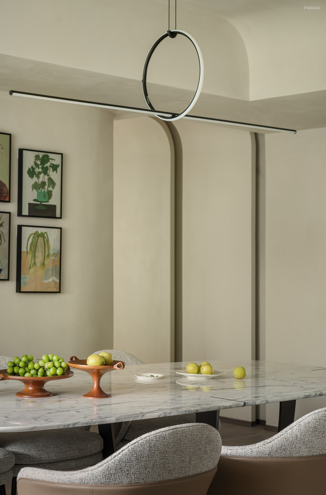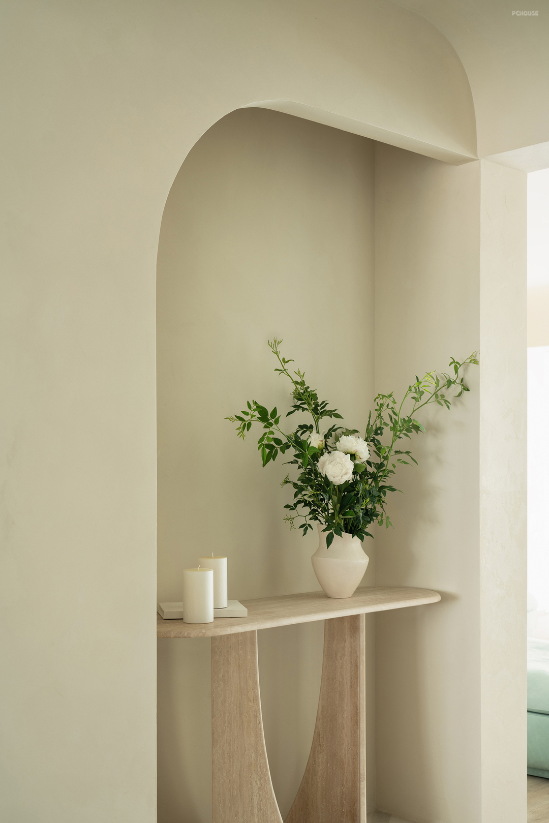 走廊较长,连接两个卧室和餐厅。为了打破单调感,我们延续了弧形设计,并在走廊尽头设置了一个拱形壁龛,不仅起到装饰作用,还可嵌入灯带,提供柔和的氛围照明。