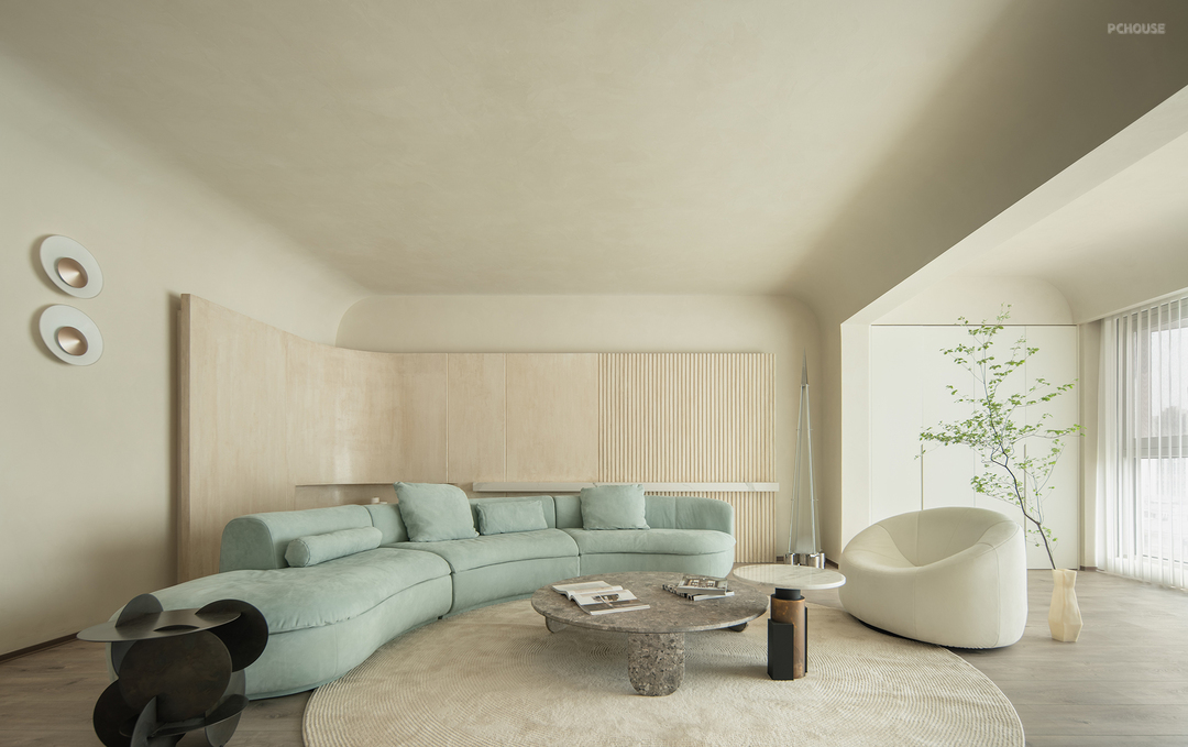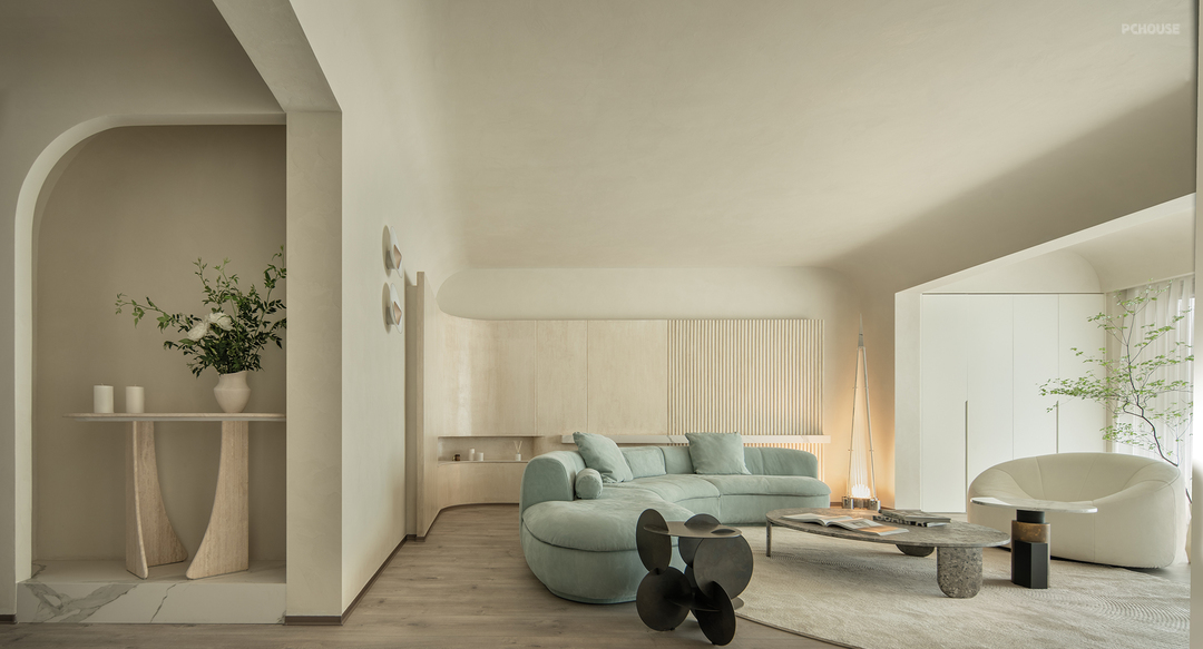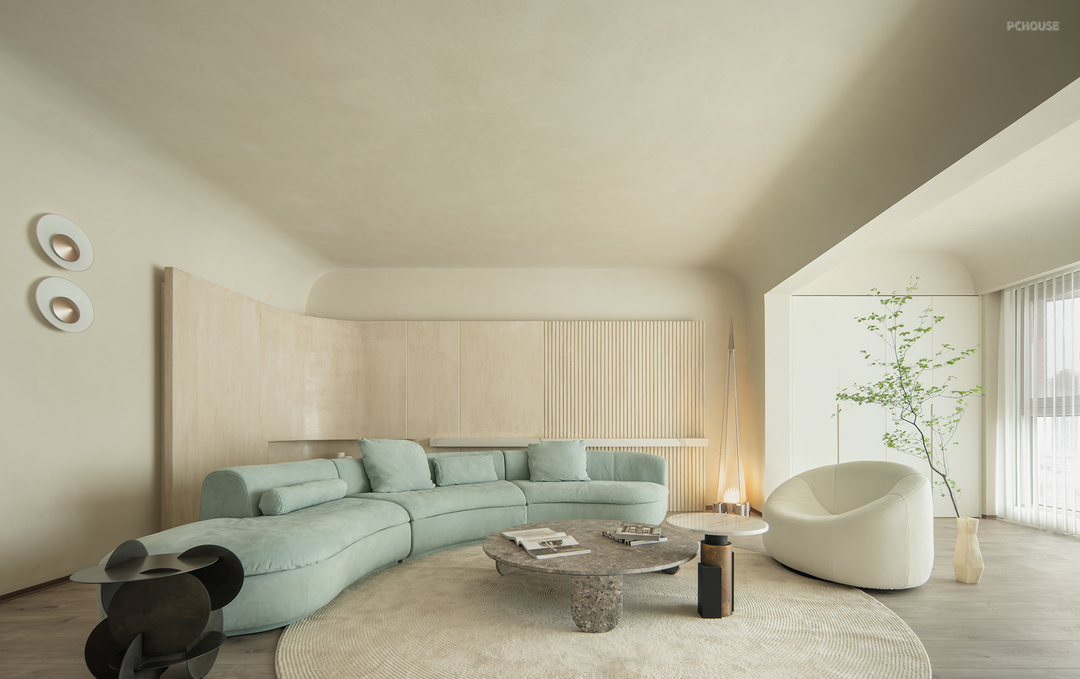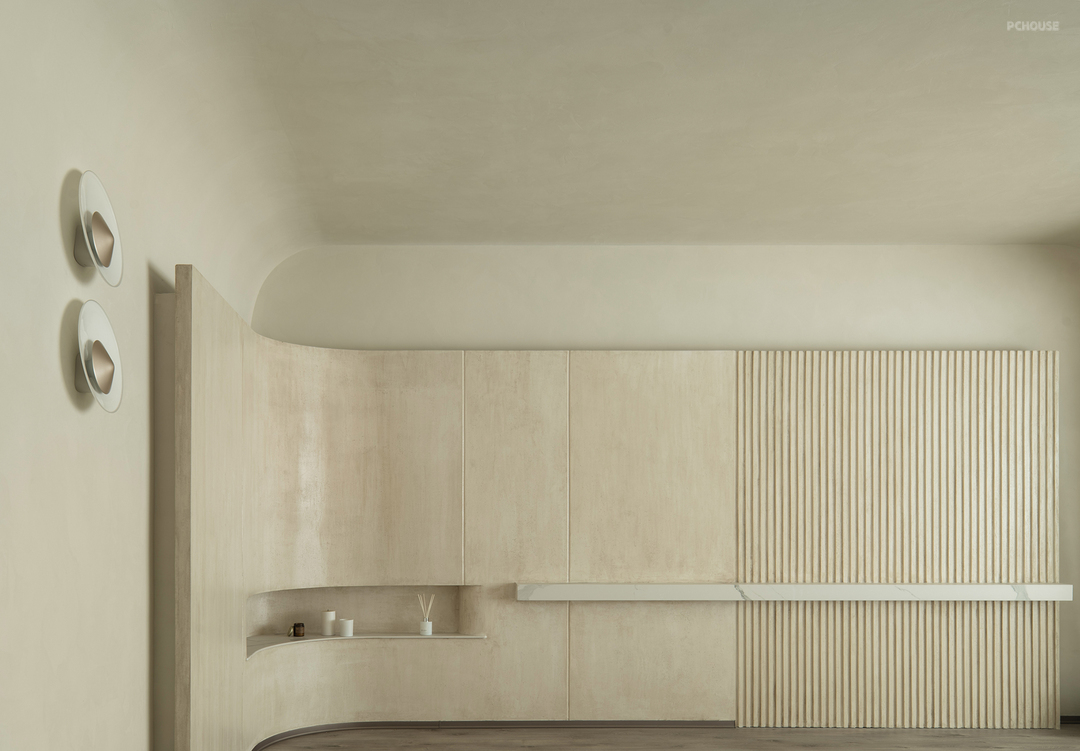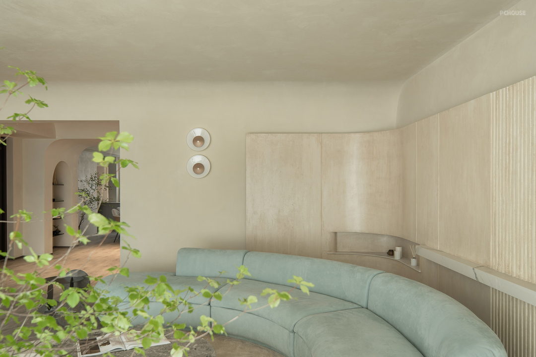 弧形背景墙采用仿洞石漆,营造出自然石材的质感。墙面艺术漆则以其独特的纹理和持久的美感,增加了整体空间的层次感和艺术氛围。
