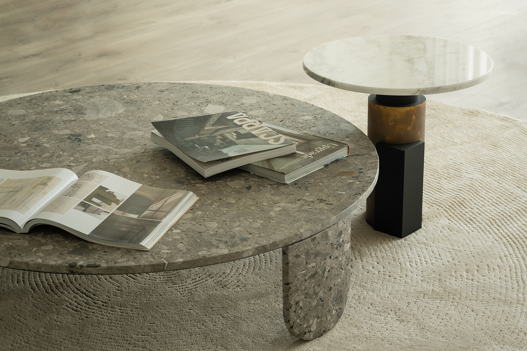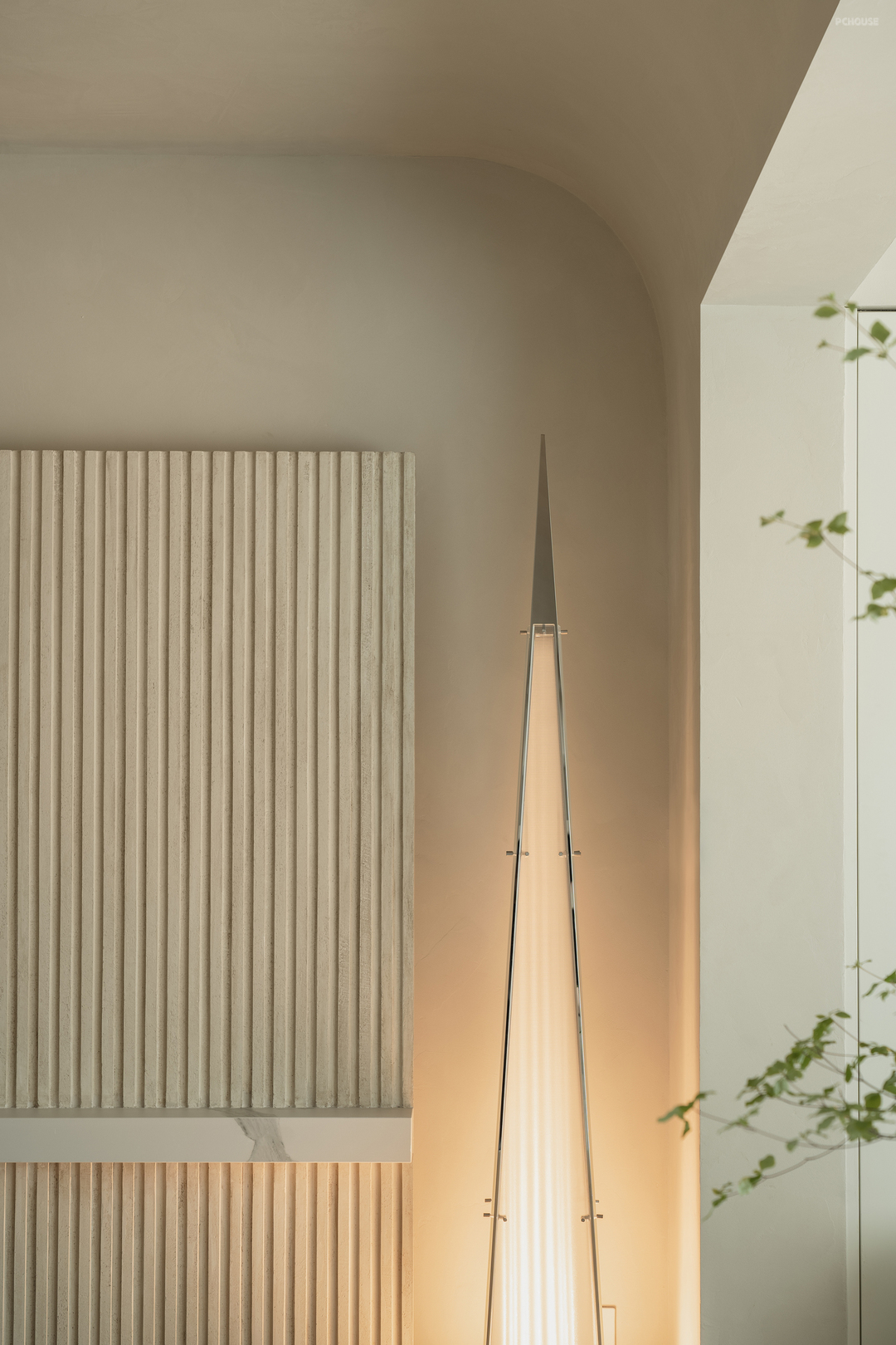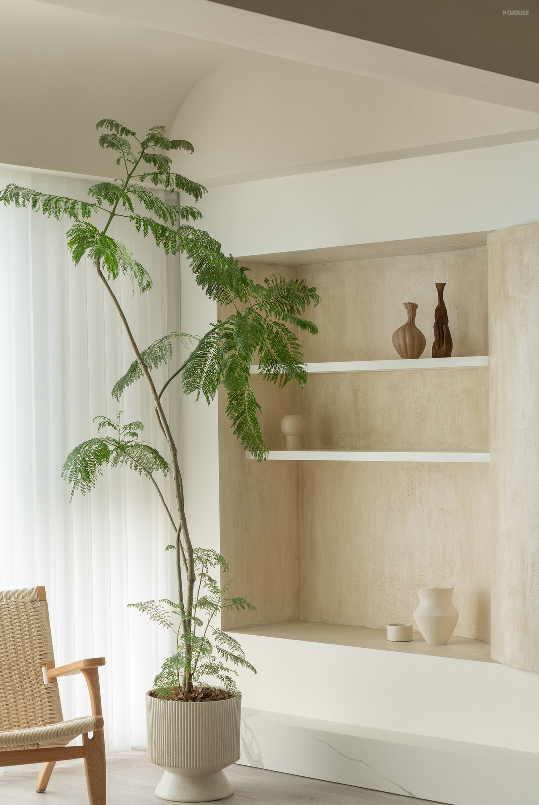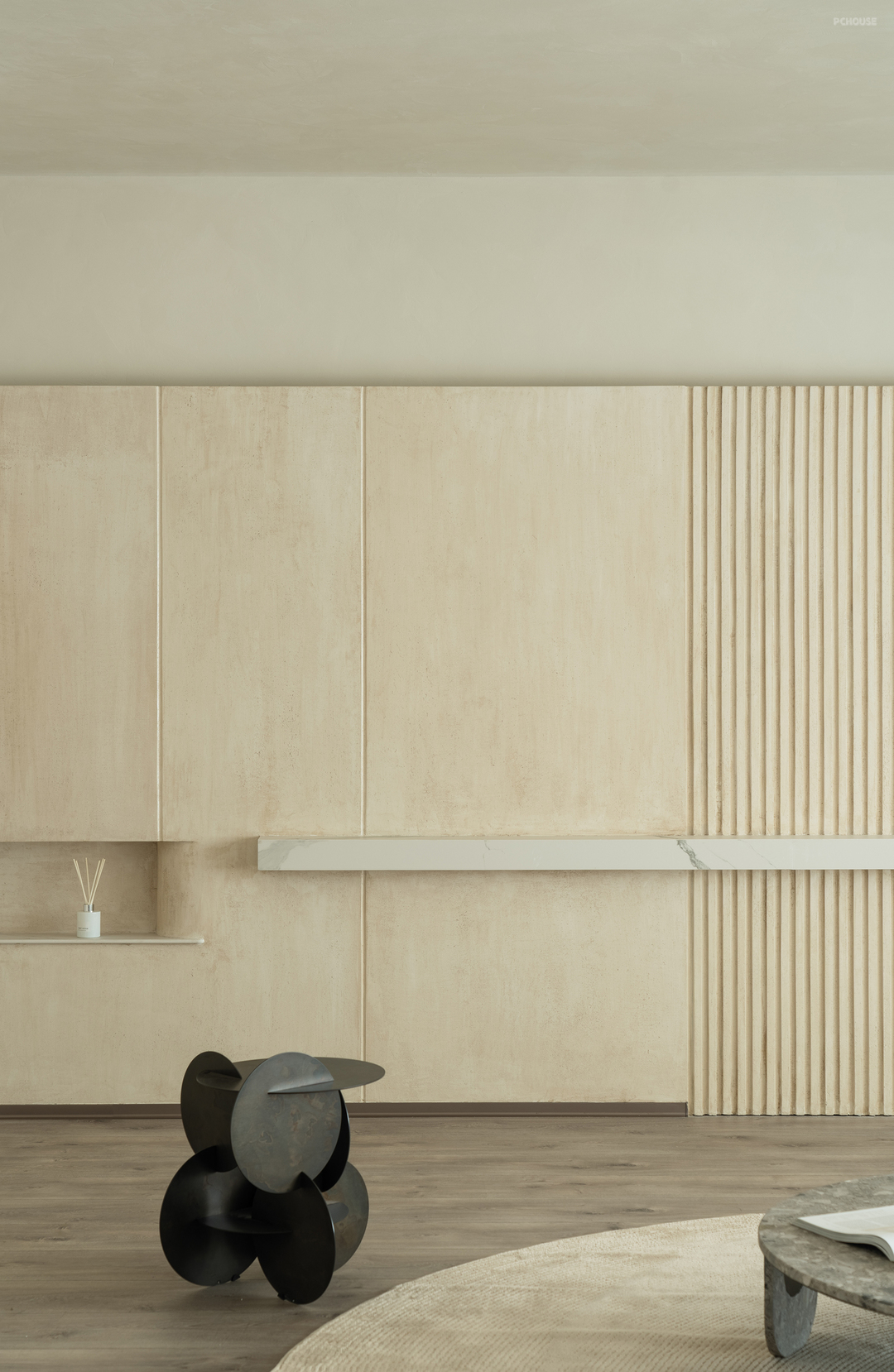 弧形背景墙采用仿洞石漆,营造出自然石材的质感。墙面艺术漆则以其独特的纹理和持久的美感,增加了整体空间的层次感和艺术氛围。