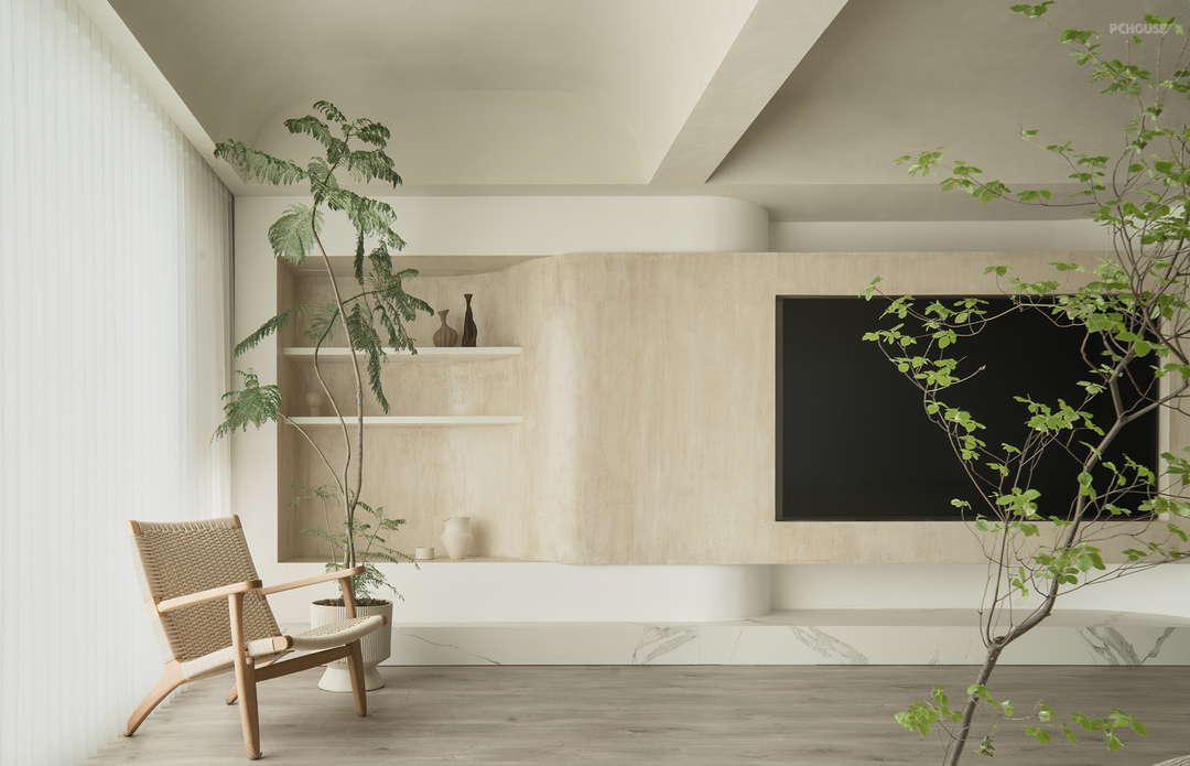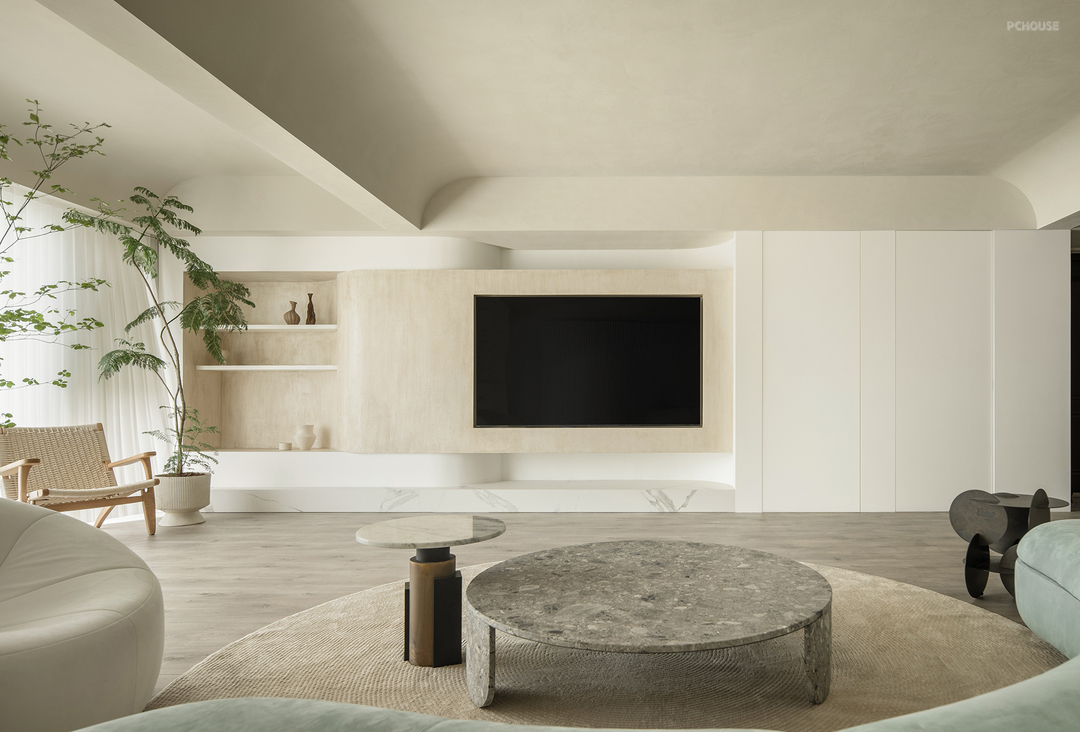 将阳台并入客厅,扩大客厅的面积。中间的梁结合吊顶做了弧形处理。电视墙同样采用弧形造型延伸至阳台一端设有壁龛用于摆放书籍和装饰品。