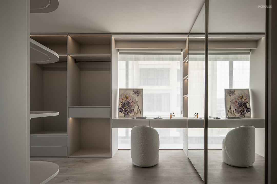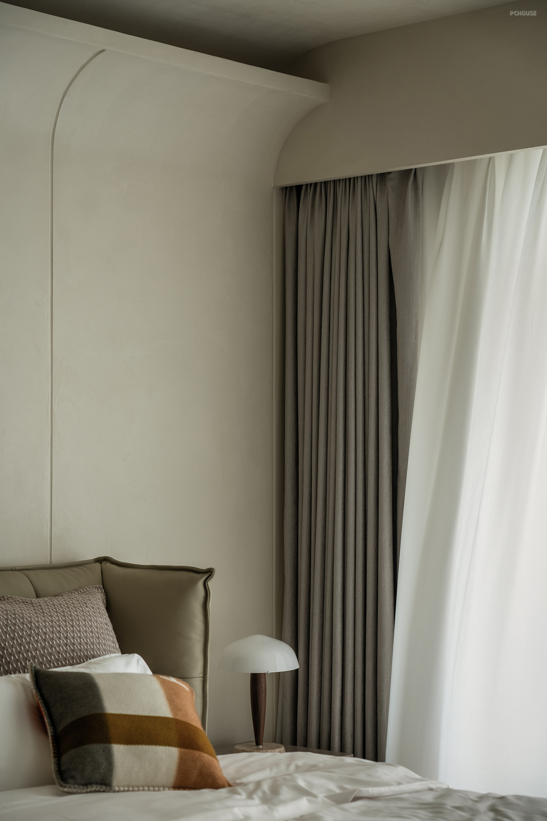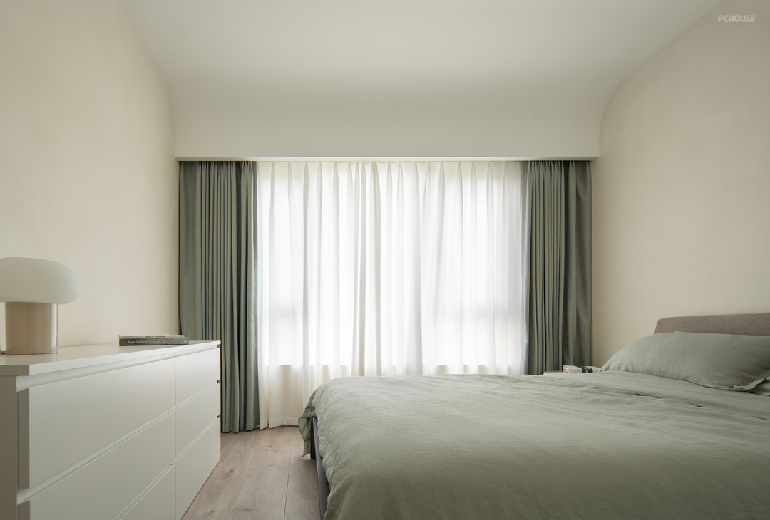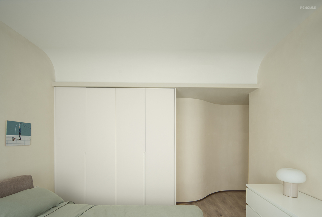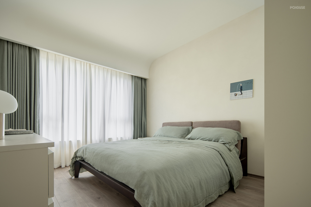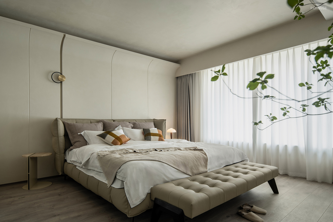 主卧延续了干净的米色调,搭配温暖的绒面和木质元素。灯光设计则巧妙结合了筒灯、壁灯和台灯,层次丰富且柔和。