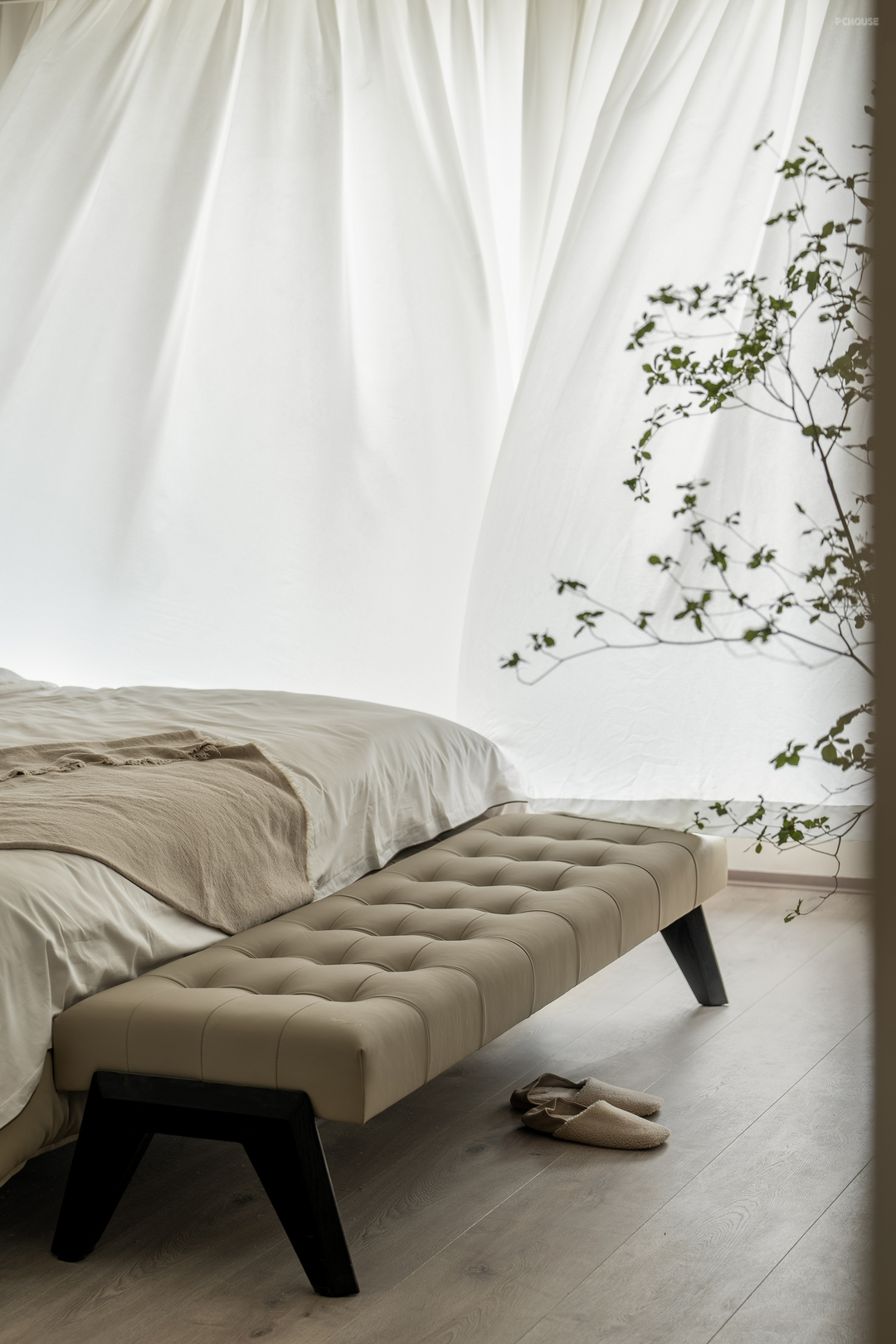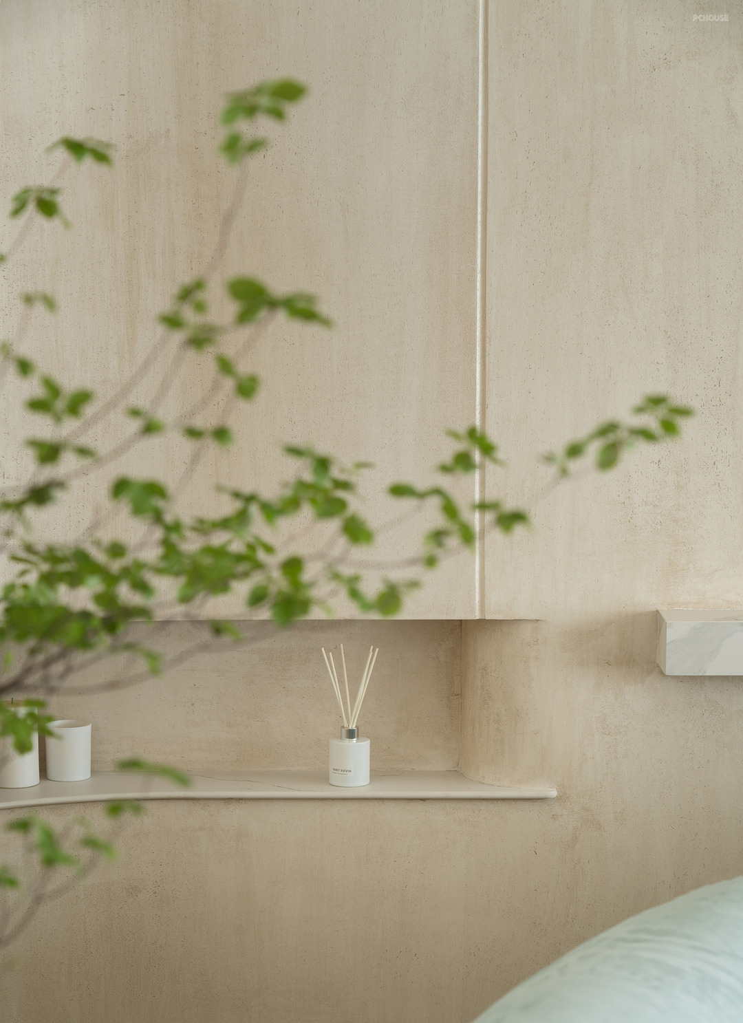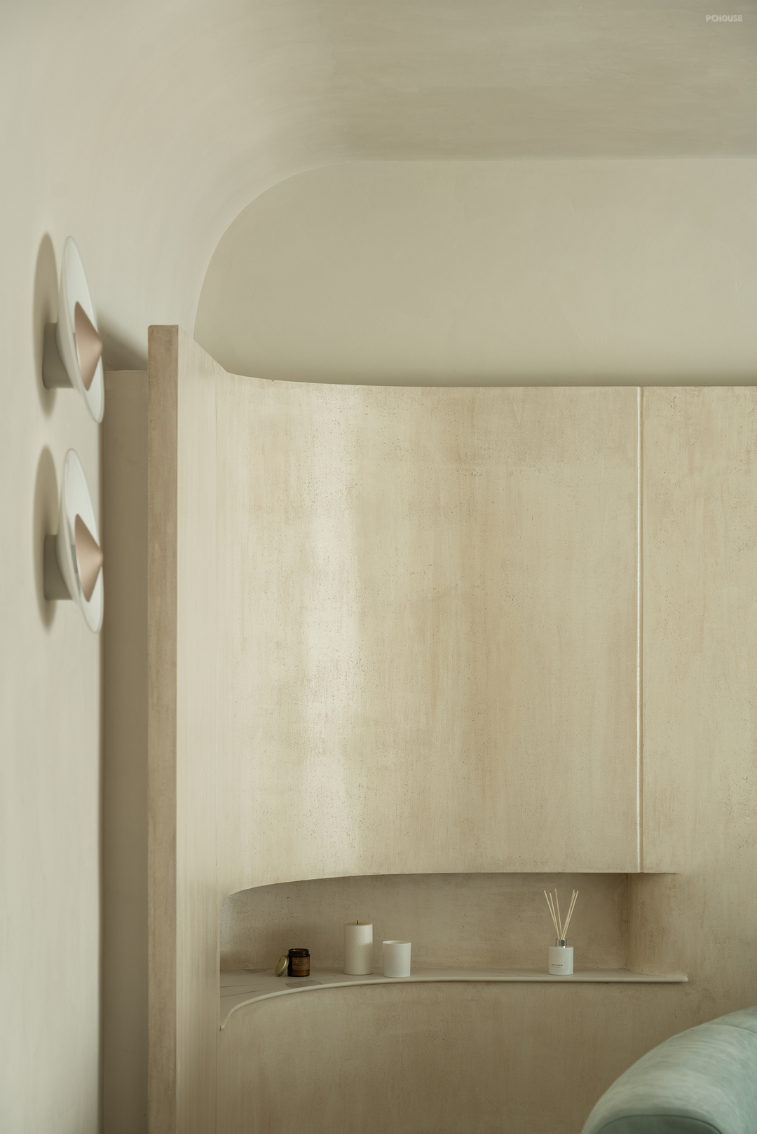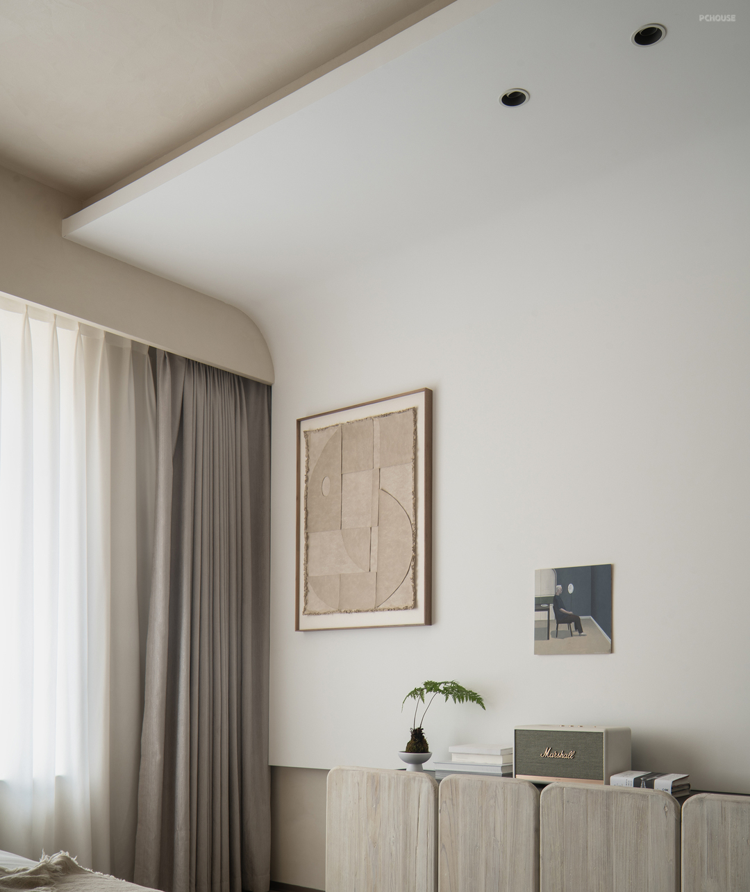 主卧延续了干净的米色调,搭配温暖的绒面和木质元素。灯光设计则巧妙结合了筒灯、壁灯和台灯,层次丰富且柔和。
