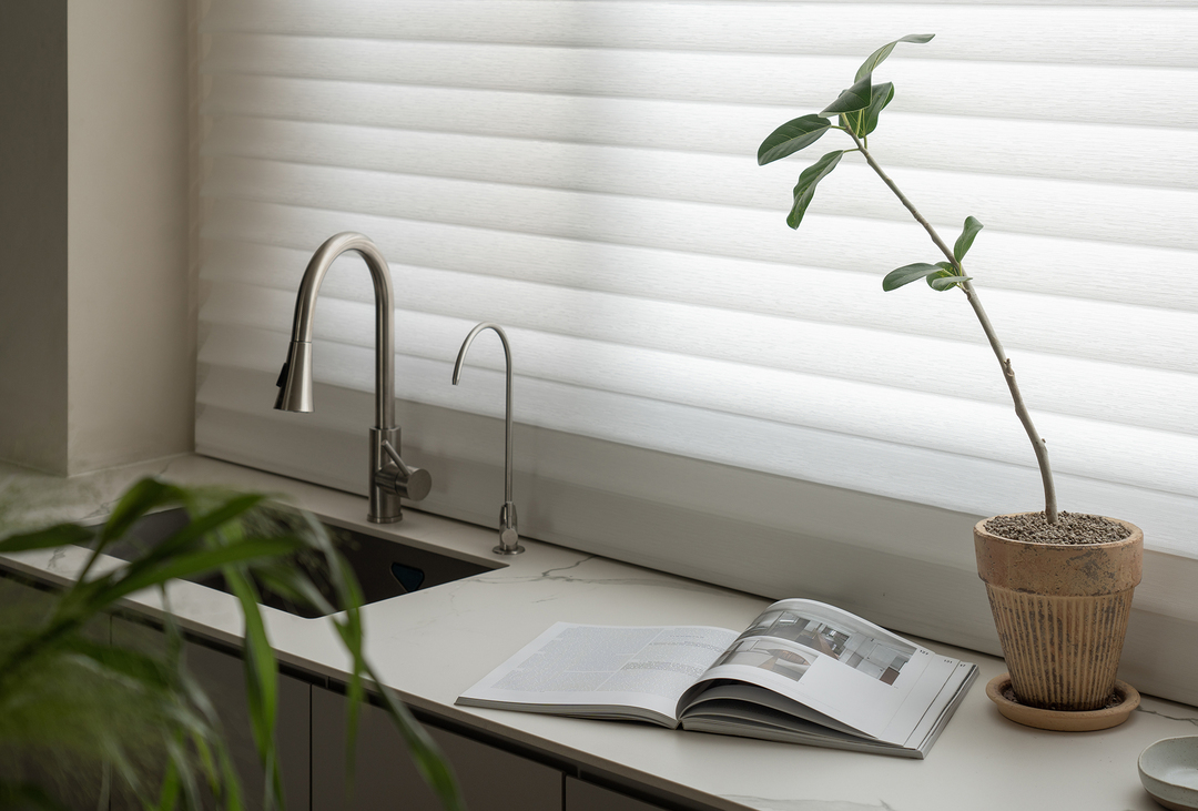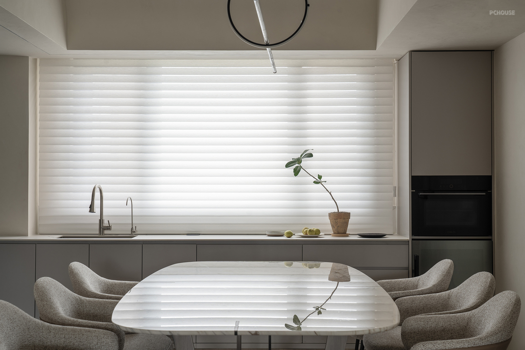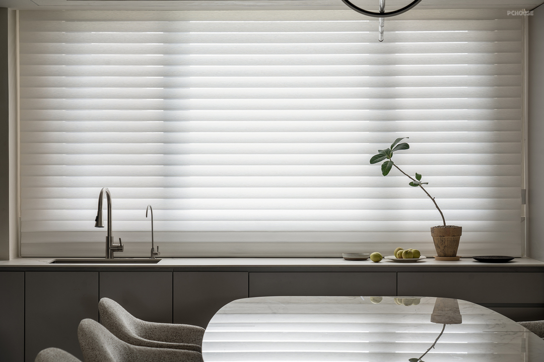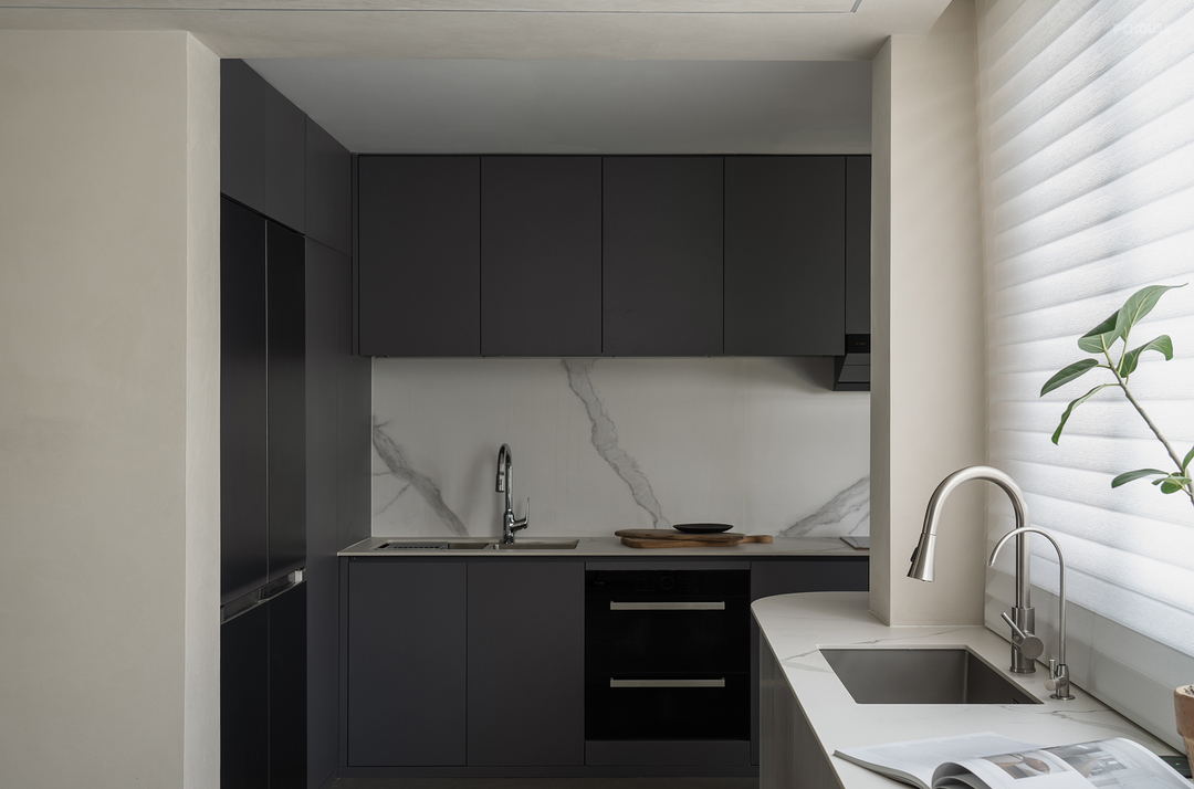 将中厨打开,并在餐厅靠窗部分增设一排柜体,打造出西厨区域,从而大幅增加了整体厨房的操作台面。
