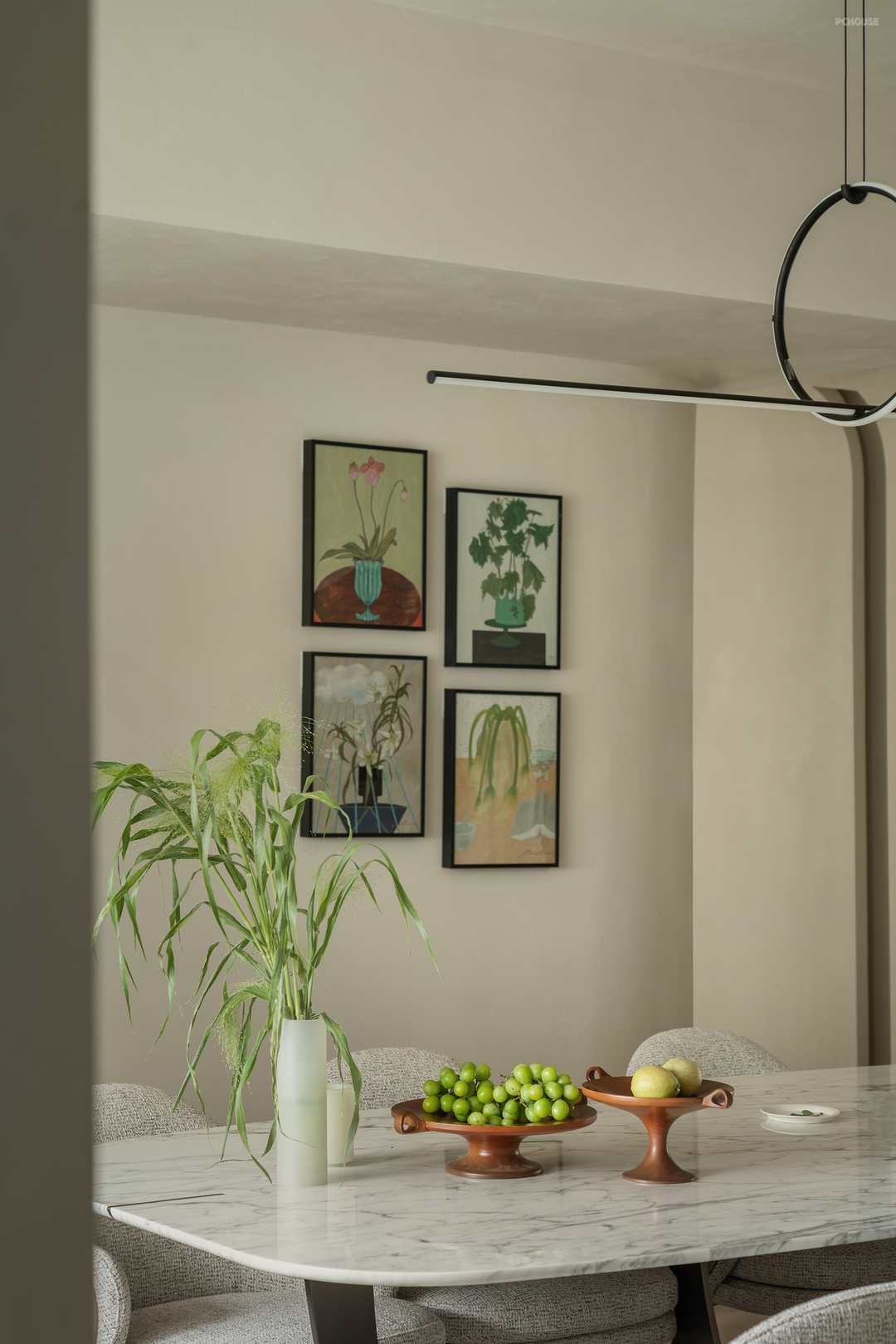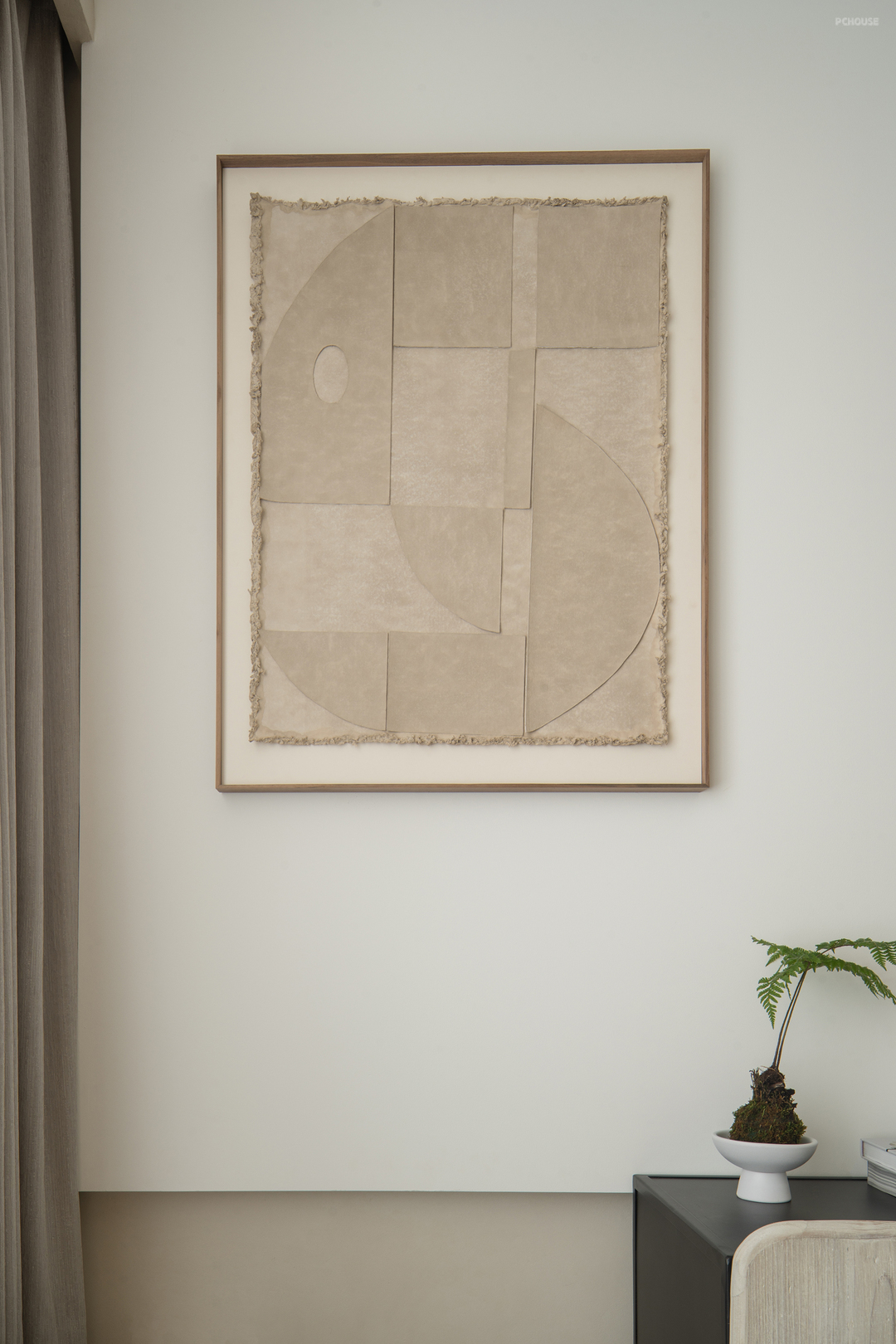 空间内还增添了精致的装饰元素,如艺术画作和小型绿植,进一步提升了整体的美感和舒适度。