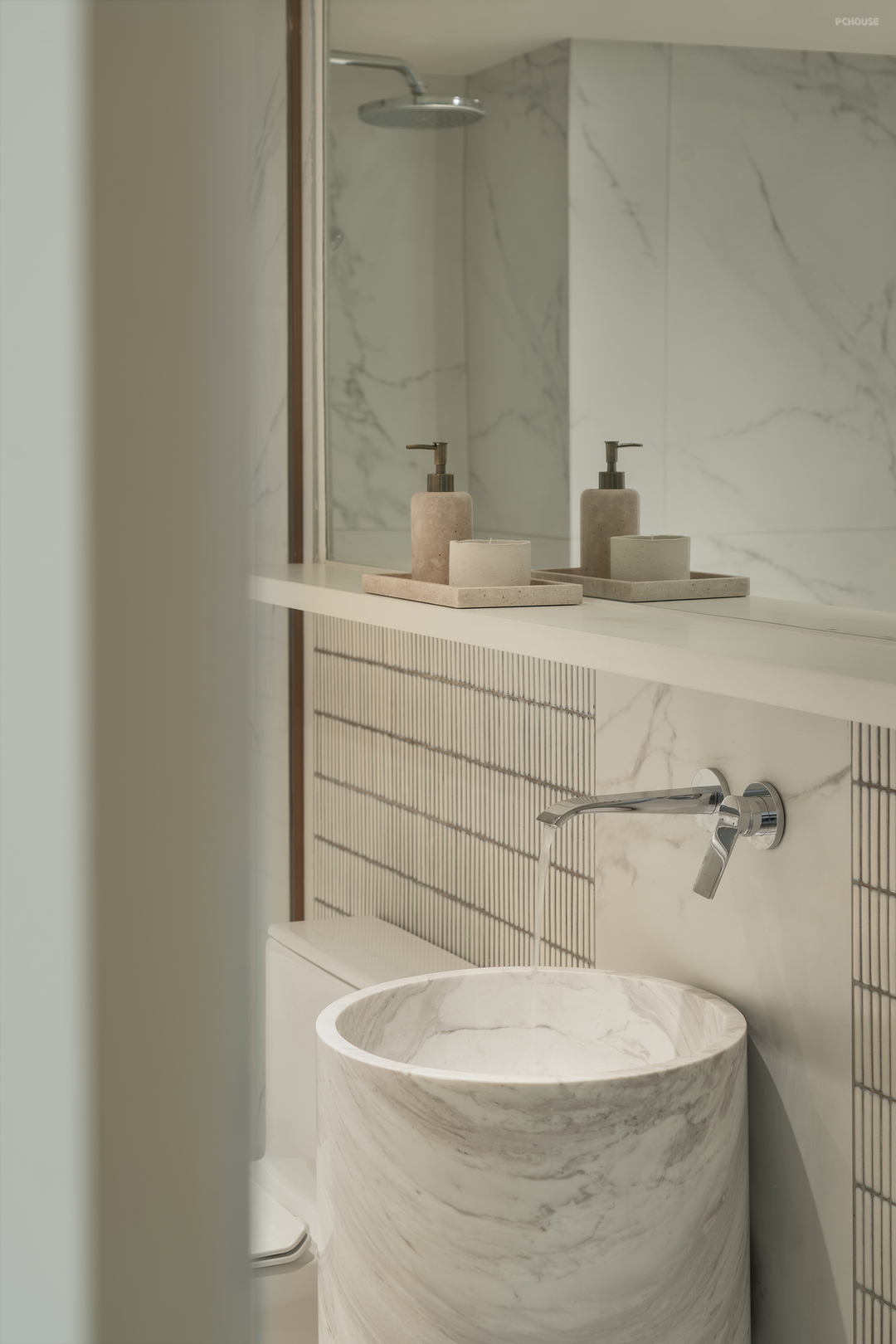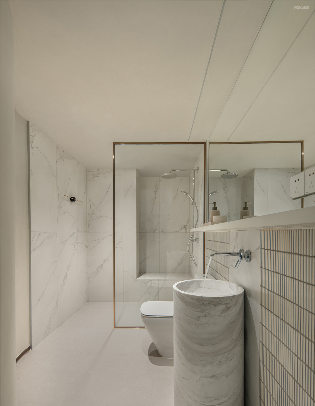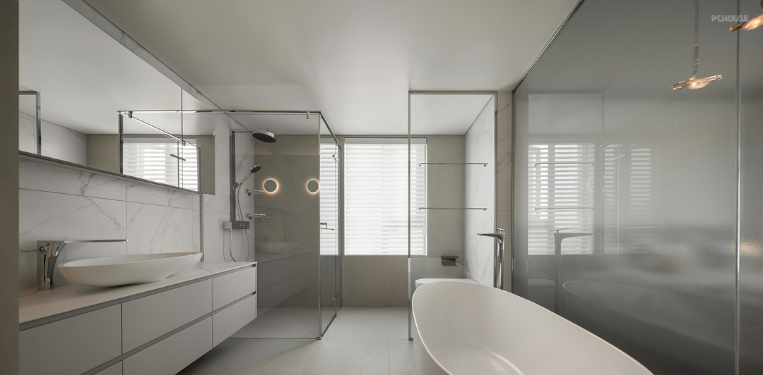 主卫设计简洁明了,没有过多的装饰。壁灯和吊灯的光线营造出柔和的氛围,使得空间更加舒适。当人进入这个空间时,可以完全放松下来。