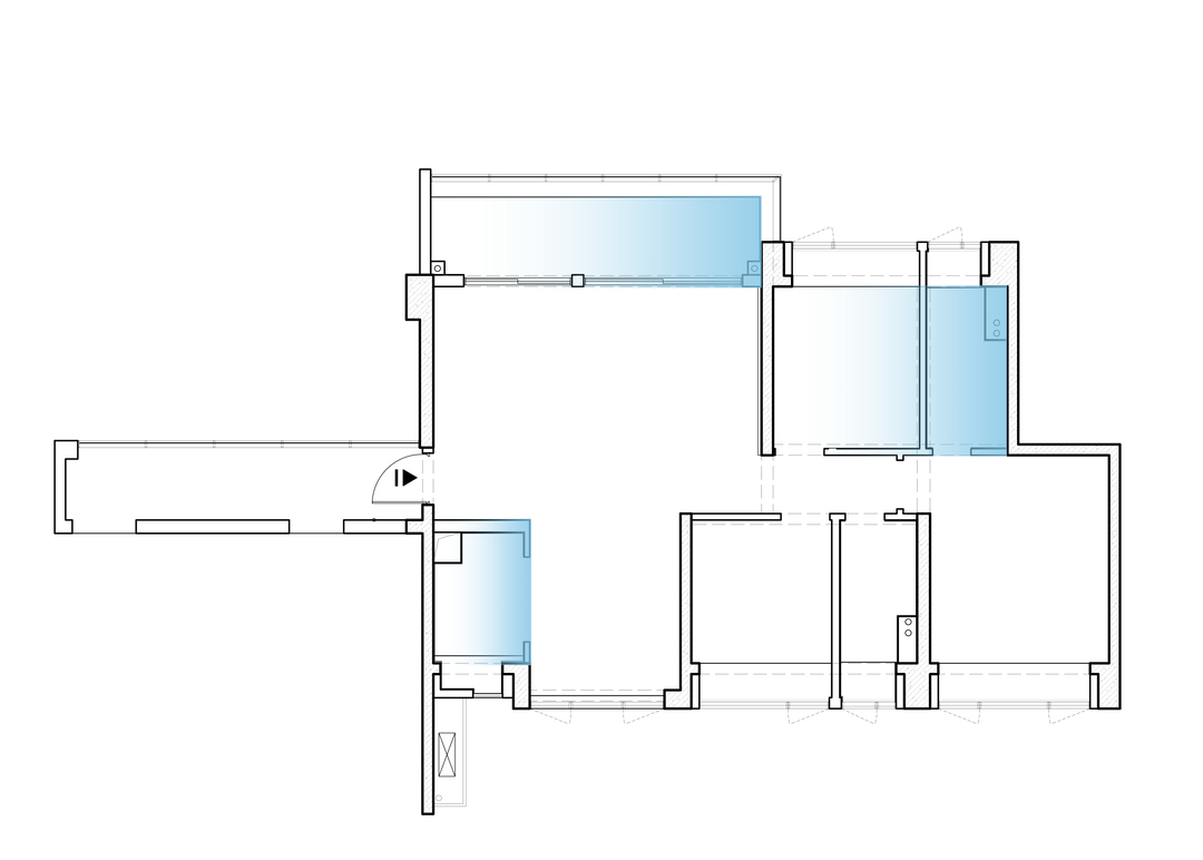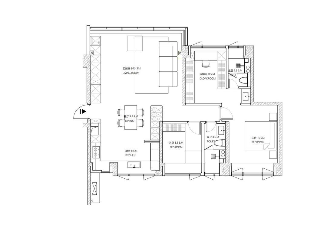 2、舍弃了一间多余的次卧,将改造成衣帽间,连通主卧设计为半开放式的大套间;