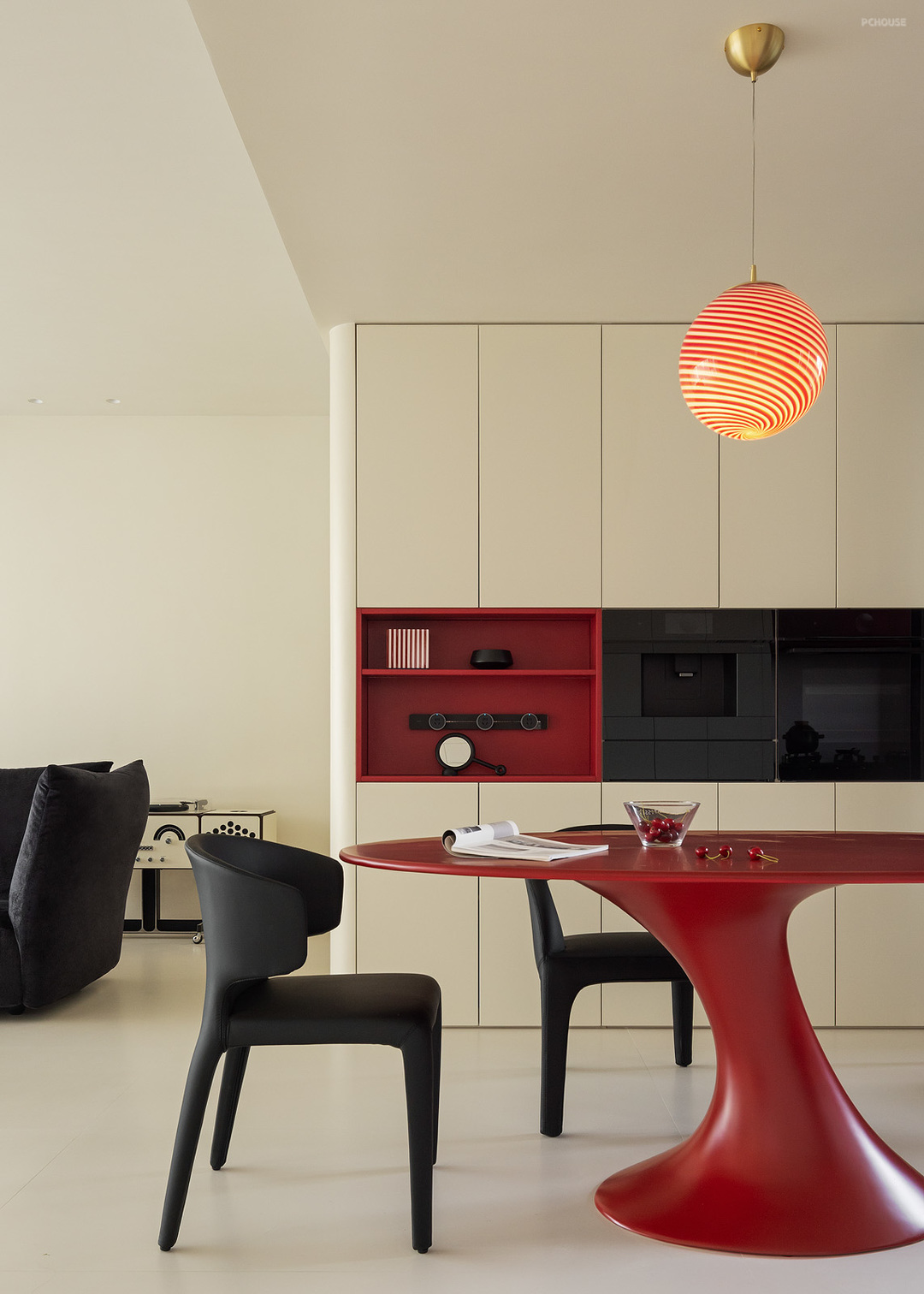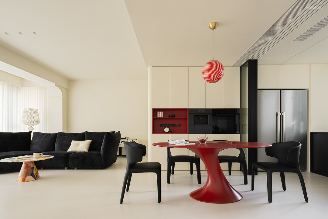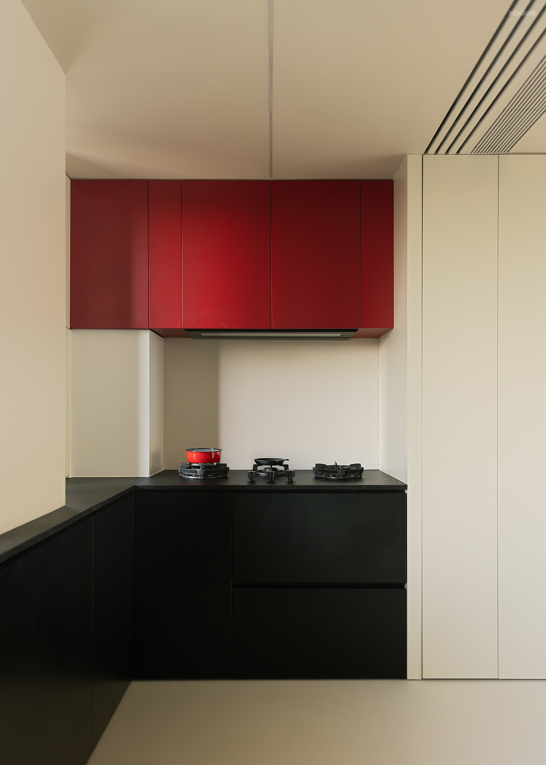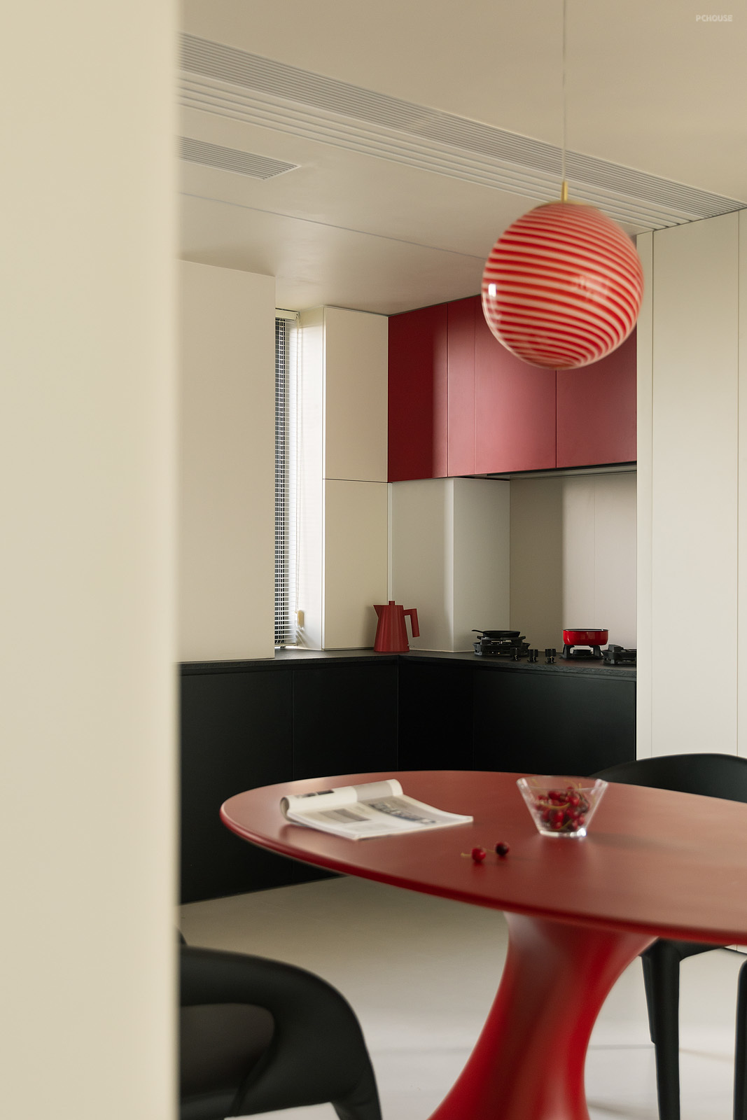厨房操作动线舒适便捷,台面利用岩板铺贴,暗色系的黑与餐桌炽热的红色形成对比,整体的黑红色系,在空间中流畅的连贯起来。
