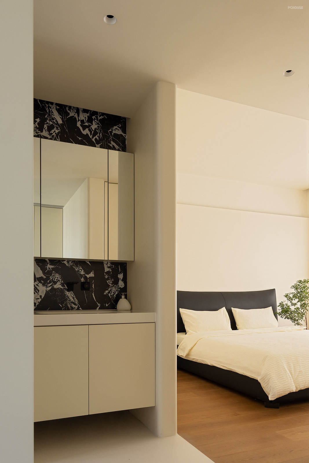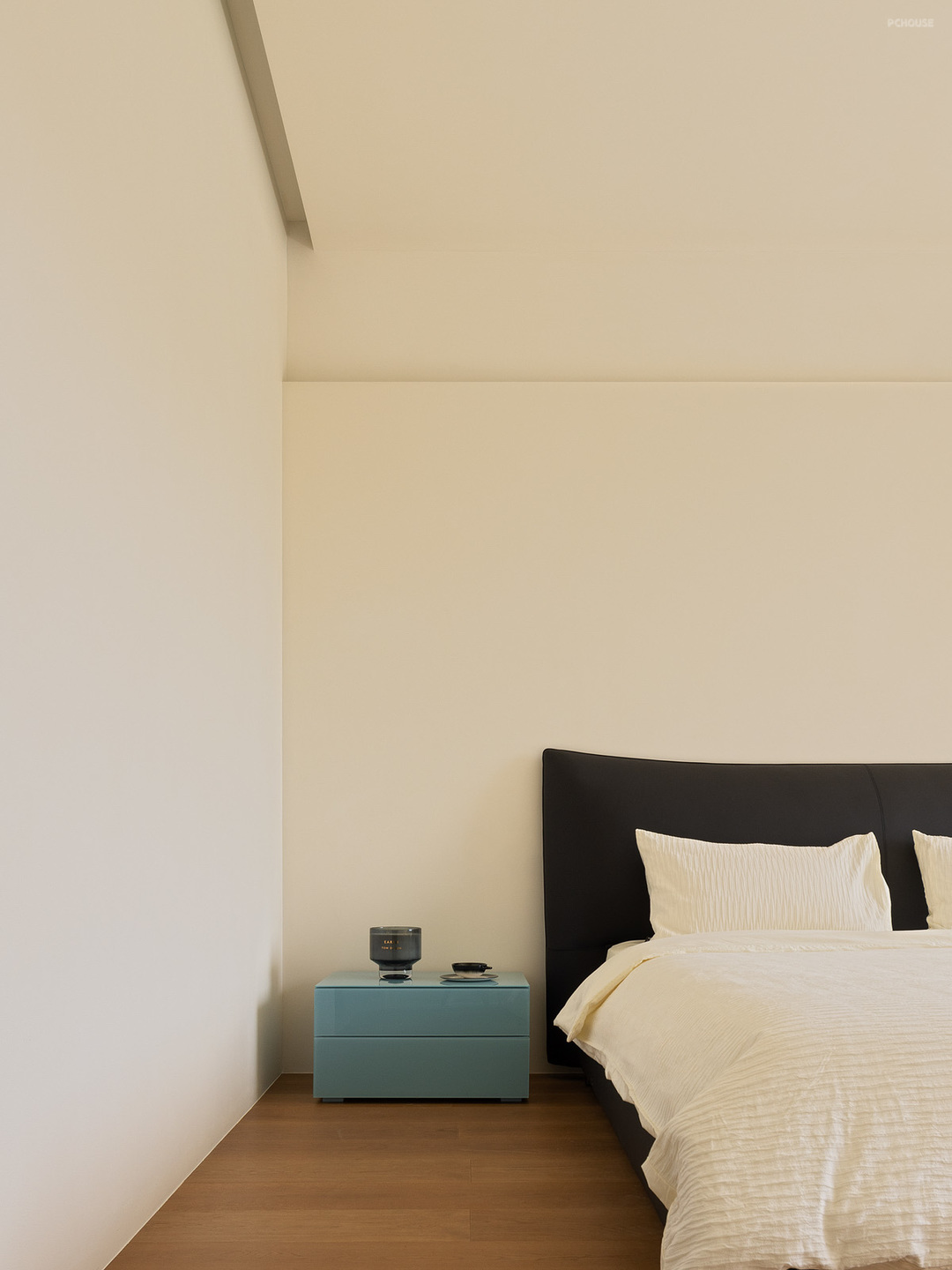 卧室空间,其深远的意义超越了简单的独处与私密性考量,通过精心挑选的柔和配色与不同的空间体块融合,将艺术美学渗透在空间中。