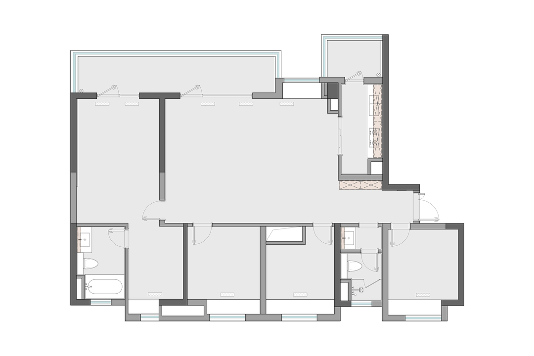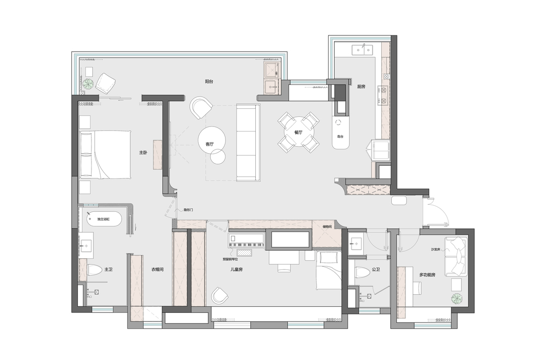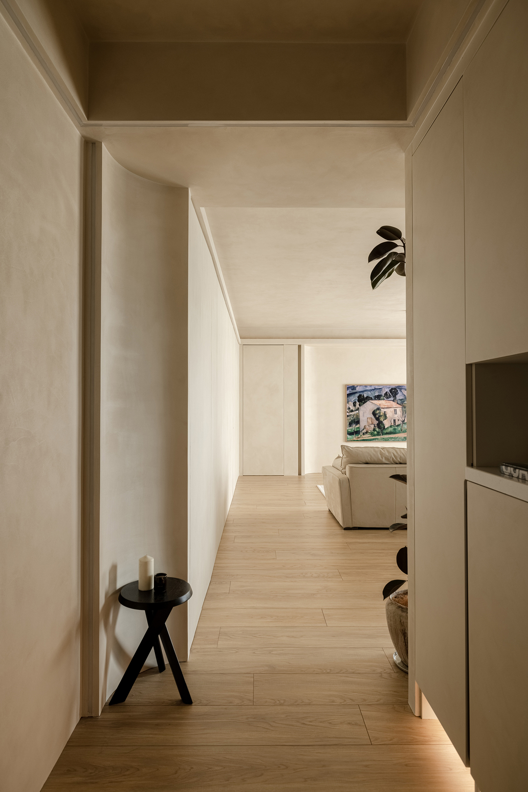 客厅比较长,但没有太多的收纳空间,于是在客厅走廊增加一长排柜体,保证了客厅的储物需求,且增加了一些弧形倒角,弱化空间的一通到底。