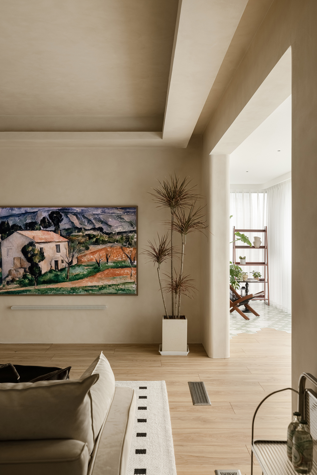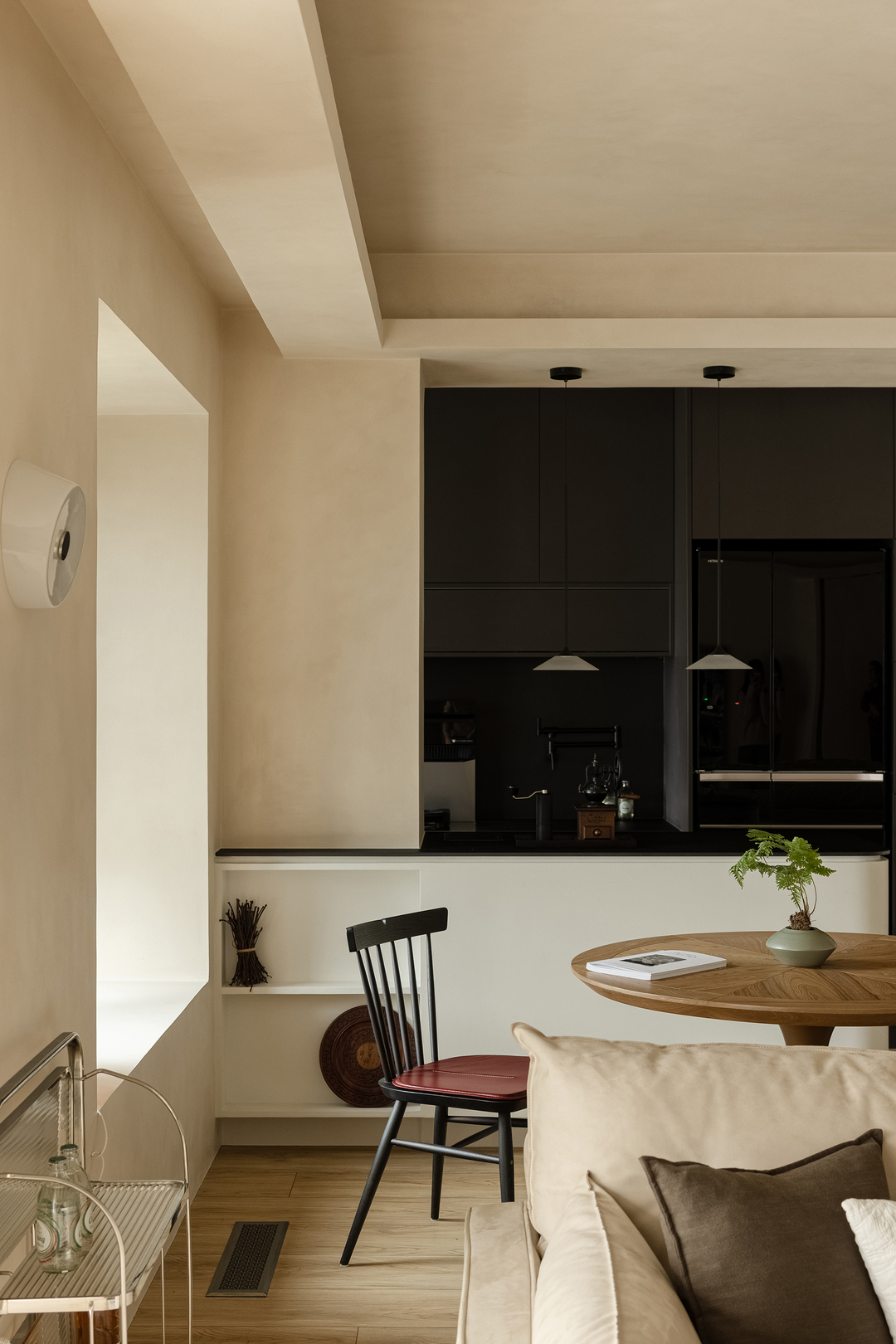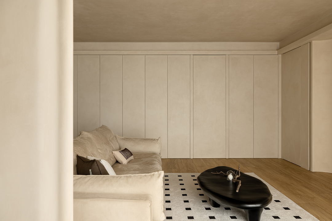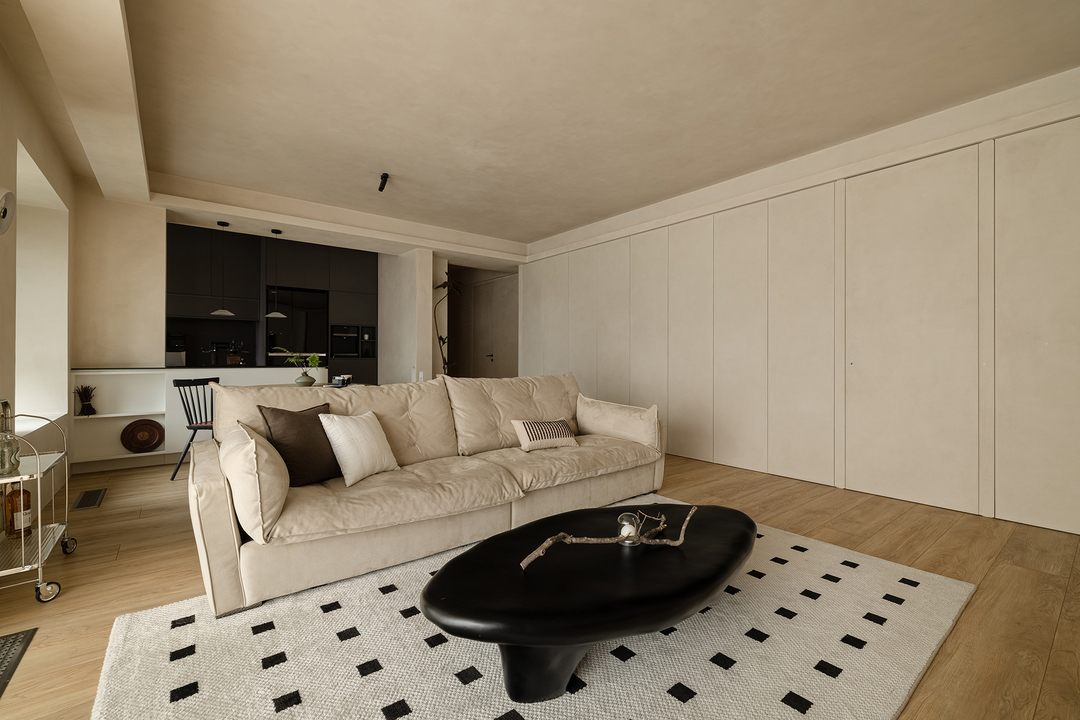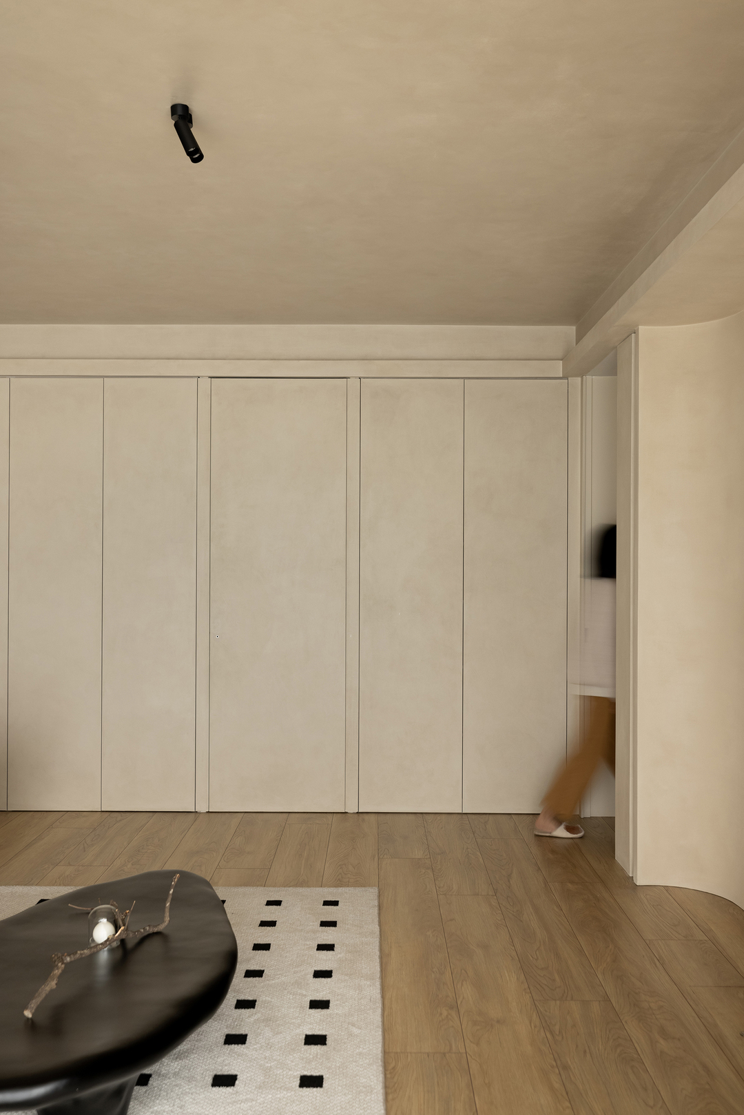 客厅以侘寂风为主,硬装方面极简主义风格搭配上弧形元素点缀,营造出一种简约温暖的氛围却又不失质感。墙面和顶面都采用暖白色调的艺术漆,强调了侘寂风的自然与朴素。