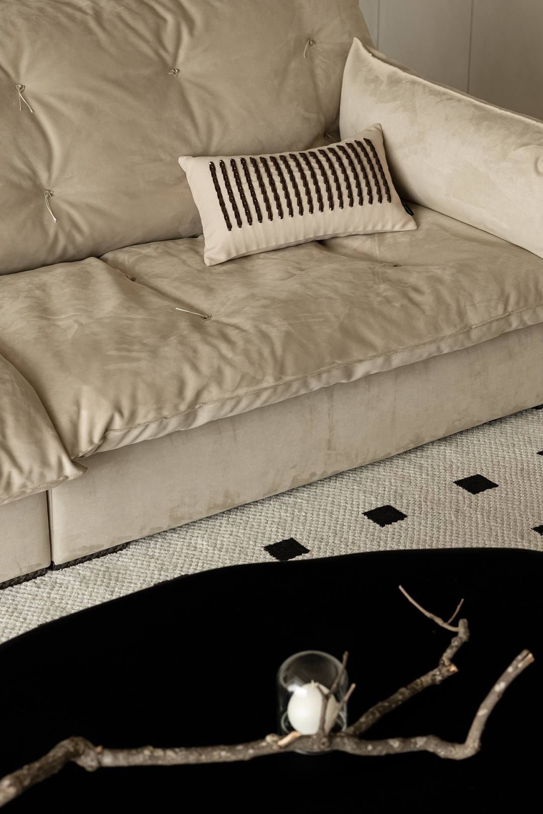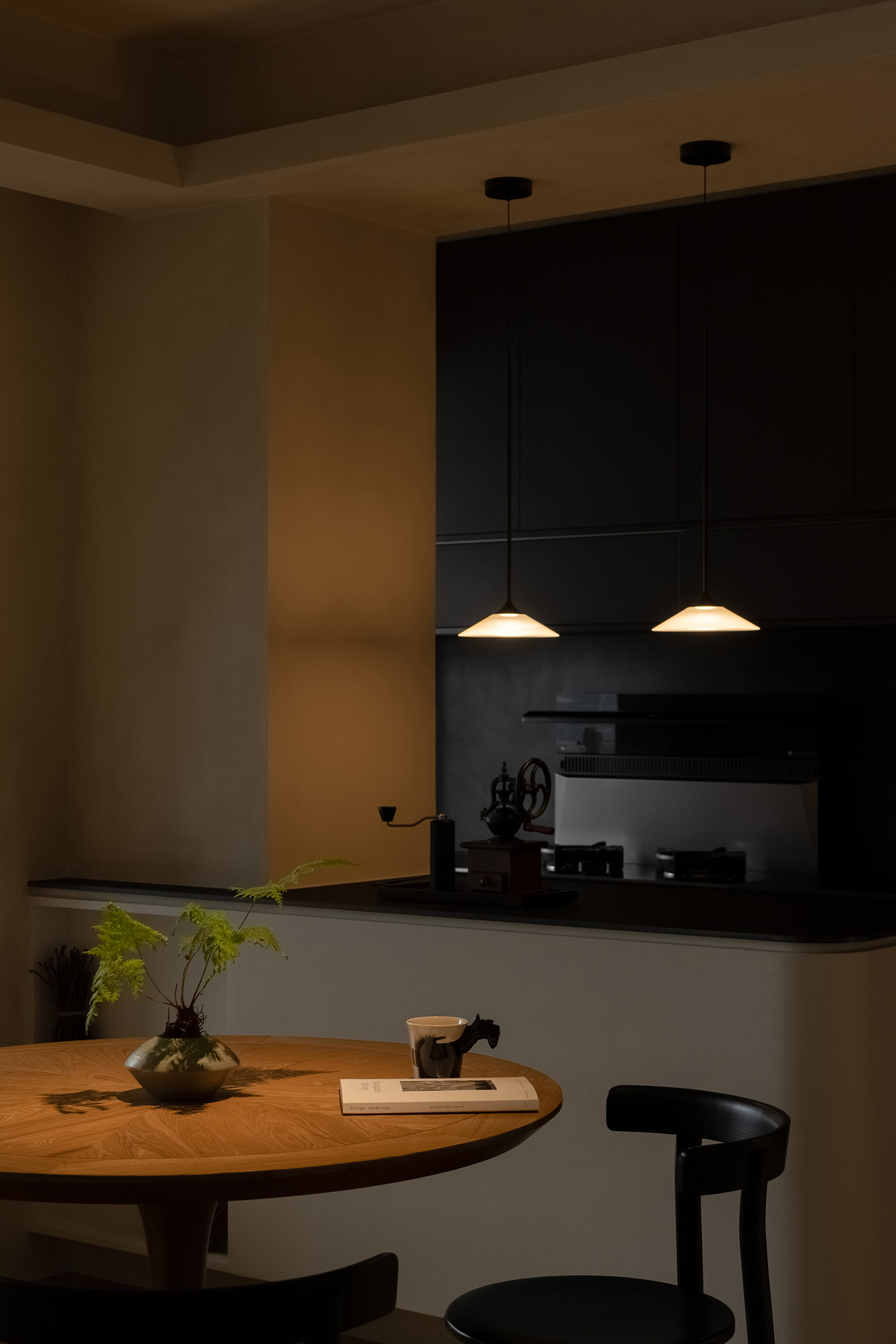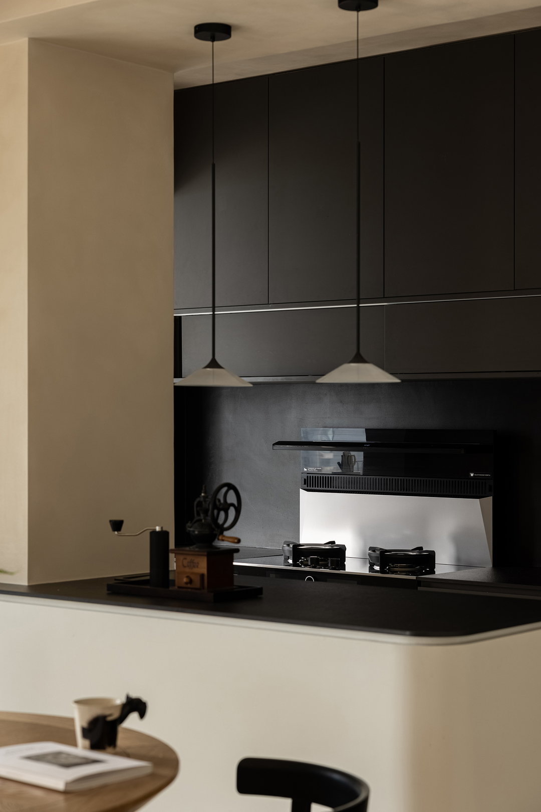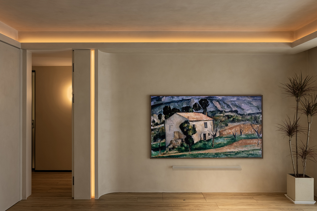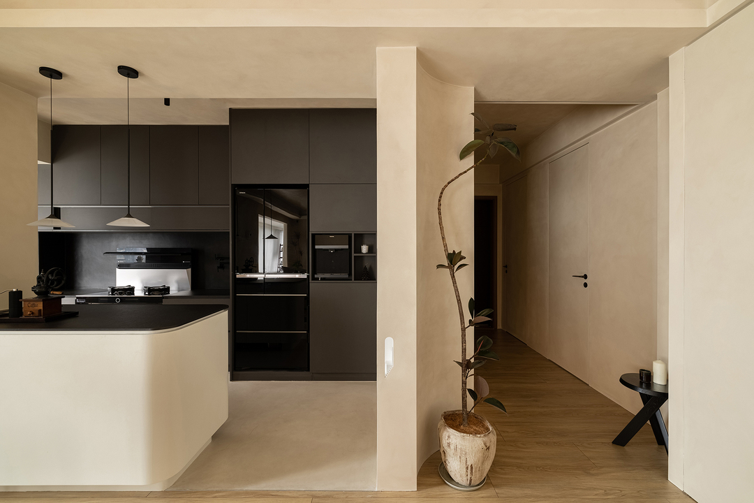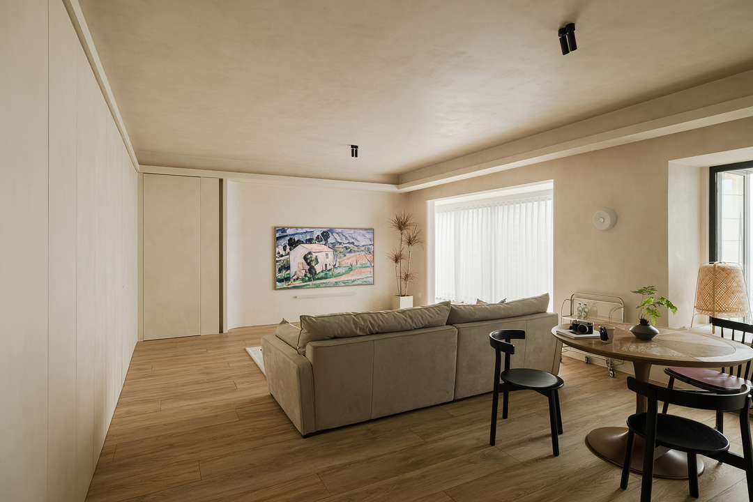 客厅以侘寂风为主,硬装方面极简主义风格搭配上弧形元素点缀,营造出一种简约温暖的氛围却又不失质感。墙面和顶面都采用暖白色调的艺术漆,强调了侘寂风的自然与朴素。