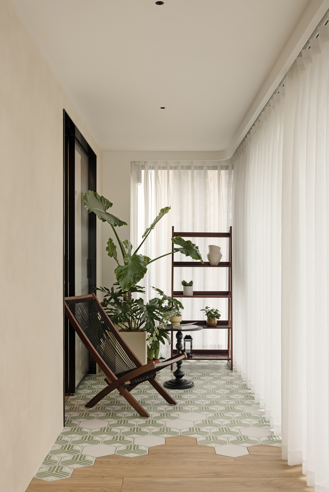 客厅与阳台采用木地板通铺,但在阳台的两端,我们分别设置了休闲区和洗衣区,休闲区有植物需要经常浇水,洗衣区也是用水较多的地方,为了减少木地板的损坏,以及考虑到便于打扫,于是设计师选择用六角瓷砖与木地板进行拼接。