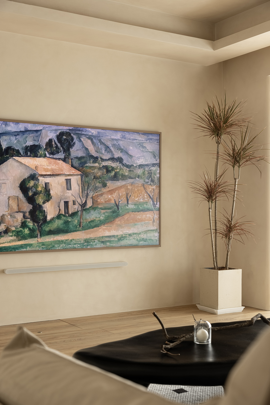 家具方面,设计师选择了偏中古风格的家具,木质元素让空间更具复古韵味。画框电视的点缀,让整个空间艺术氛围满满。