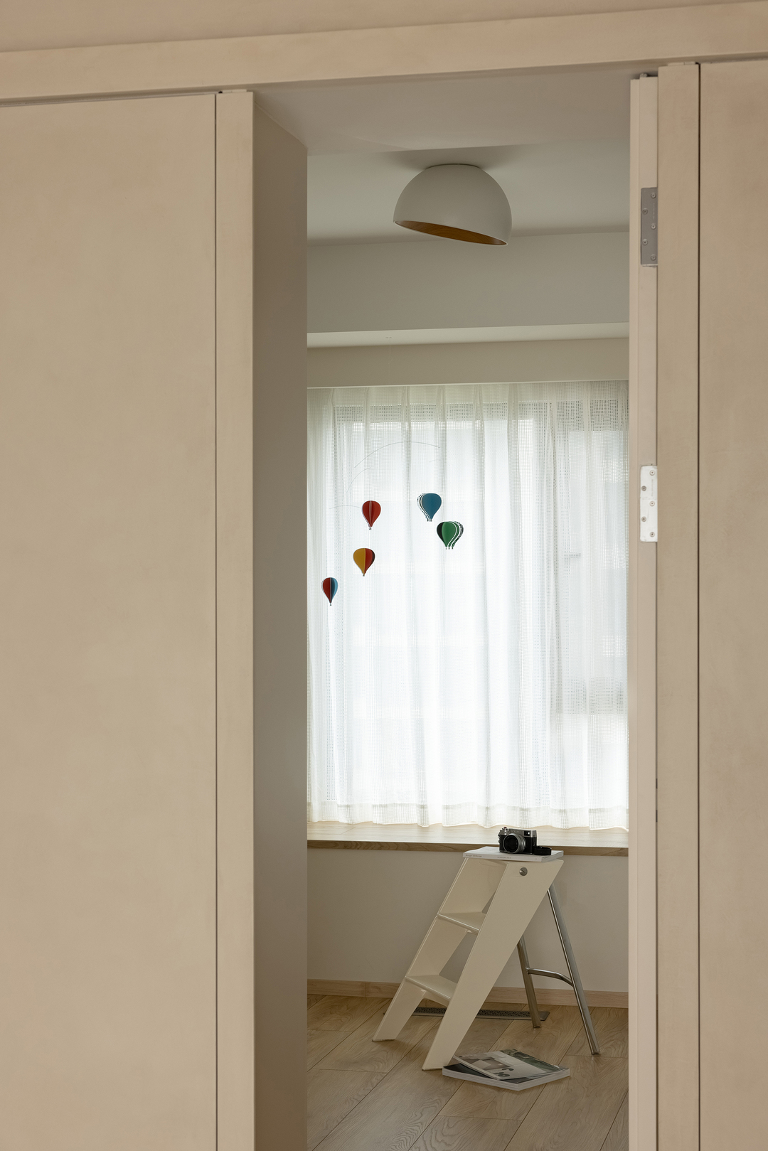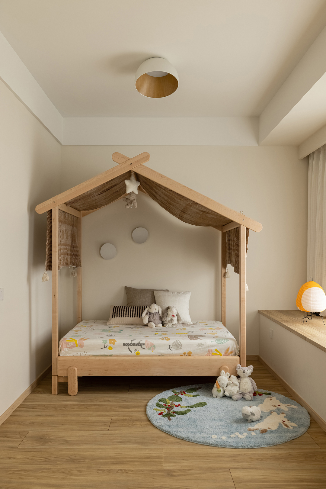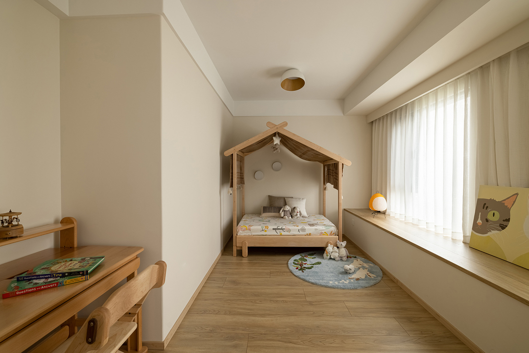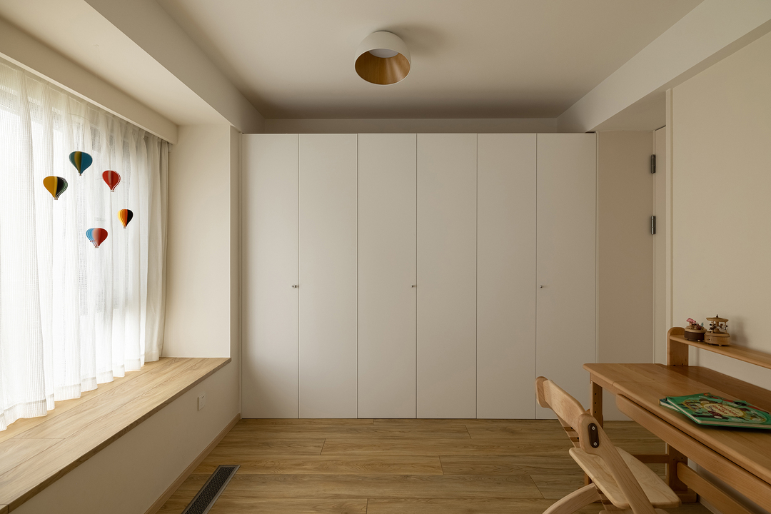原始的两个小次卧面积很小,还被飘窗占据了一部分面积,设计师将两个次卧打通形成一个开阔的儿童房,同时满足了小朋友的学习、兴趣爱好以及收纳等功能。