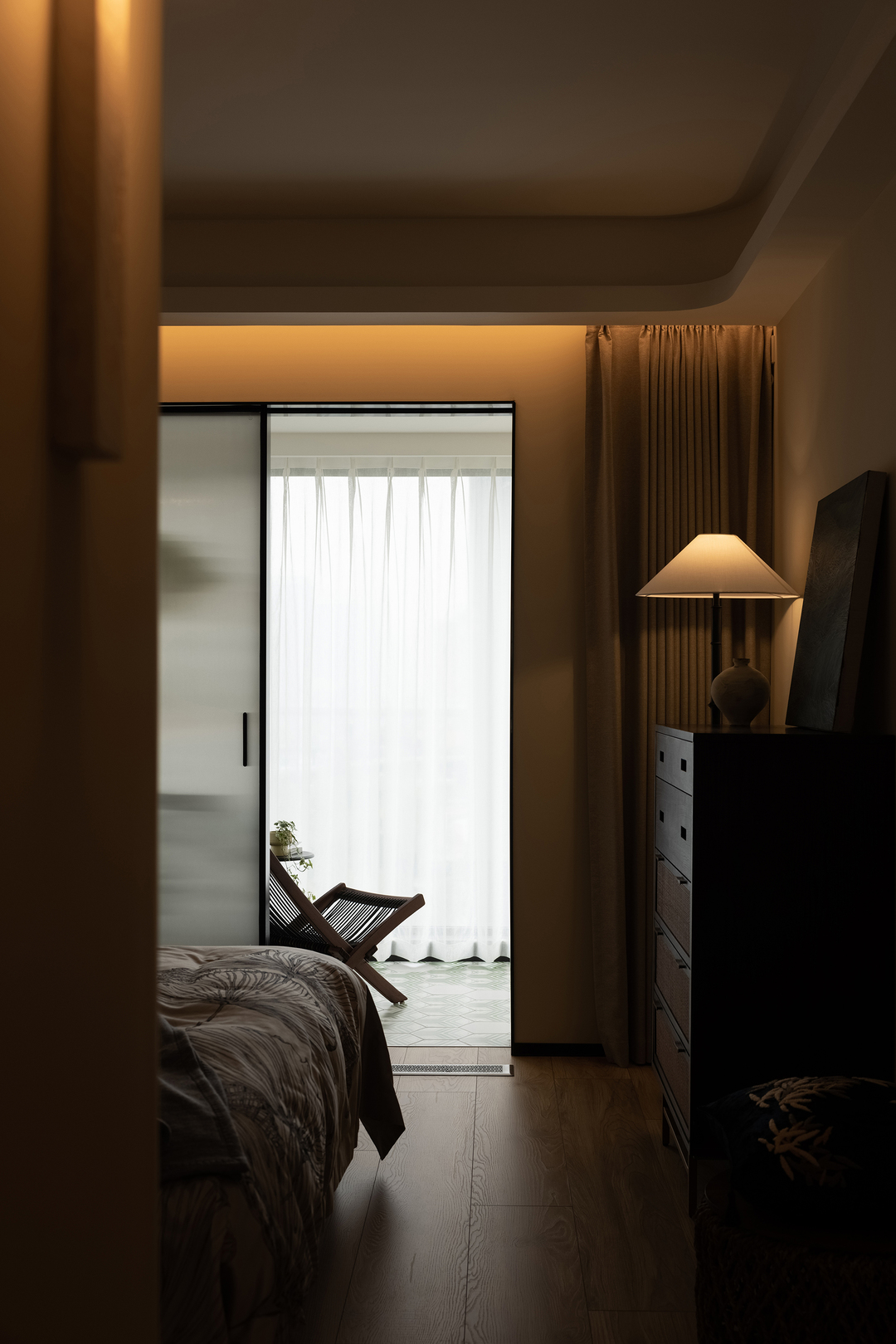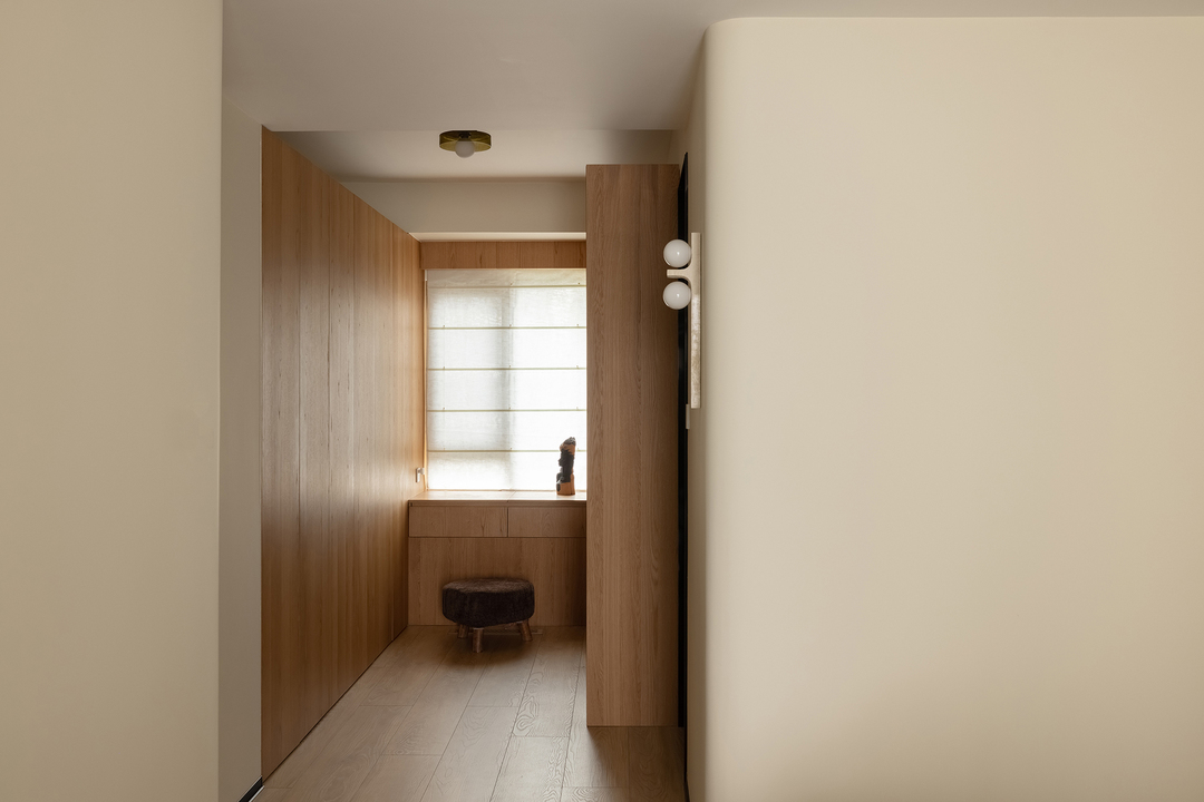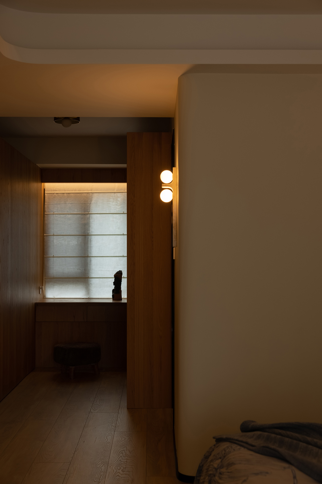 入户大门正对主卧门,隐私性比较差,且卧室开门方向会影响衣帽间的使用,于是设计师将主卧门往外推了40公分且改为右开,使得过道不会有过多的遮挡。