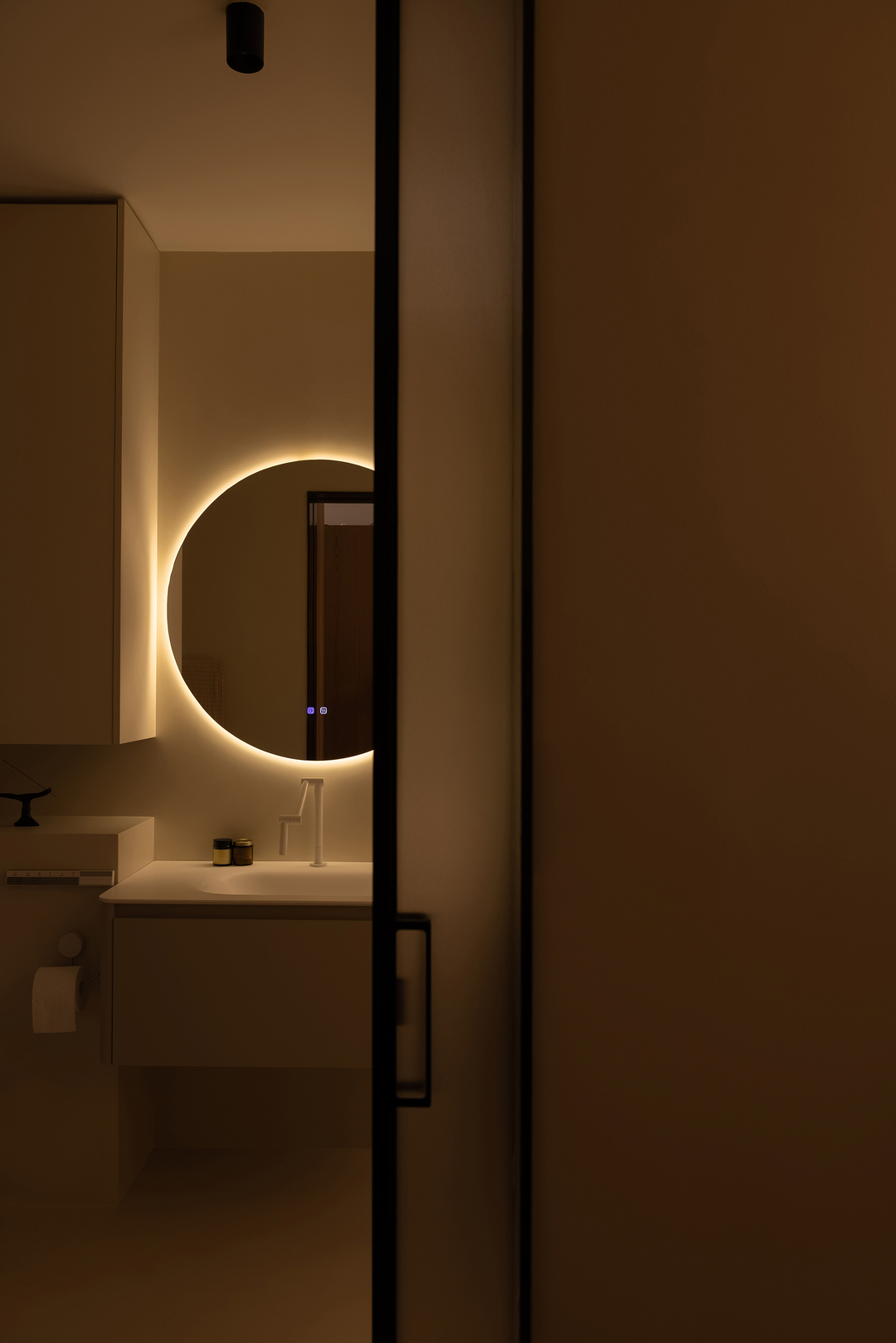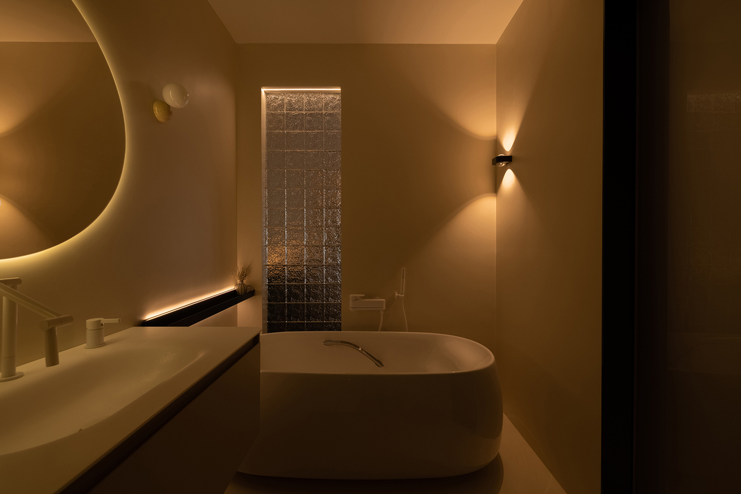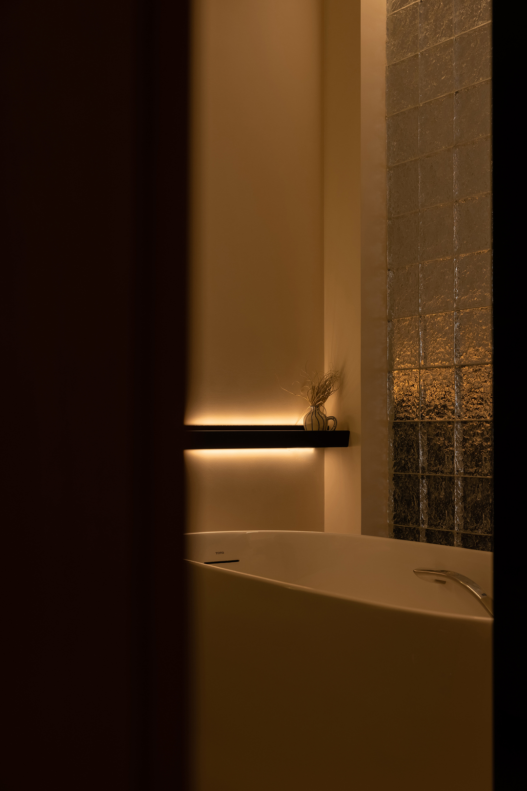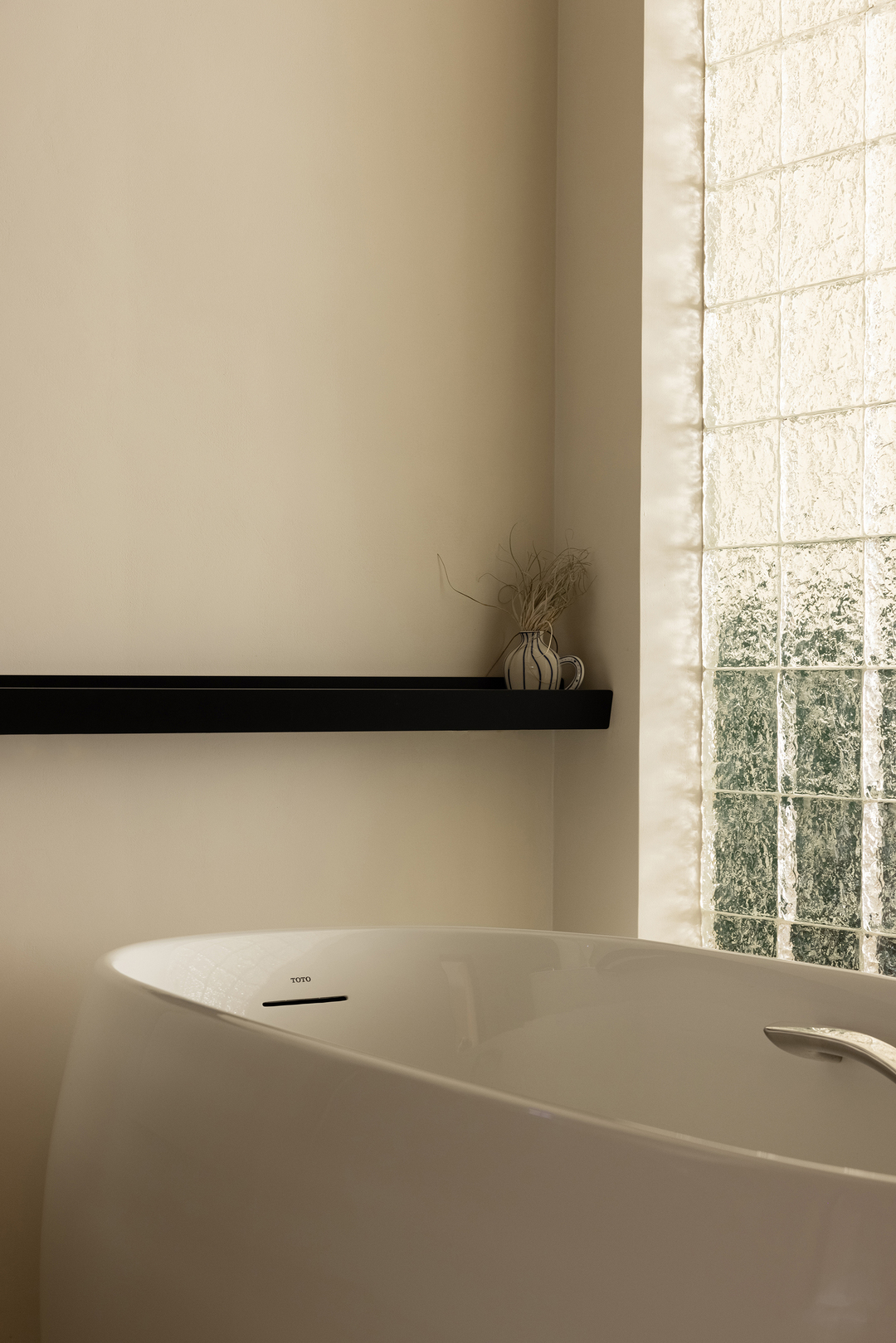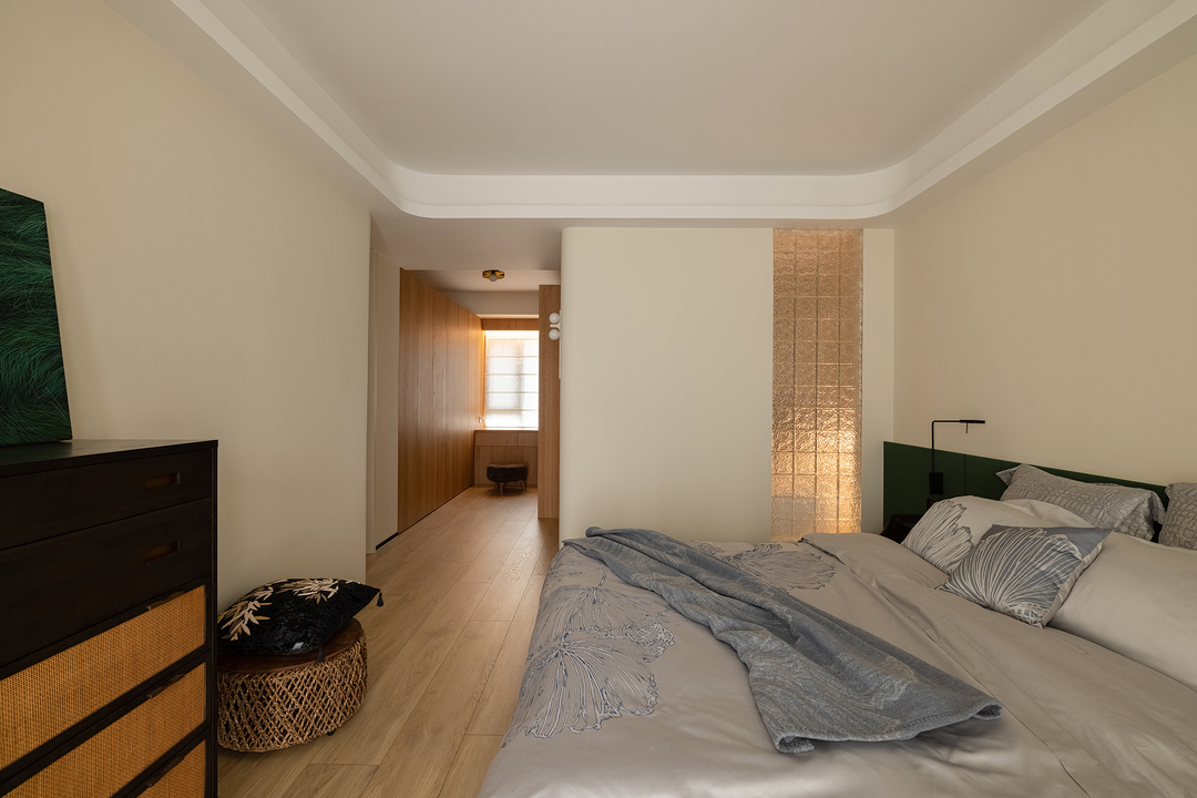 原始卫生间面积较小,只有一个浴缸位,缺少淋浴,日常使用不太方便,设计师将卫生间外扩一部分,增加了淋浴区,外扩出来的墙体也刚好形成了主卧进门玄关,解决了隐私问题。