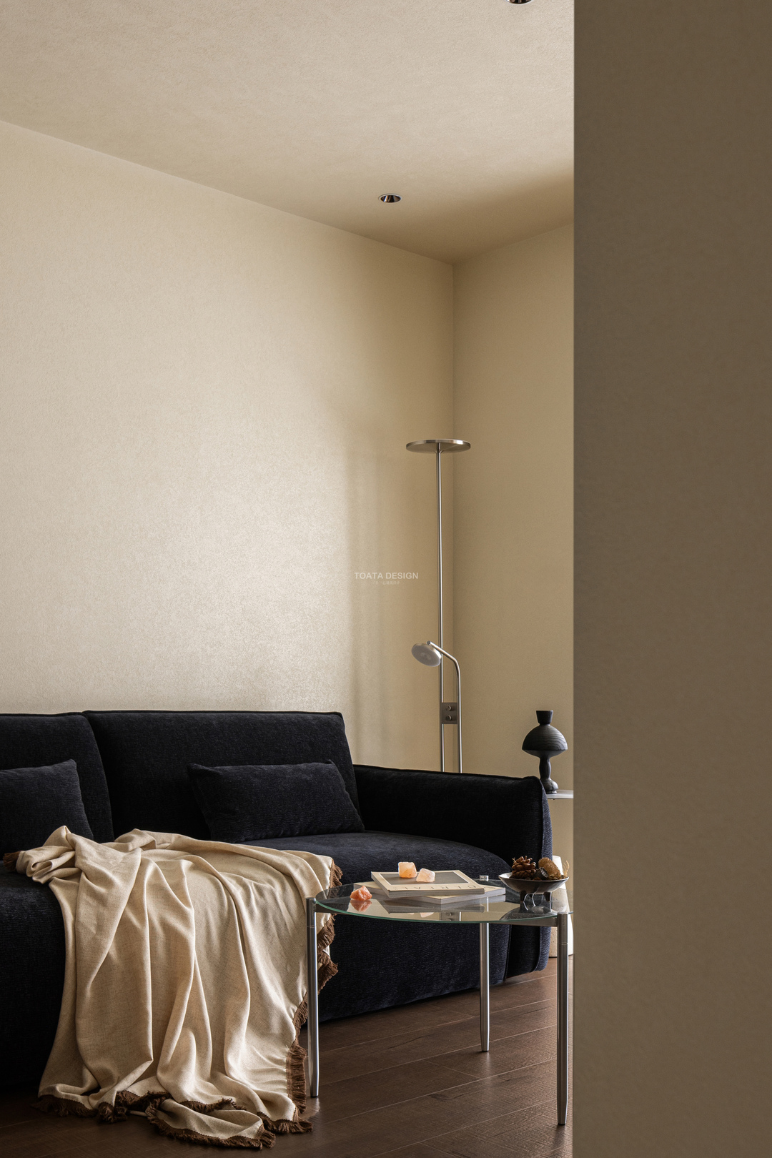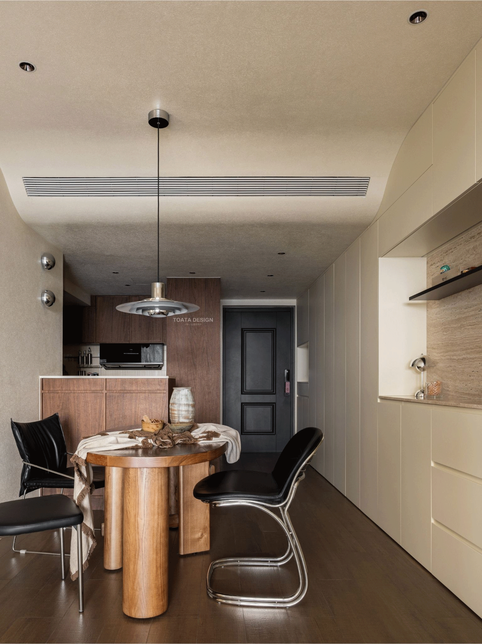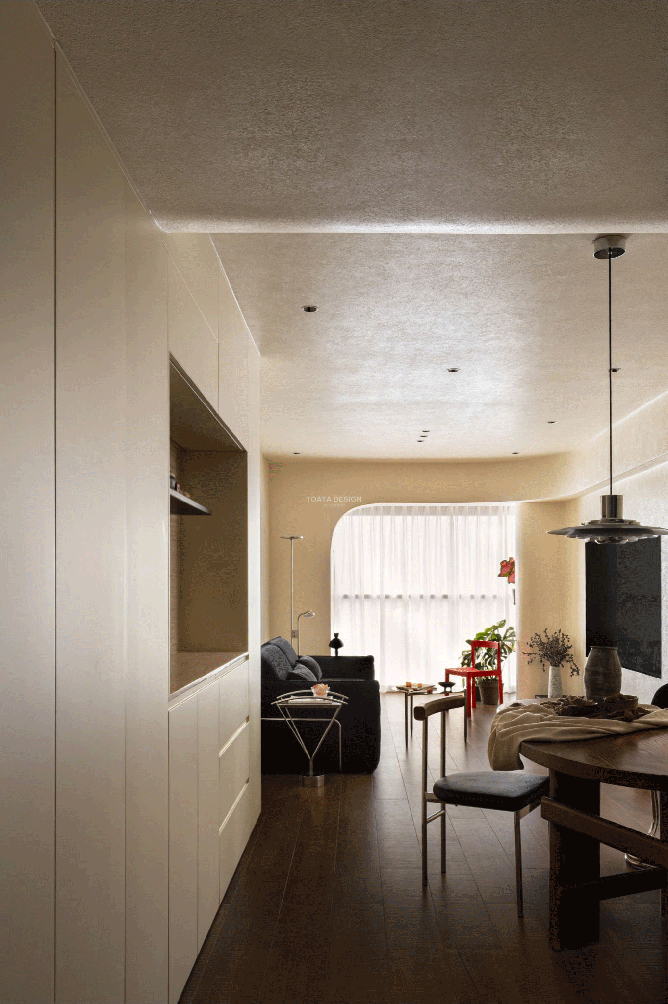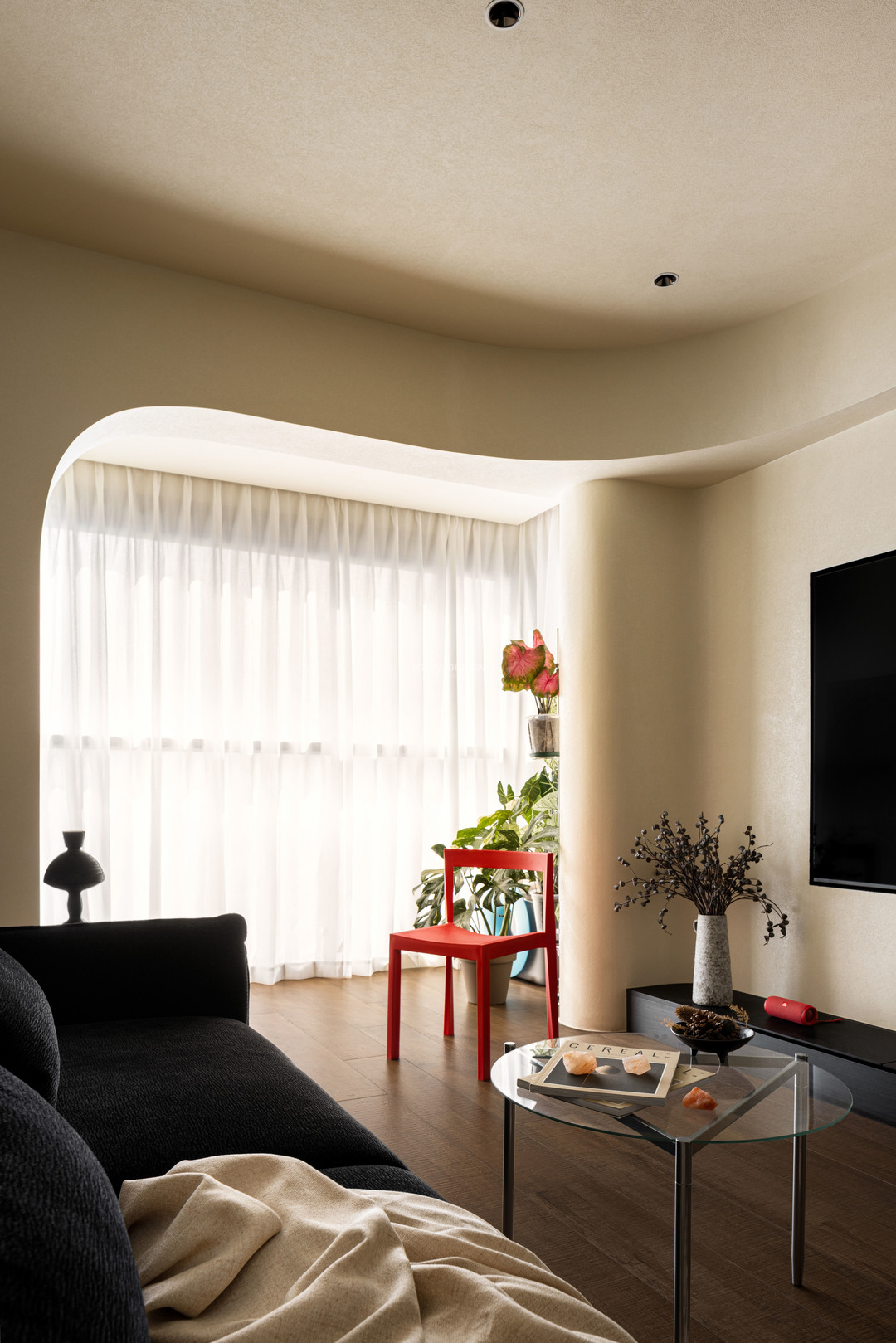 设计师融入了弧形天花的元素,柔和的曲线顺着空间轮廓自然延伸。一方面,它打破了方正空间的单调感,空间多了几分灵动与层次;另一方面,利用曲线的导向性和包裹感,弱化了棱角带来的生硬感,让屋主能感受到松弛、舒适的氛围,无论是家人围坐聊天,还是独自休憩,都格外放松