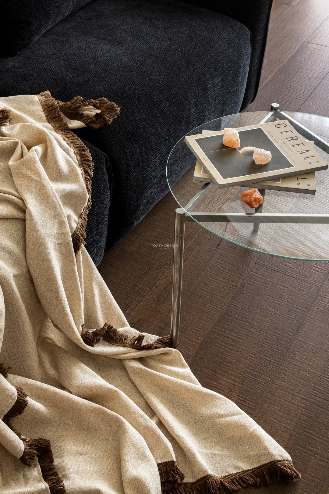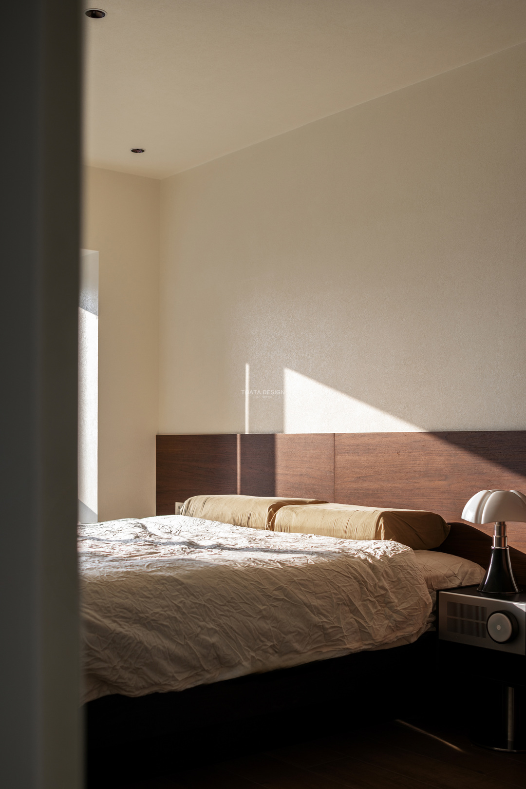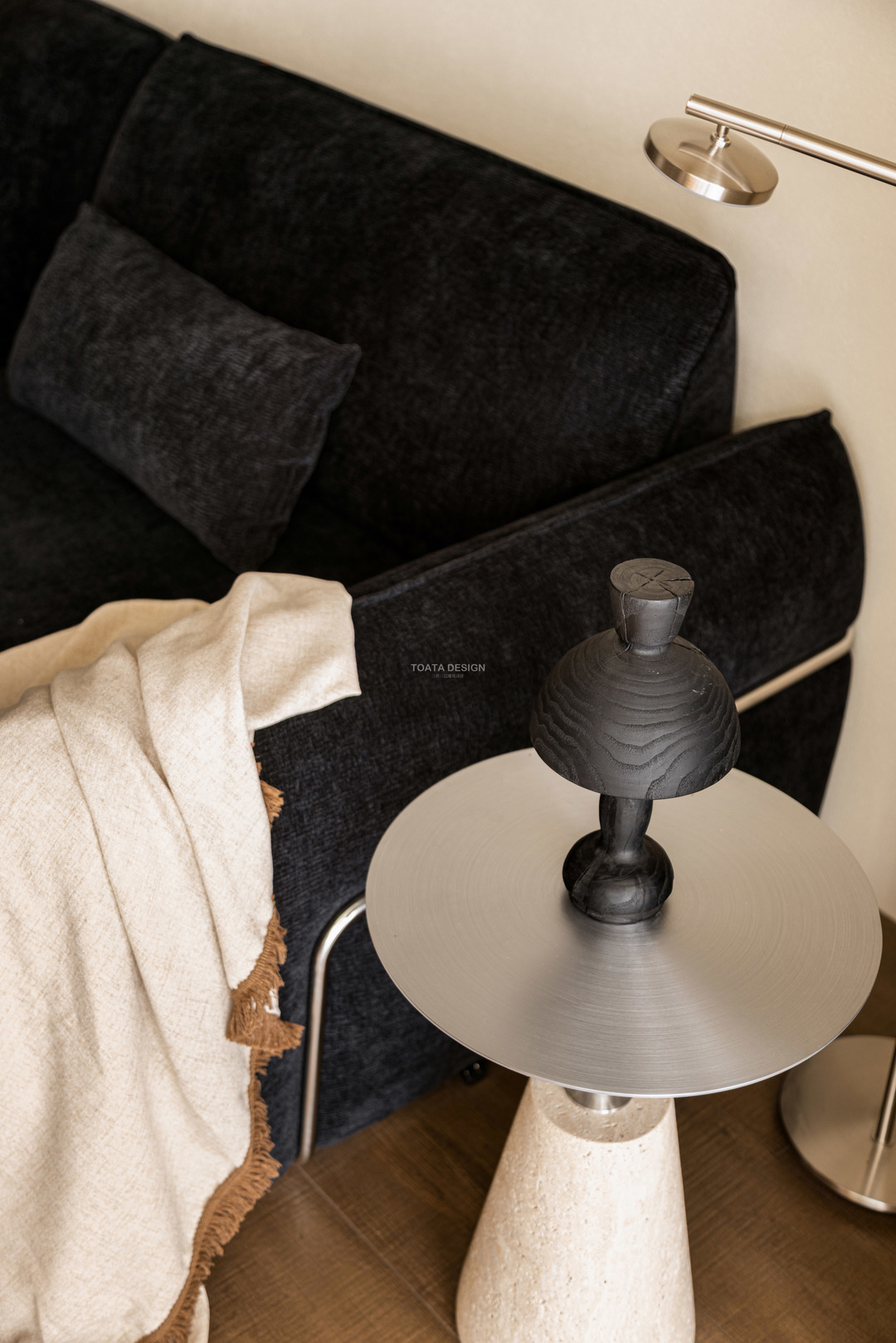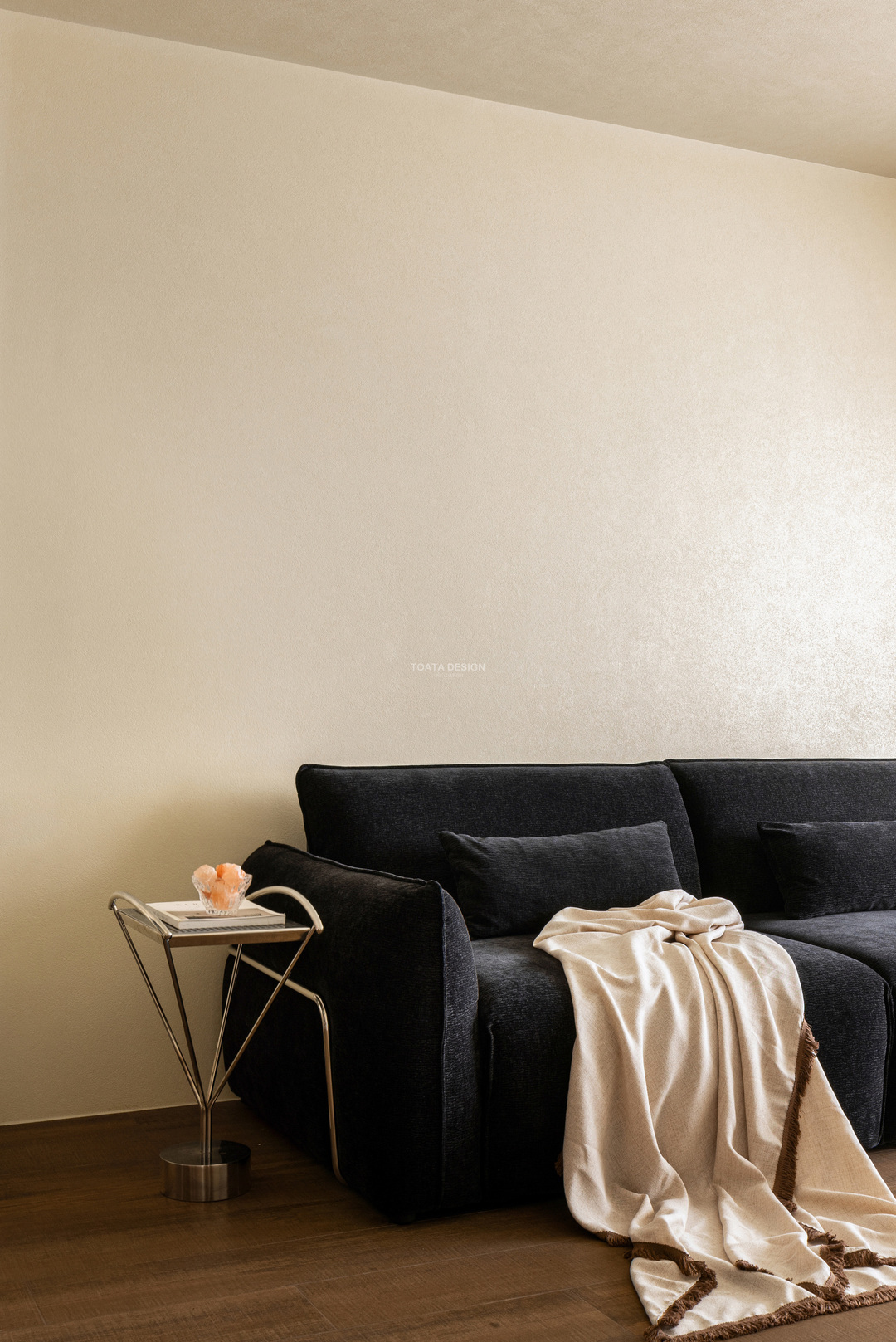 设计师融入了弧形天花的元素,柔和的曲线顺着空间轮廓自然延伸。一方面,它打破了方正空间的单调感,空间多了几分灵动与层次;另一方面,利用曲线的导向性和包裹感,弱化了棱角带来的生硬感,让屋主能感受到松弛、舒适的氛围,无论是家人围坐聊天,还是独自休憩,都格外放松