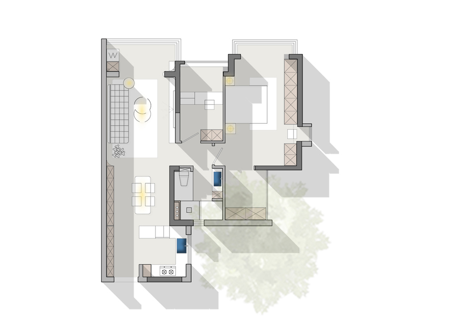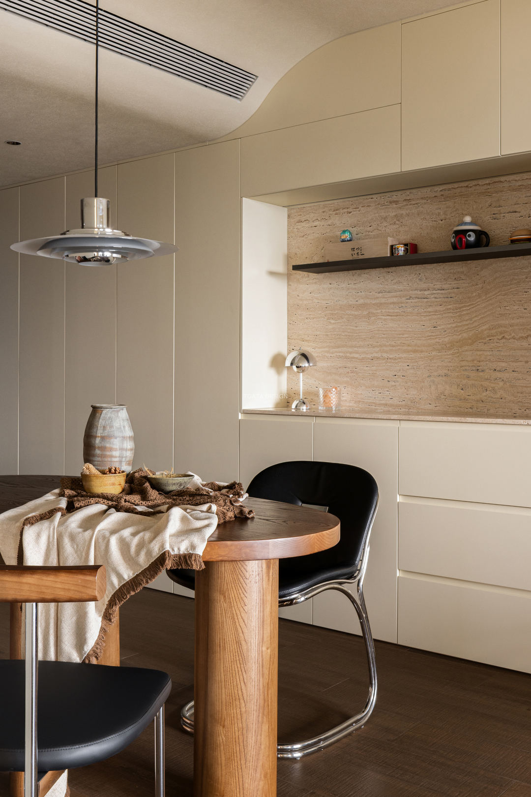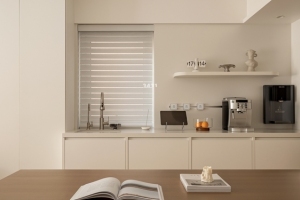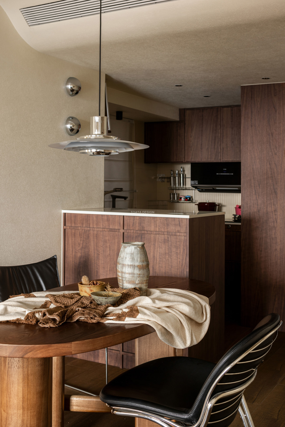 开放式厨房与岛台的组合,堪称全屋的灵魂所在。它不仅仅是一个备餐平台,更是一个集交流、休闲与美食于一体的家庭核心区。作为一道通透的隔断,岛台划分出厨房与餐厅的界限,既保持了视野的通透与流畅,又让烹饪、就餐时的家庭成员实现自由互动,无形中凝聚了家的烟火气与温情