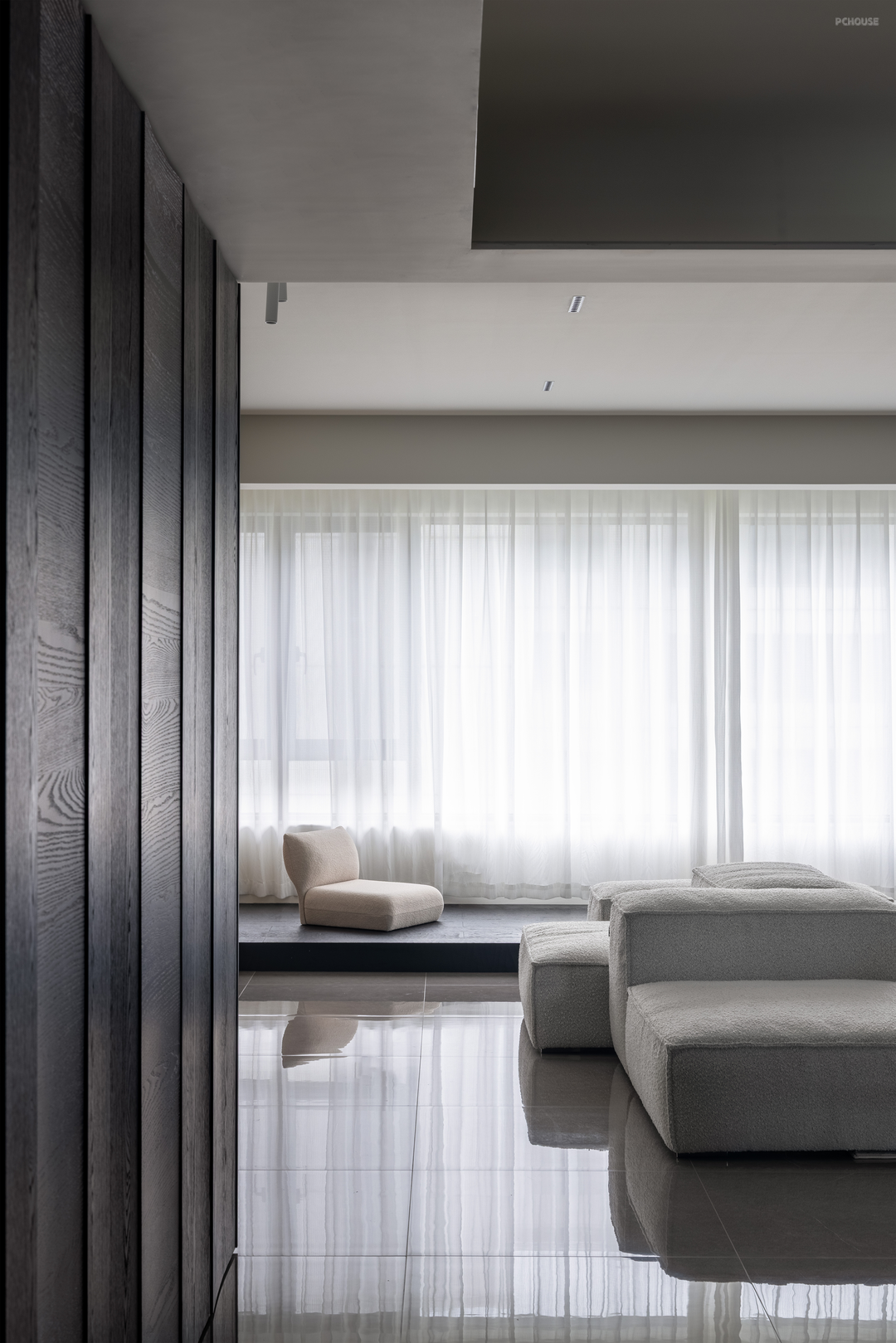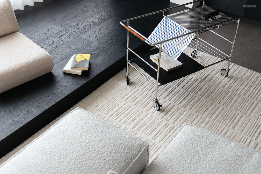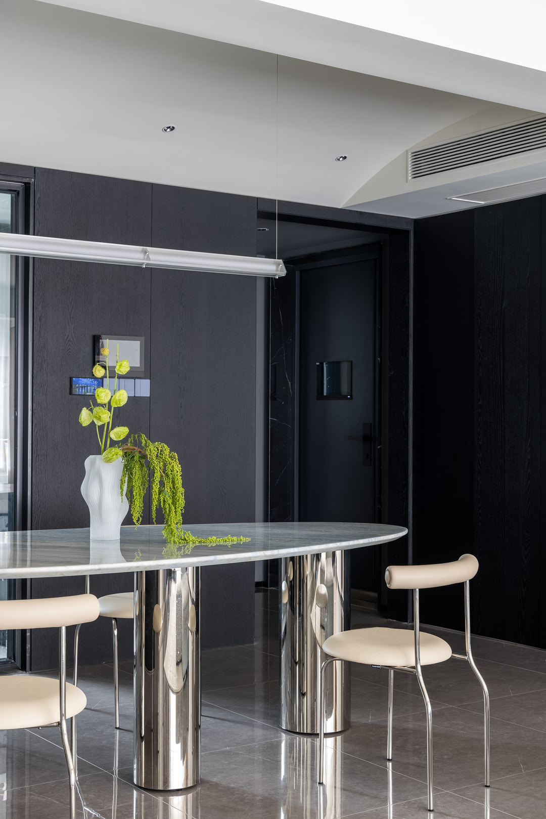 黑色的天然木纹拥有极强的装饰感,从玄关的鞋柜到餐厅的储物柜、墙体饰面,连贯的黑色为家增添质感。在餐厅,为了避免过多柜体带来的呆板感,我们特意定制了曲面柜门,弯曲面上细微的光影深浅,带来家的灵动变化。