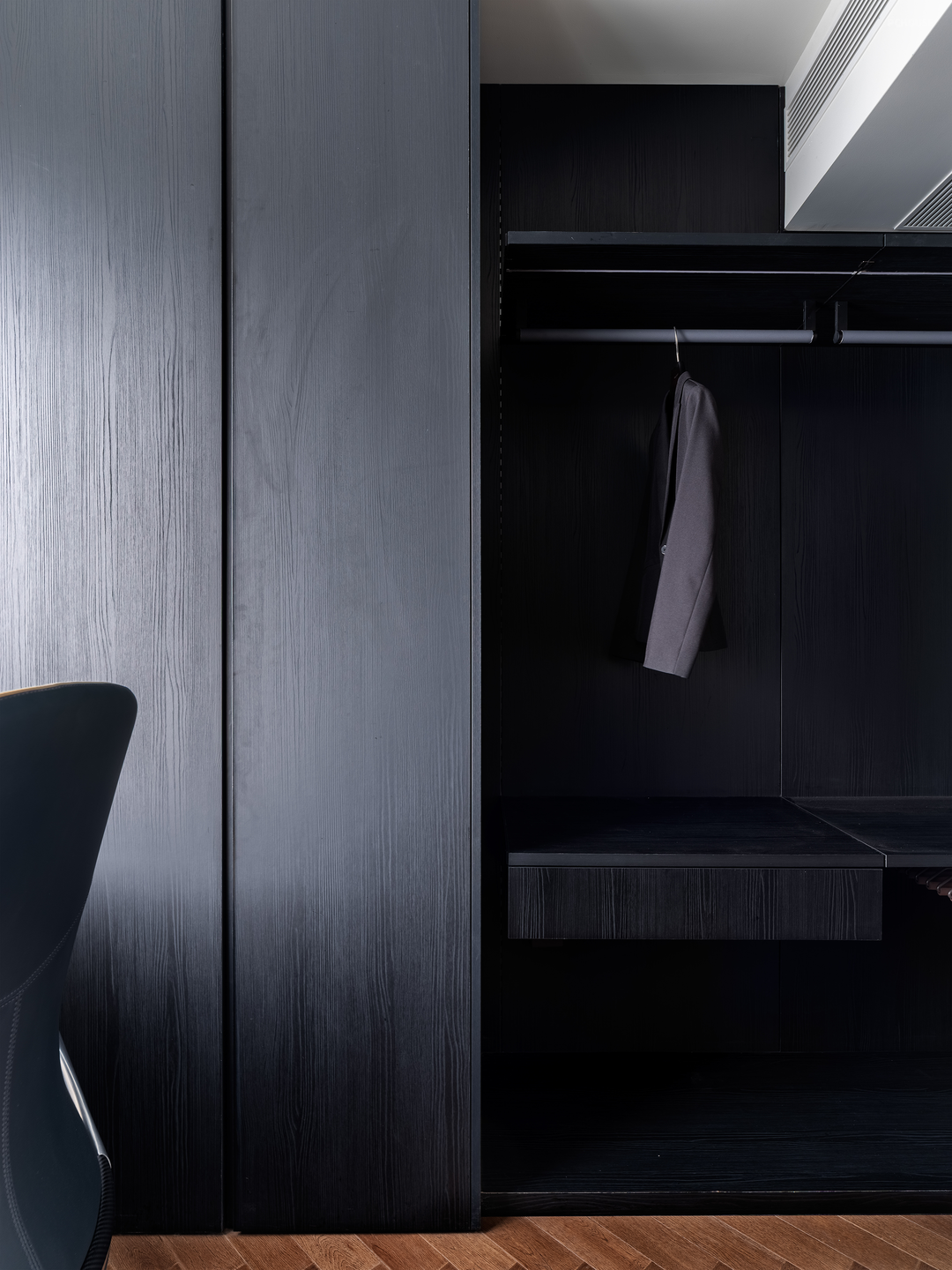 衣帽间分区收纳,一面使用镜柜,增强空间通透感,一面用黑色木纹加强质感,设置挂衣区,可作为净衣区实用。