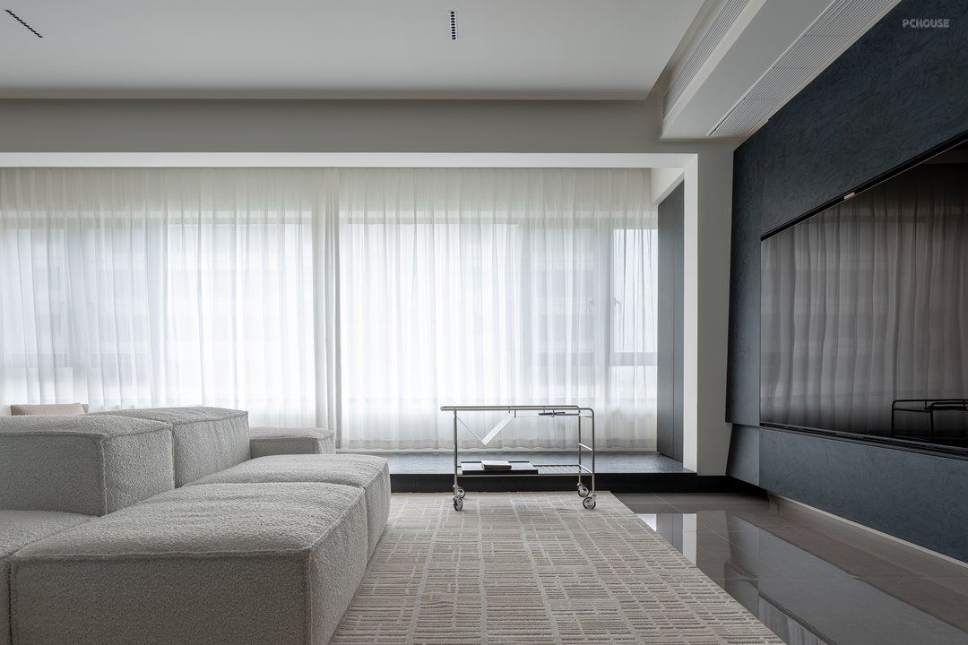 电视背景墙与阳台利用染色木皮统一高度,立面上更为干净利落。木皮由设计师多次到工厂调色得来,形成与这个家最为适配的蓝调。
